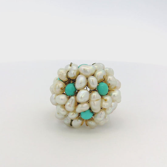 This one-of-a-kind Pearl and Turquoise Cluster Ring is in excellent vintage condition and ready to ship!