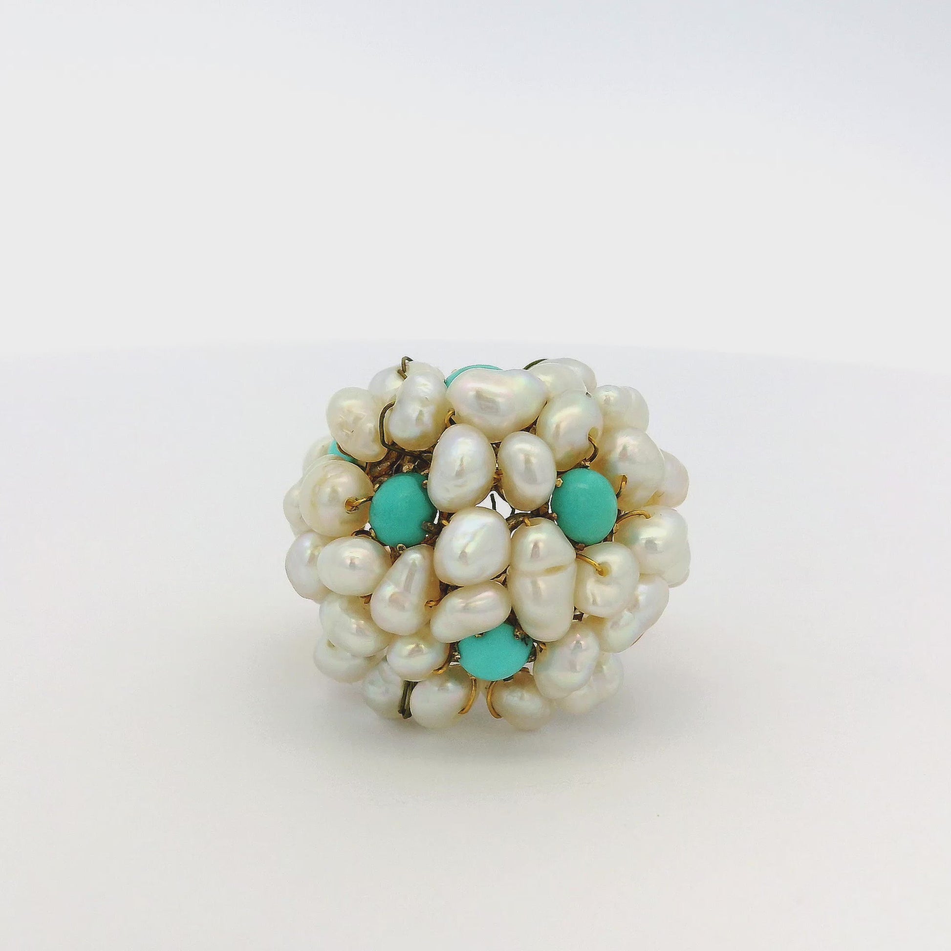 Bursting with character and vintage charm, this 14k and 18k Yellow Gold Cluster Ring is a unique blend of elegance and organic artistry. The dramatic dome setting features an intricate bouquet of natural white pearls intertwined with bright turquoise cabochons, creating a bold floral effect.