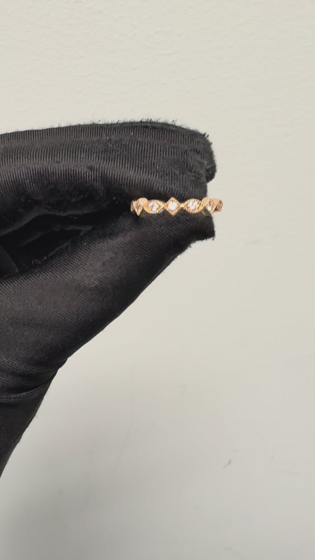 Turn a simple stack into a standout with this rose-gold sparkler. First, warm 14 k rose gold draws the eye; next, a ribbon of natural round diamonds—≈0.20 ctw—adds crisp flashes of white that play beautifully against the blush-toned metal.