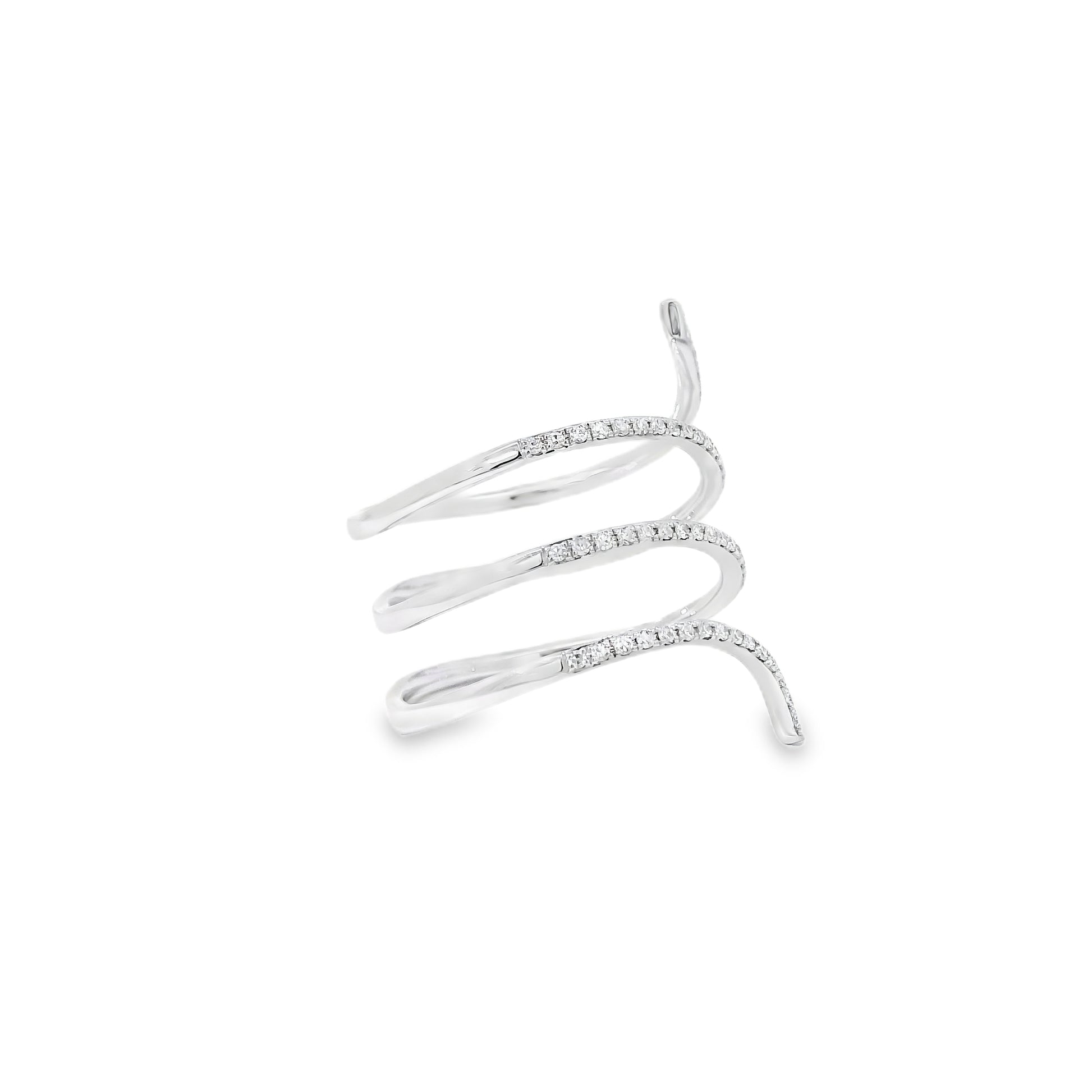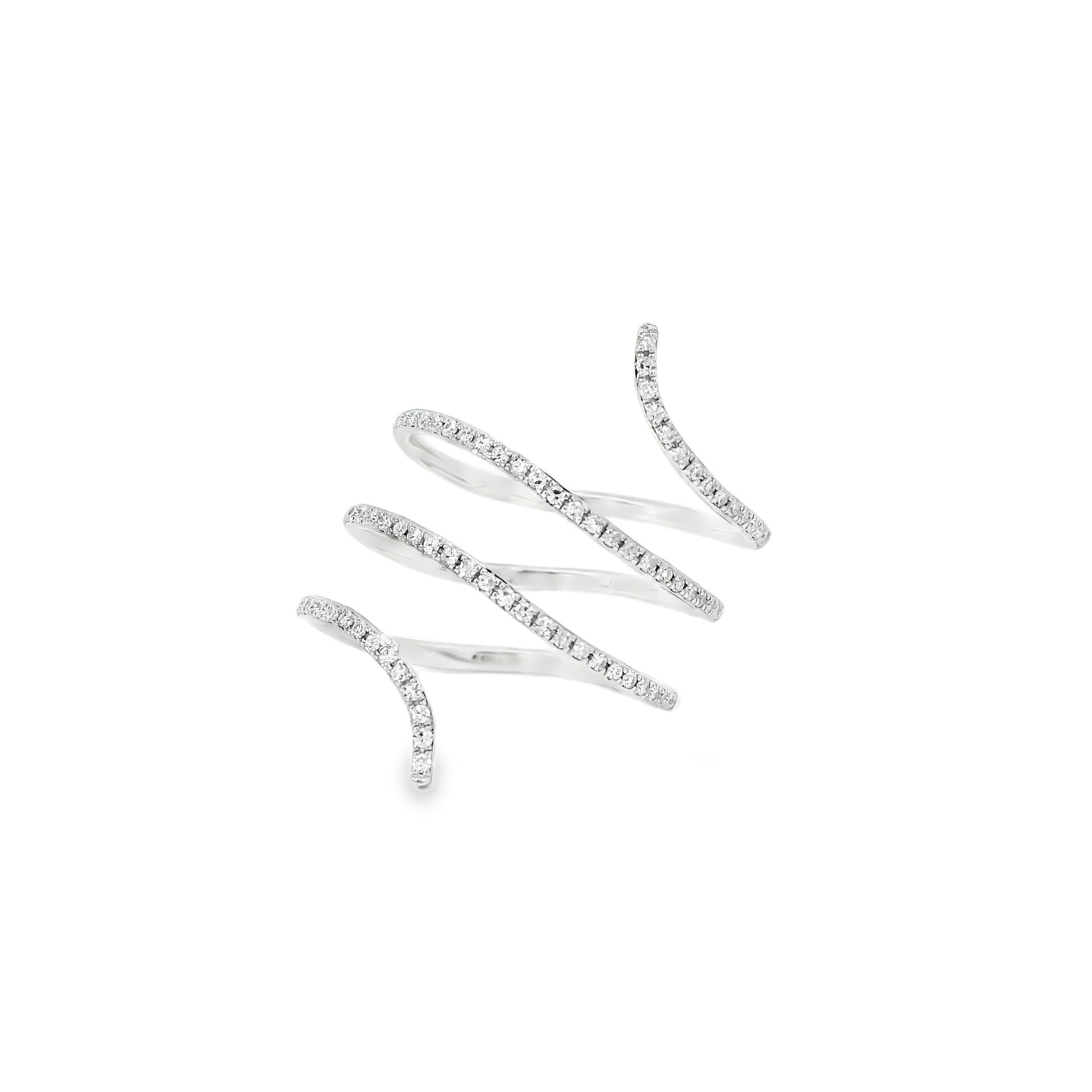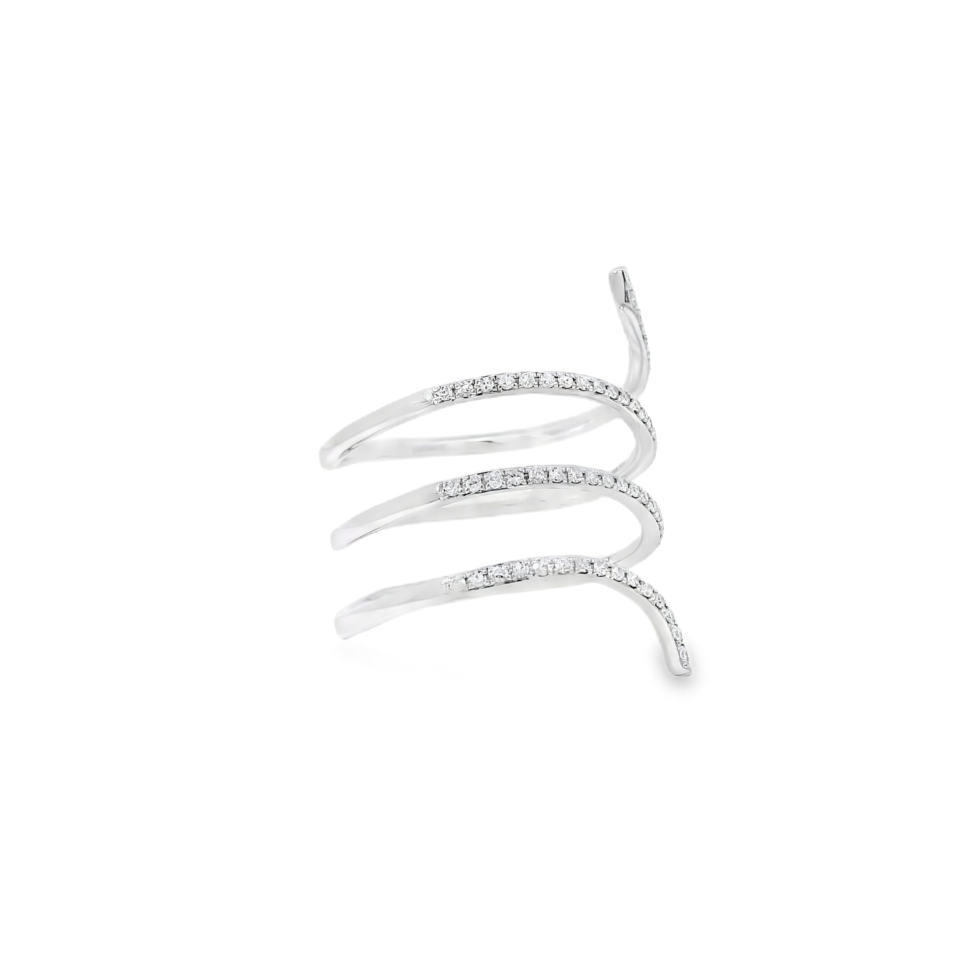 The wrap-style silhouette gives this ring a modern and sophisticated look, making it a beautiful choice for both everyday wear and special occasions. Its polished white gold setting enhances the brilliance of the diamonds, while the delicate arrangement of the stones adds texture, dimension, and eye-catching sparkle.