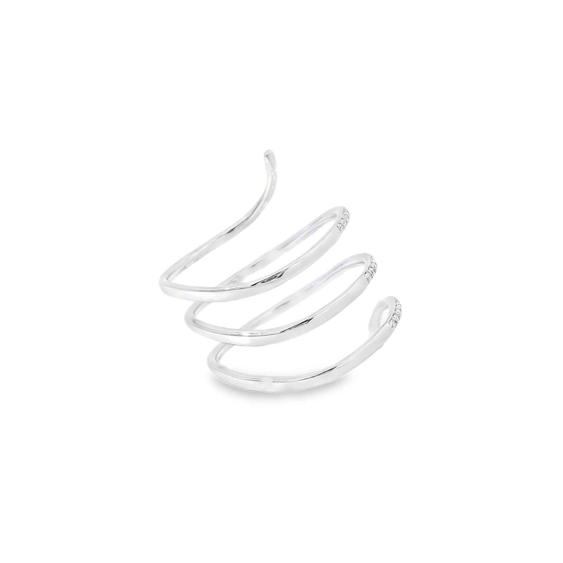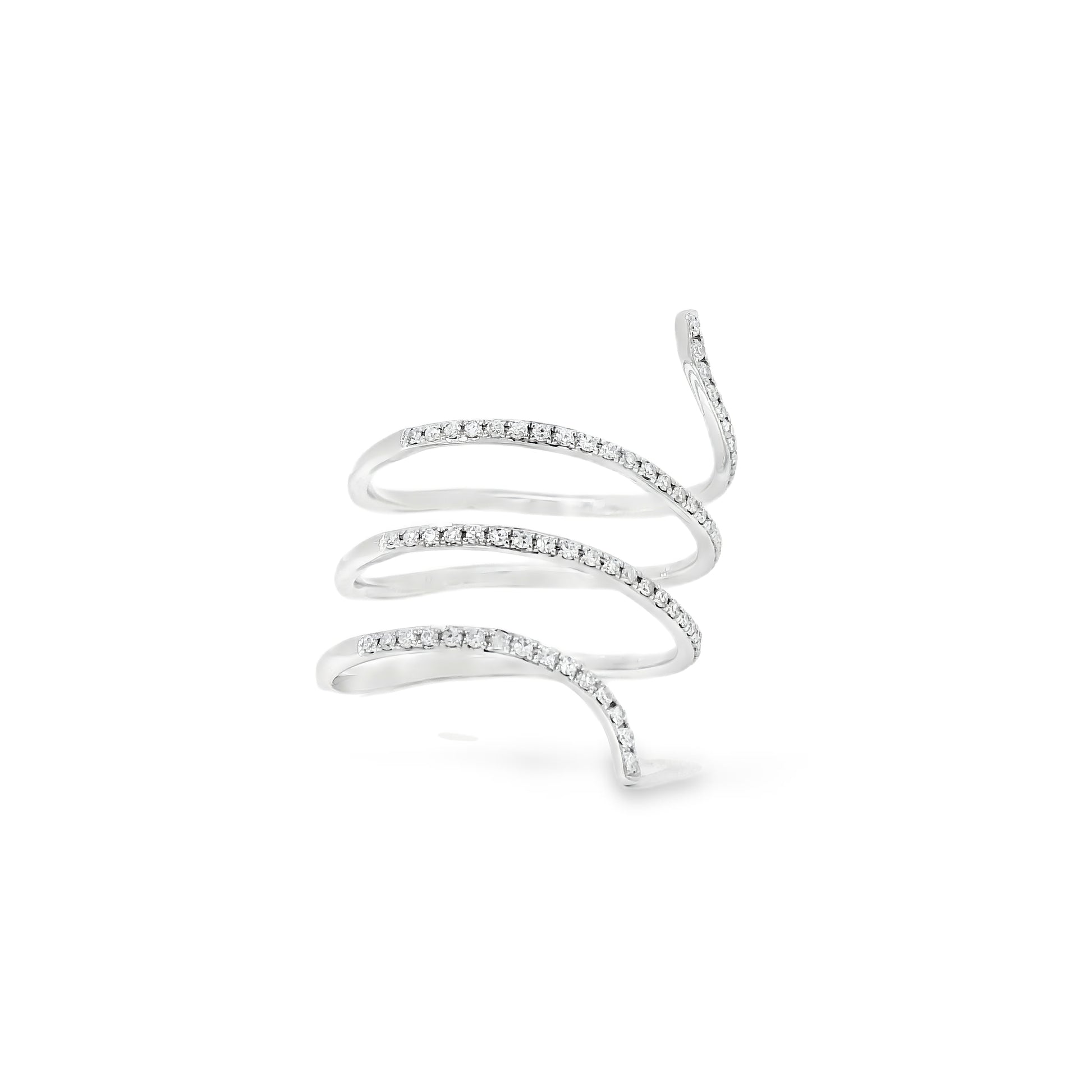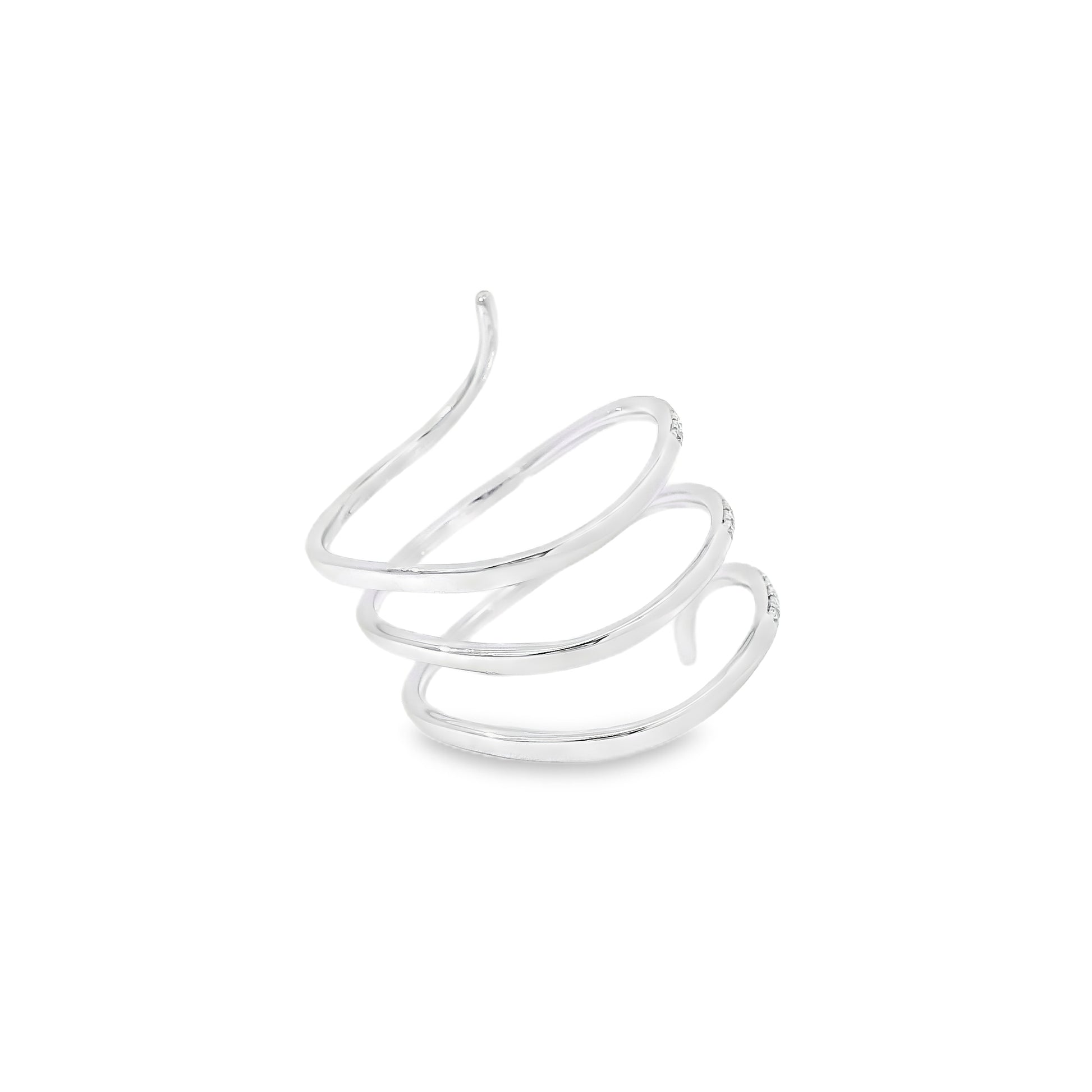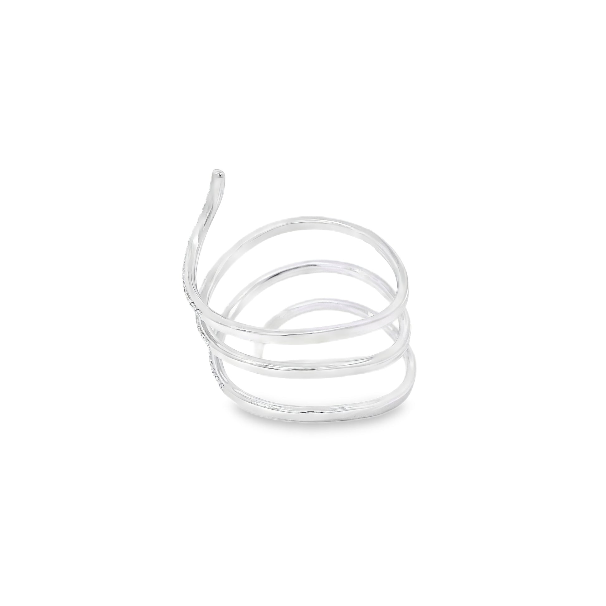 The wrap-style silhouette gives this ring a modern and sophisticated look, making it a beautiful choice for both everyday wear and special occasions. Its polished white gold setting enhances the brilliance of the diamonds, while the delicate arrangement of the stones adds texture, dimension, and eye-catching sparkle.