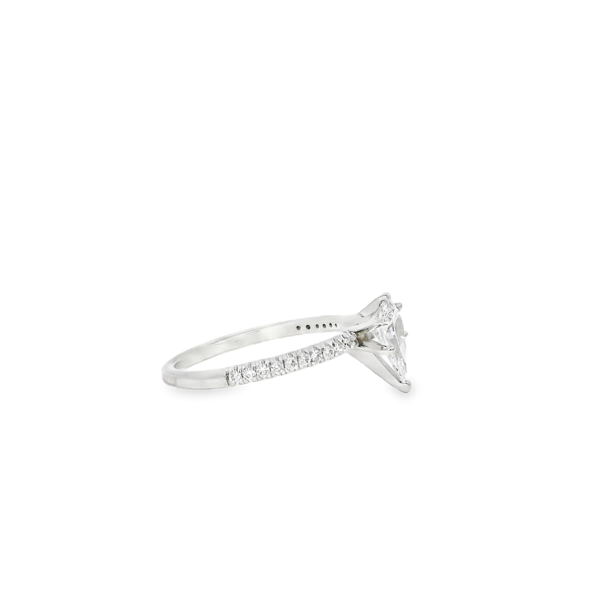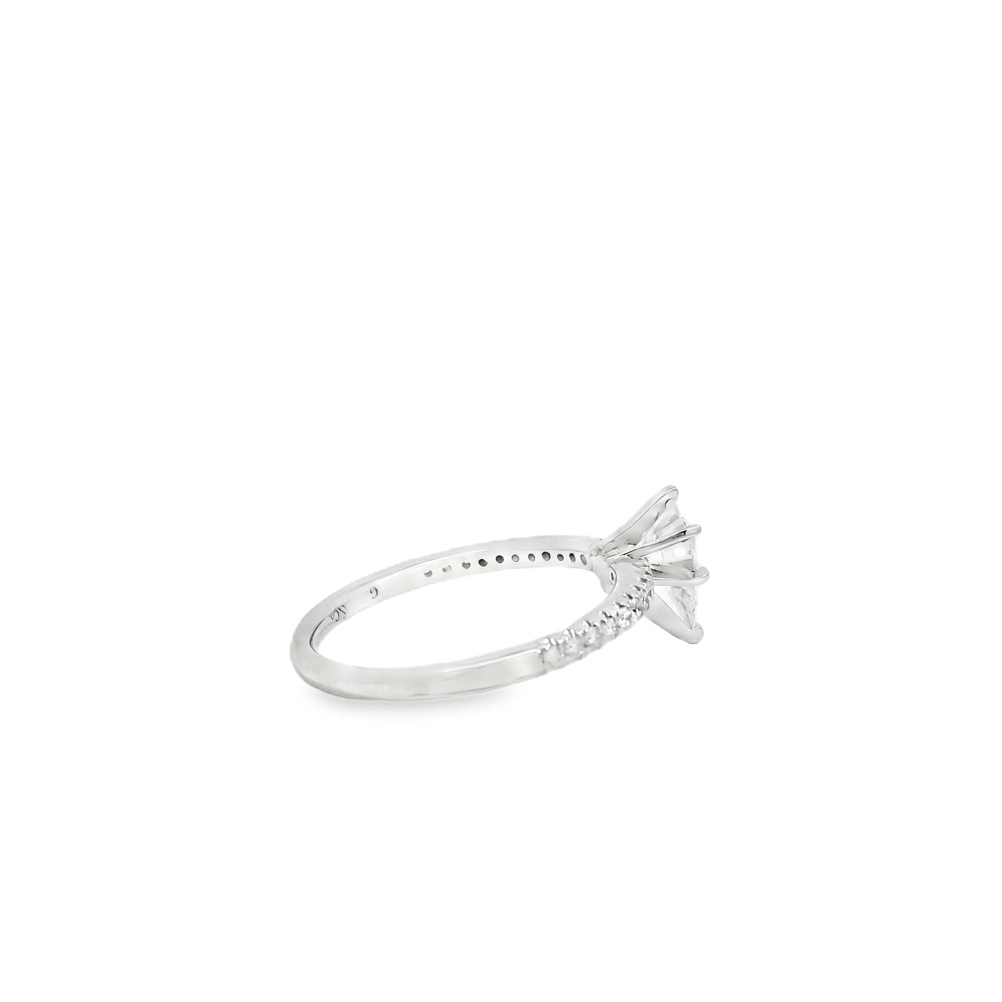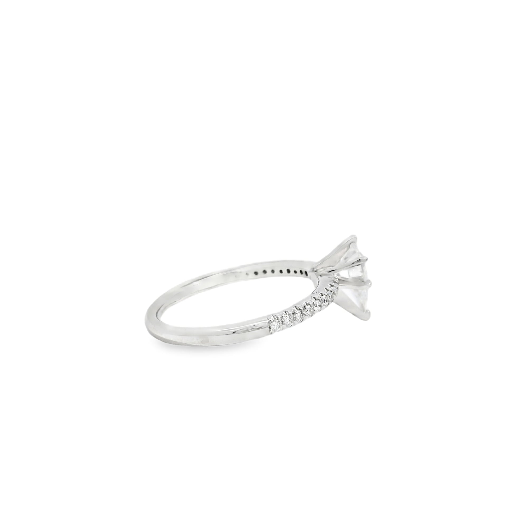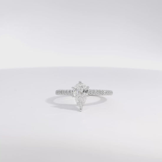 This exquisite engagement ring features a dazzling 0.70-carat natural pear cut diamond, certified by GIA and selected for its radiant beauty. Graded E in color and SI1 in clarity, the center stone offers exceptional brightness and stunning visual appeal—capturing light effortlessly for a graceful, eye-catching sparkle.