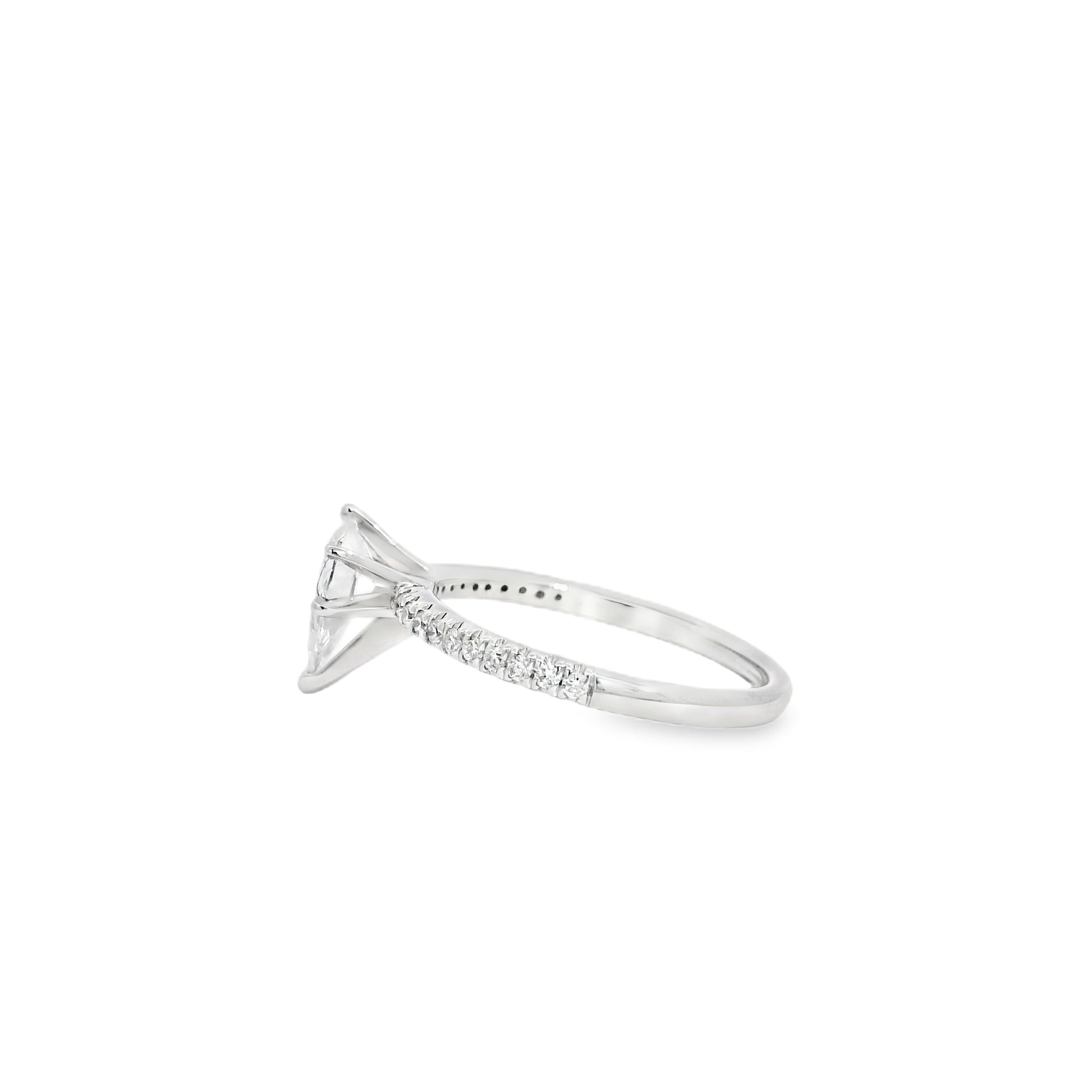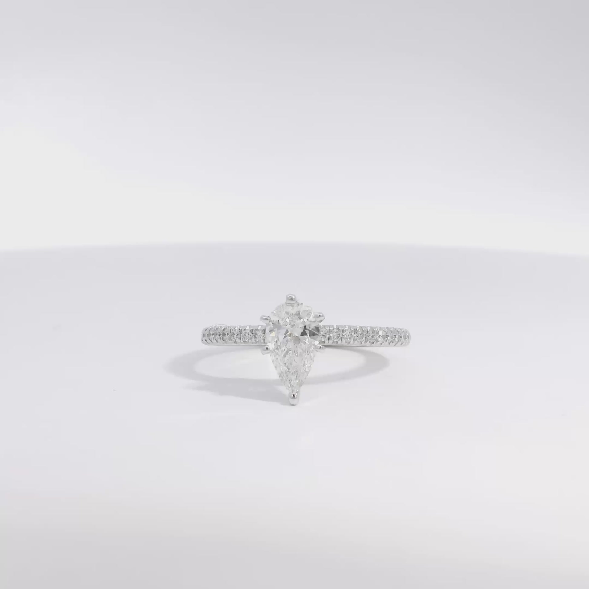 Expertly crafted in 14k white gold, the sleek, polished setting complements the diamond’s romantic pear shape, enhancing its fluid lines and timeless elegance. The design blends classic sophistication with modern charm, ensuring the diamond remains the captivating focal point.