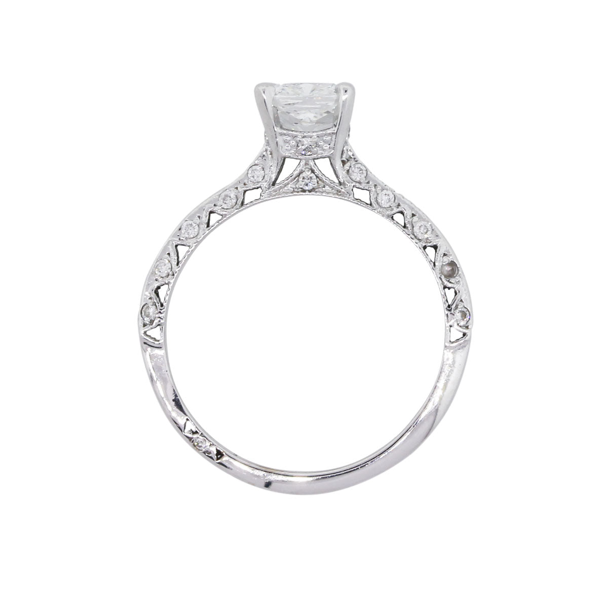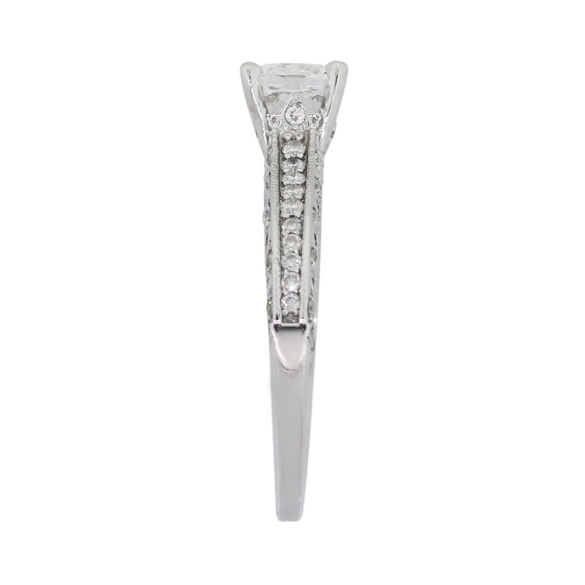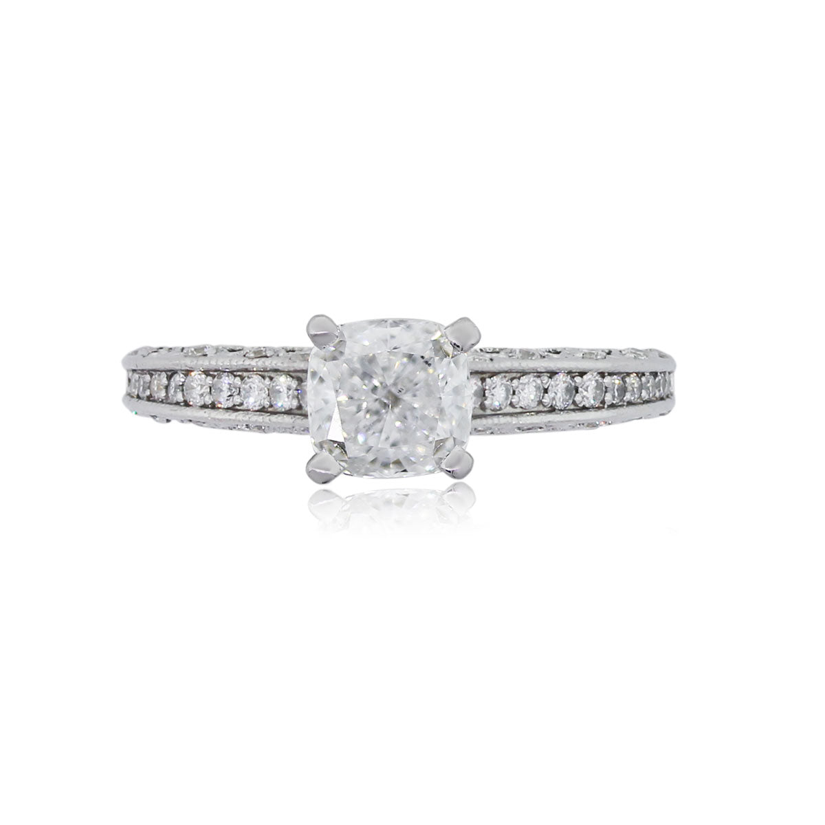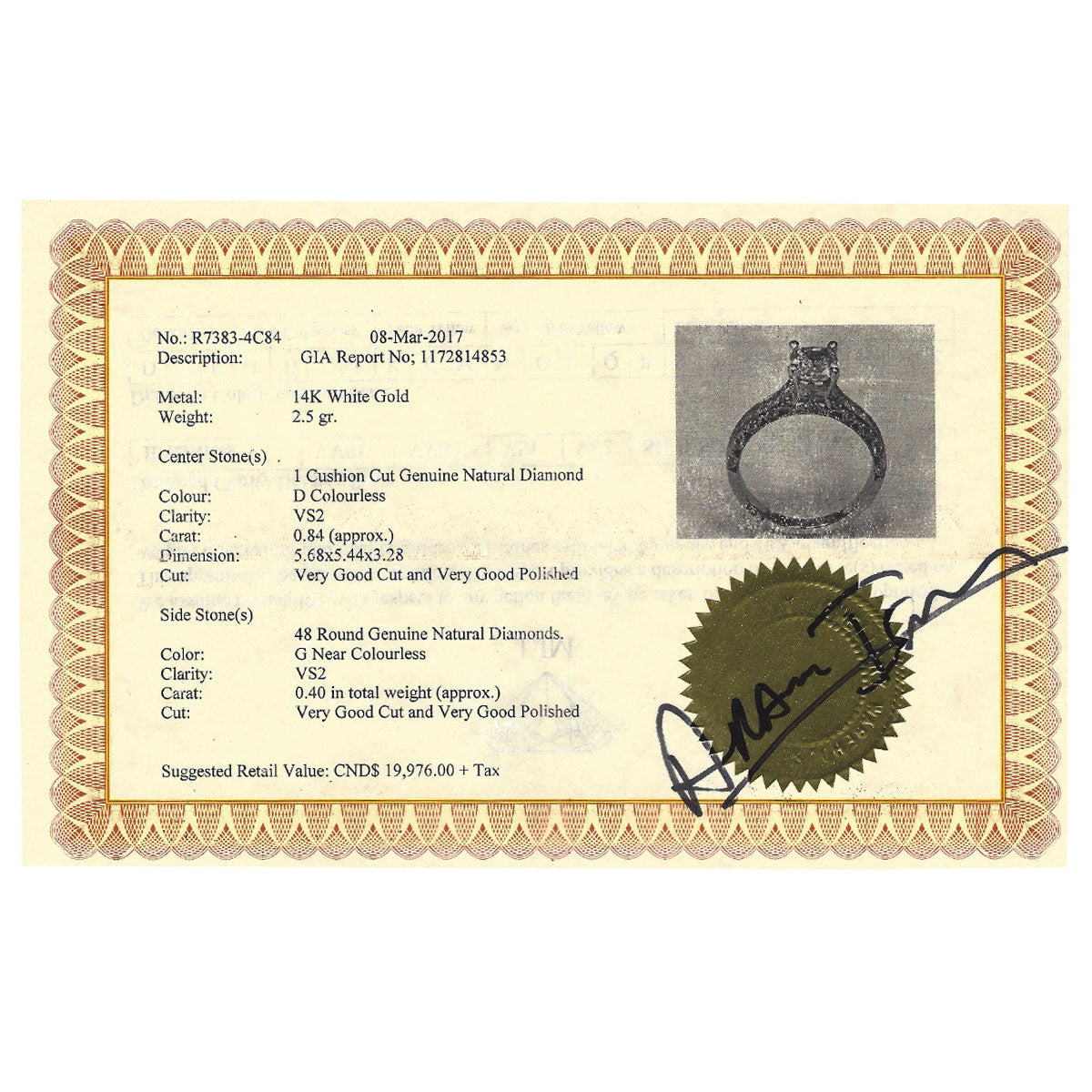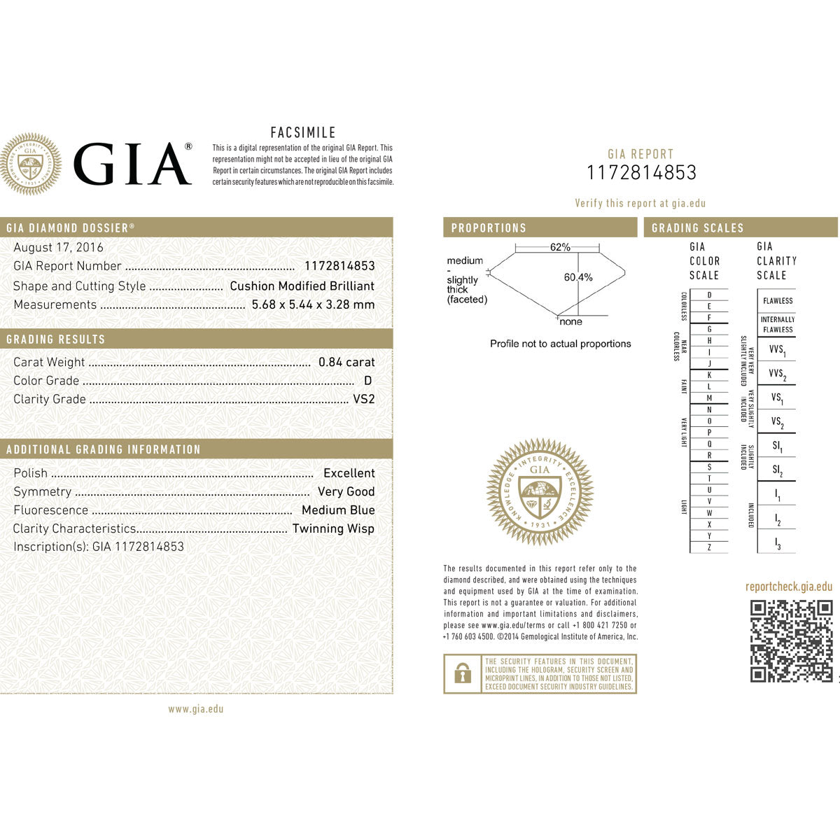 The engagement ring features a GIA certified 0.84ct cushion cut diamond. The center diamond is D in color and VS2 in clarity. The mounting includes approximately 0.50ctw of round brilliant diamonds, graded G in color and VS2 in clarity. |