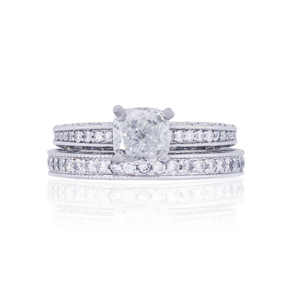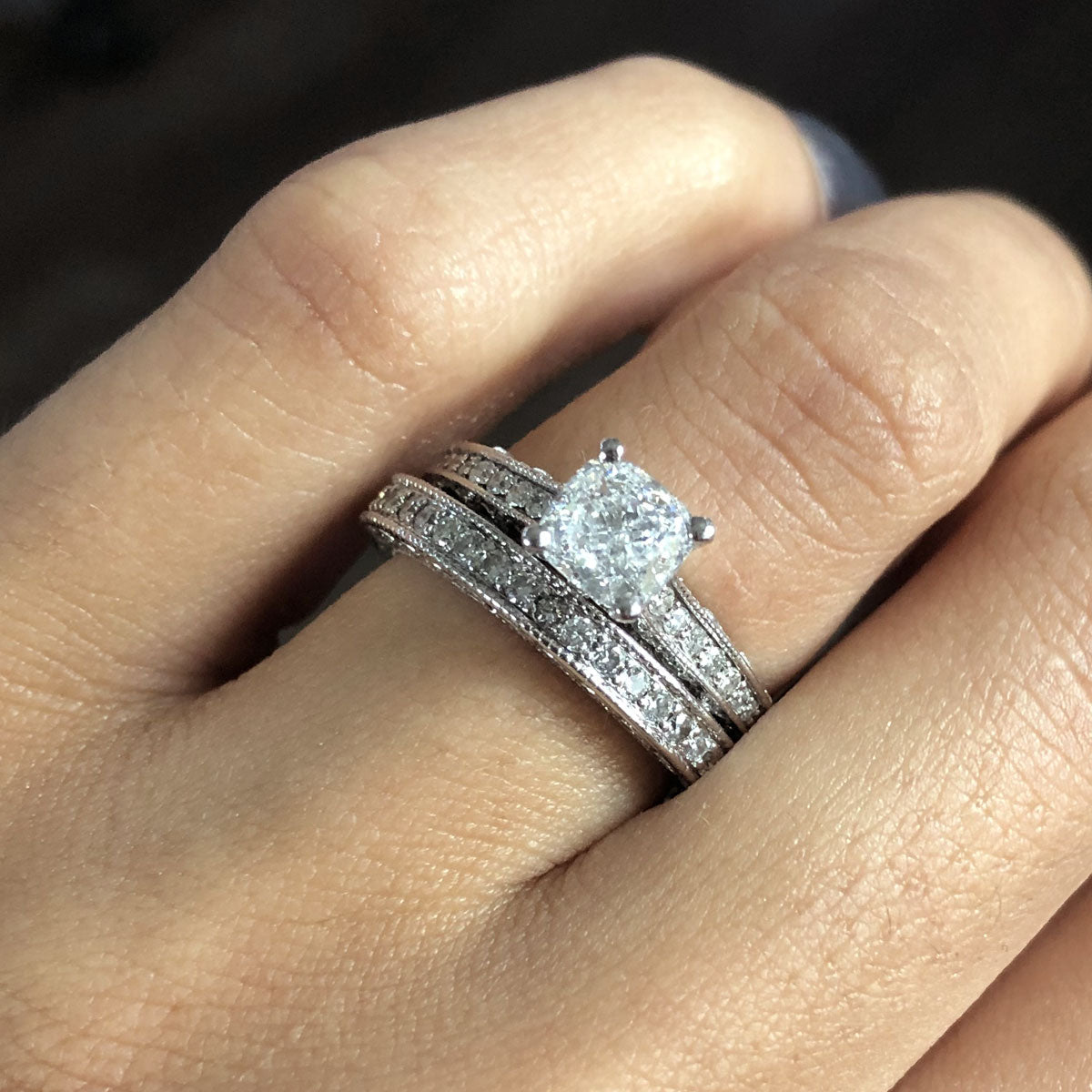 14k White Gold 0.84ct GIA Certified Cushion Cut Engagement Diamond Ring and AGL Certified Diamond Wedding Band Set