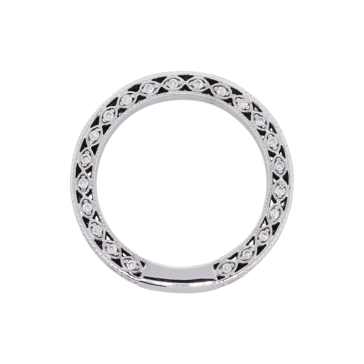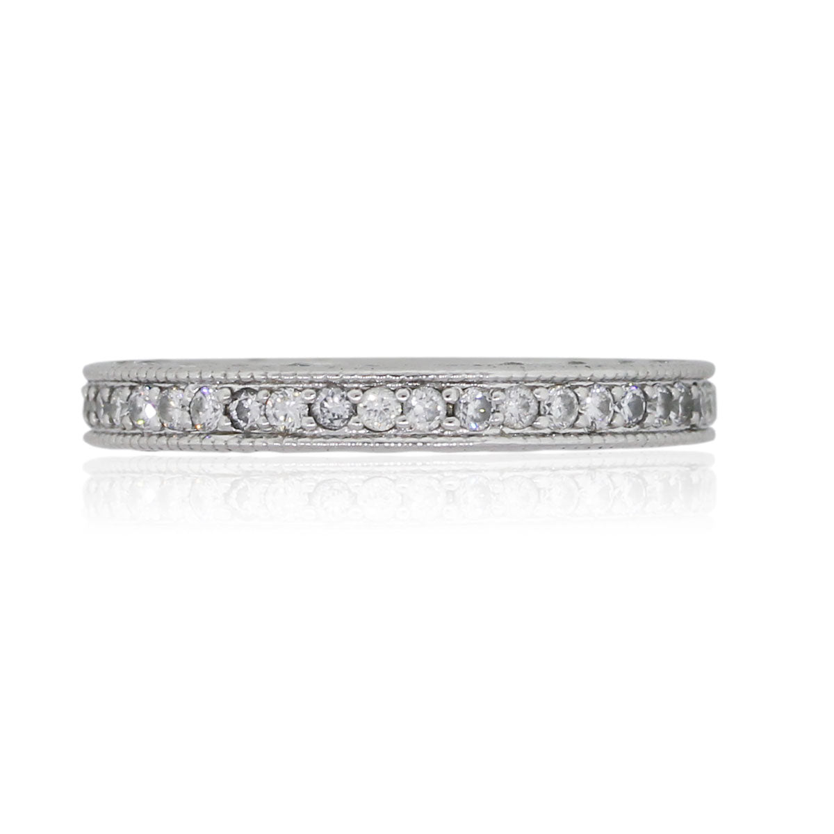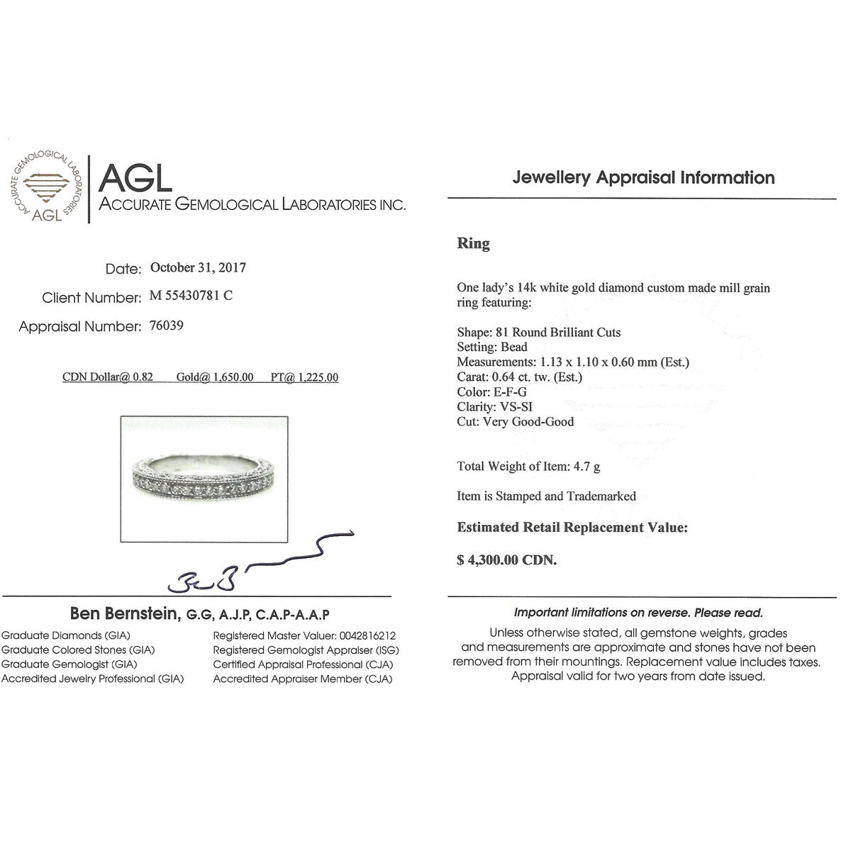 The matching band includes approximately 0.64ctw of round brilliant diamonds, AGL certified. The diamonds are E-F-G in color and VS-SI in clarity. |