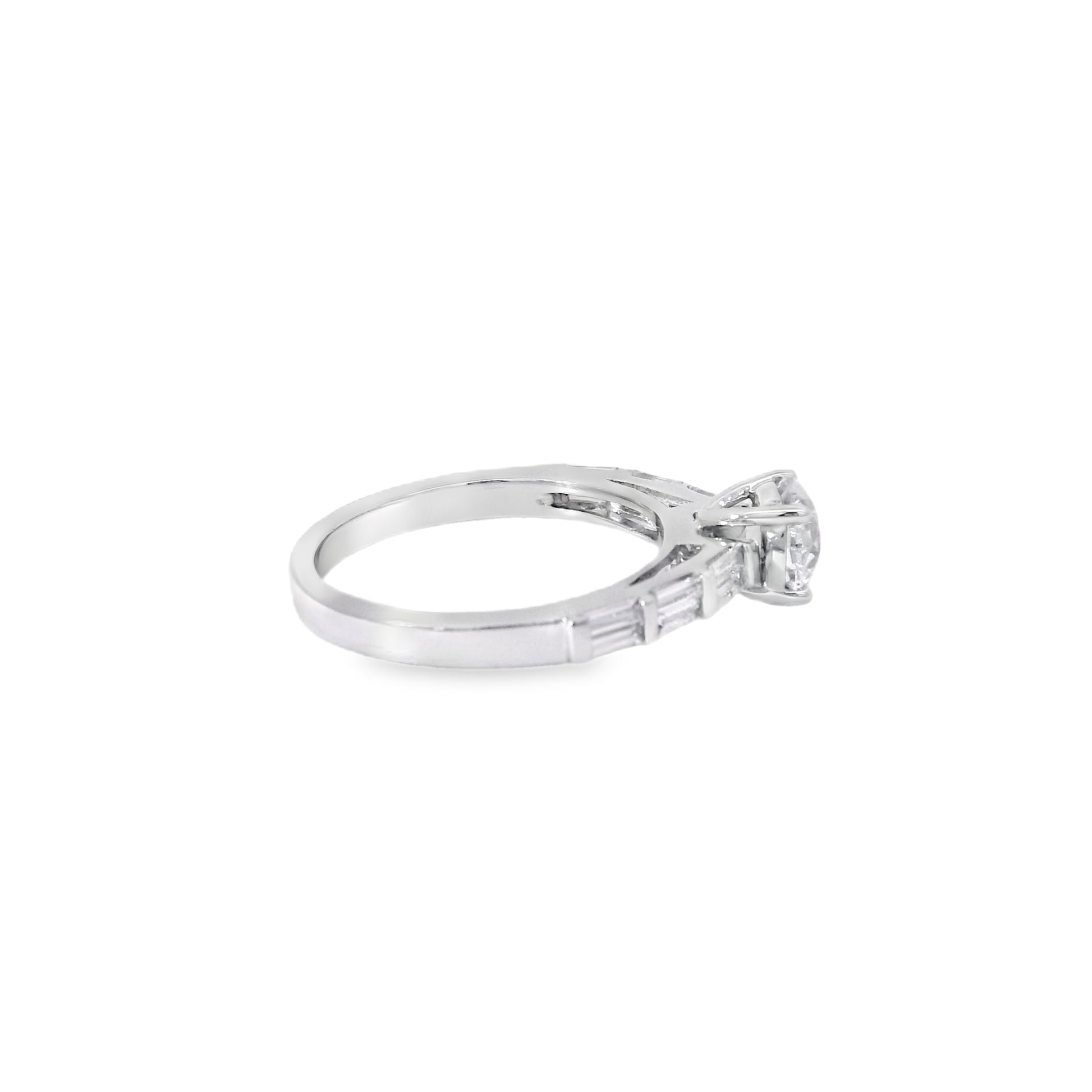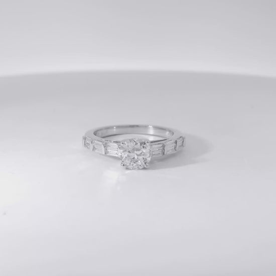 The sleek baguette diamonds create clean, sophisticated lines, while the surrounding round brilliant diamonds enhance the ring with exceptional fire and shimmer. The combination of diamond cuts offers a harmonious contrast, delivering both modern refinement and classic appeal.