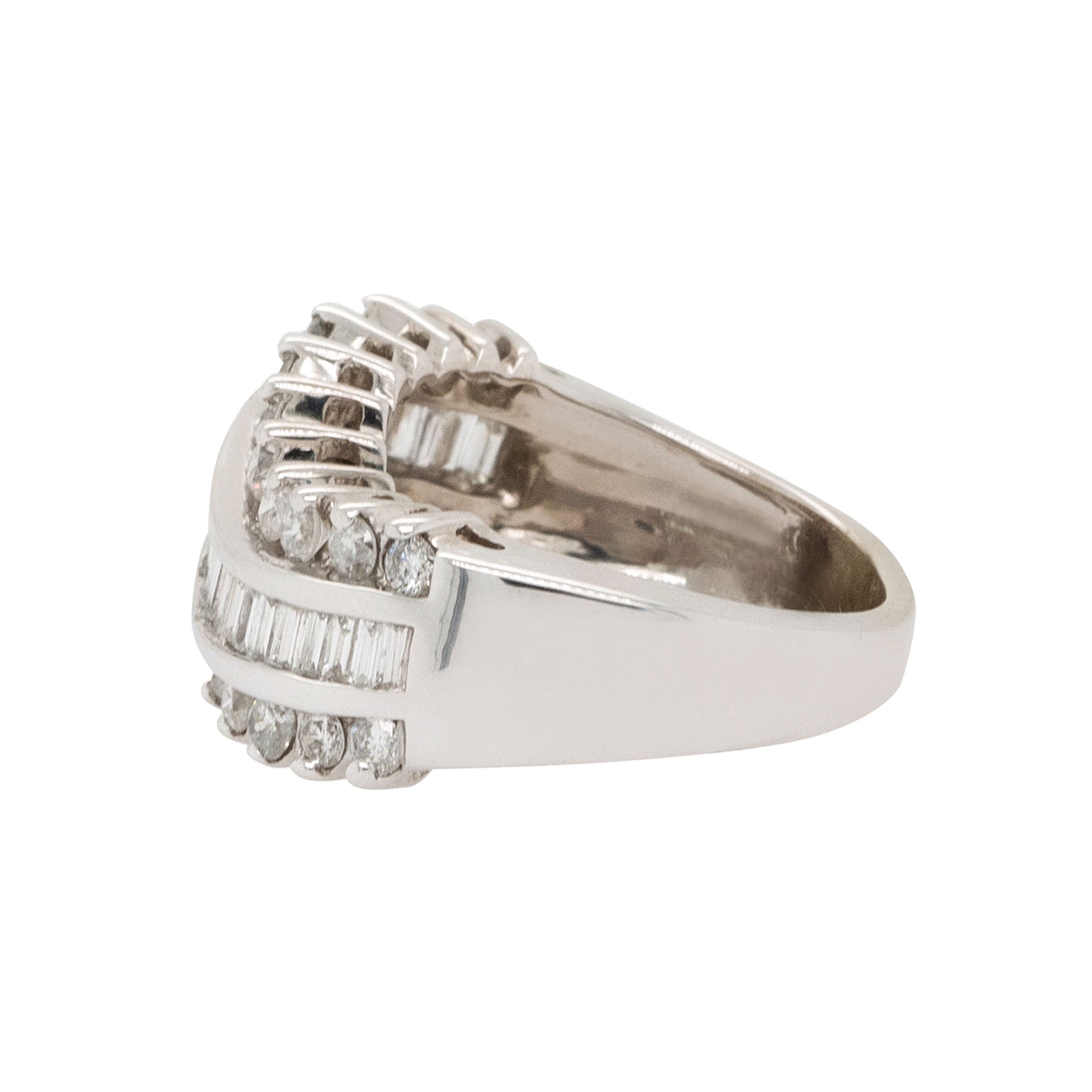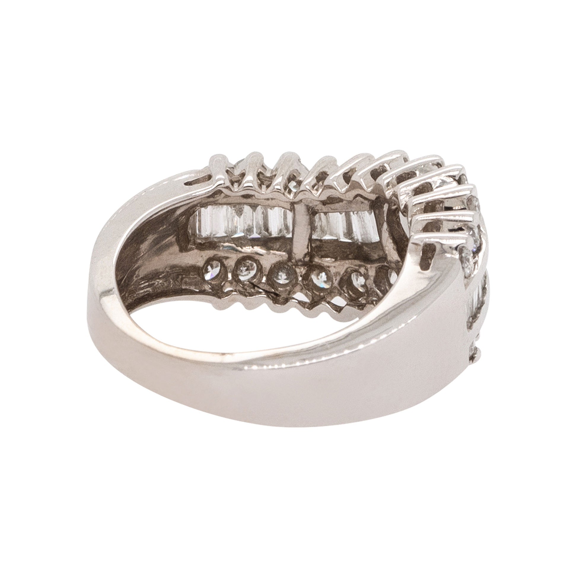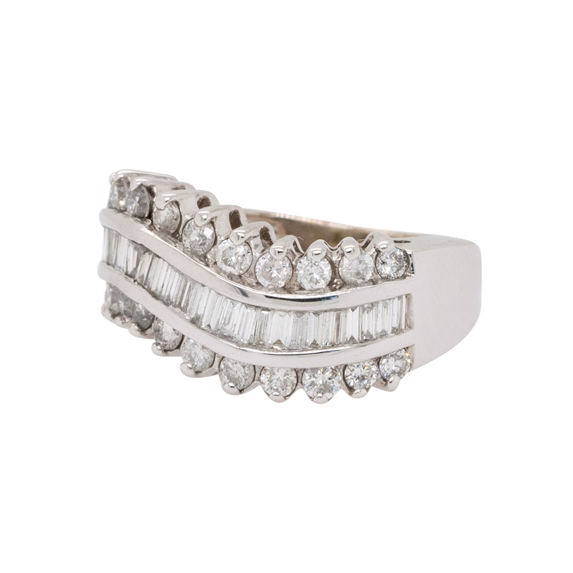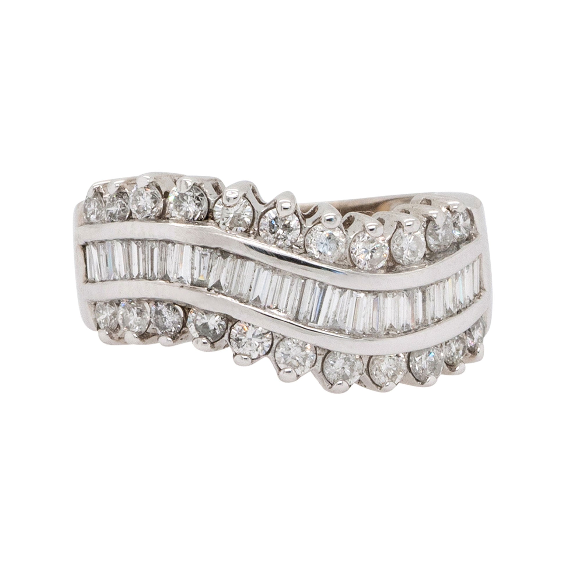 | Diamond Details | Features approximately 1.30 carats total weight of round and baguette cut diamonds. The diamonds are G/H in color and VS in clarity, channel set in an elegant wave design. |