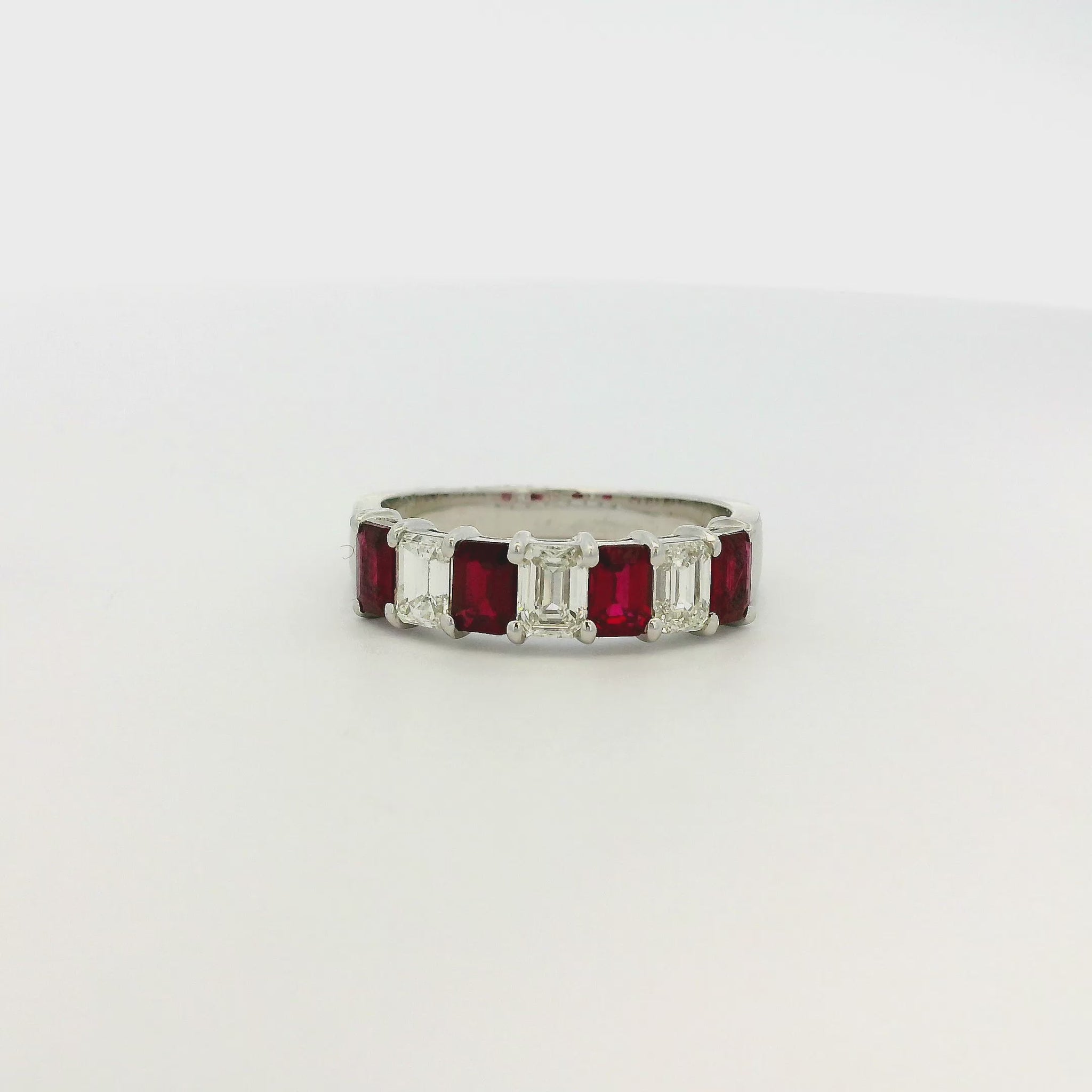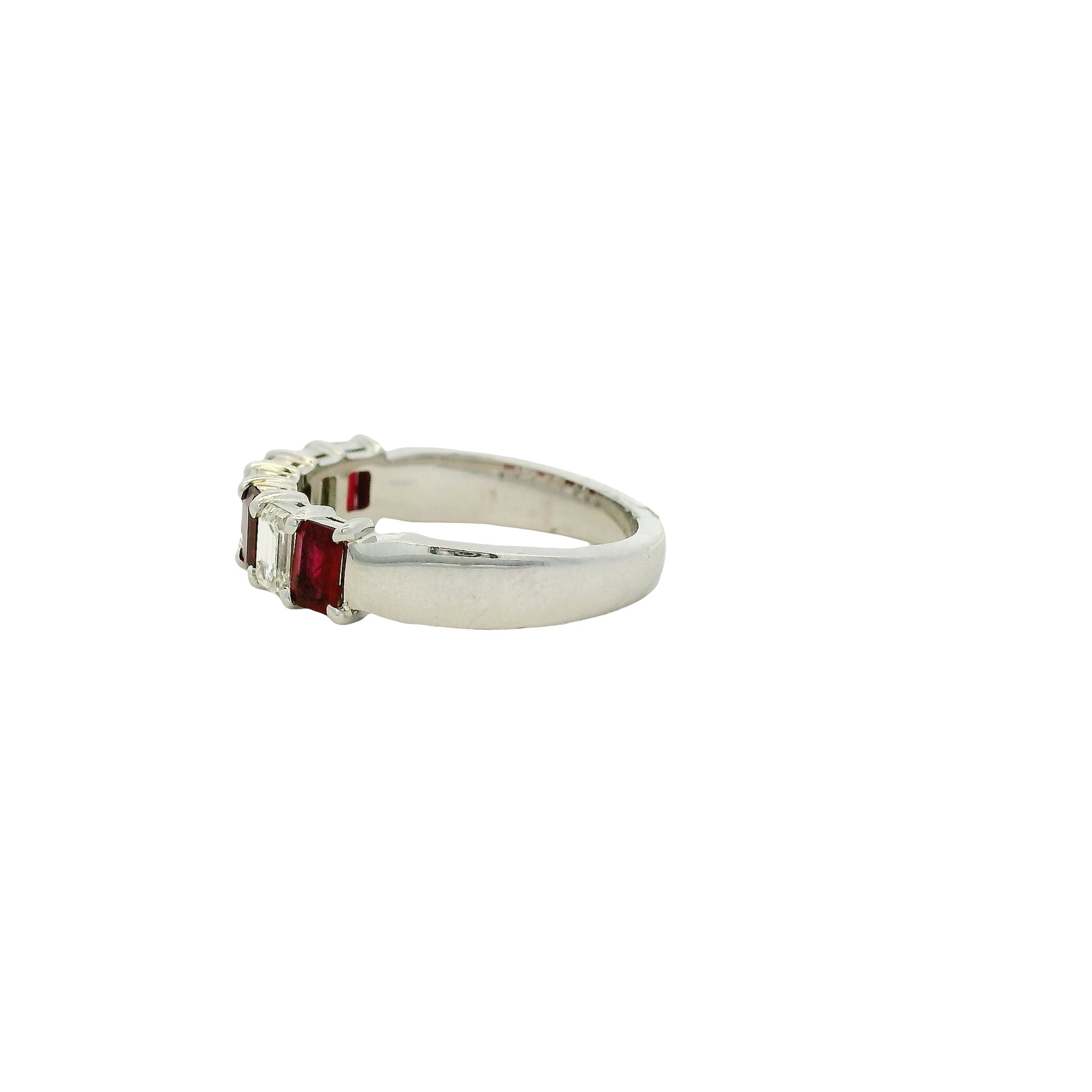 This stunning 14k White Gold 1.65ctw Natural Emerald Cut Diamond and Ruby Ring perfectly blends vibrant color with elegant sparkle.