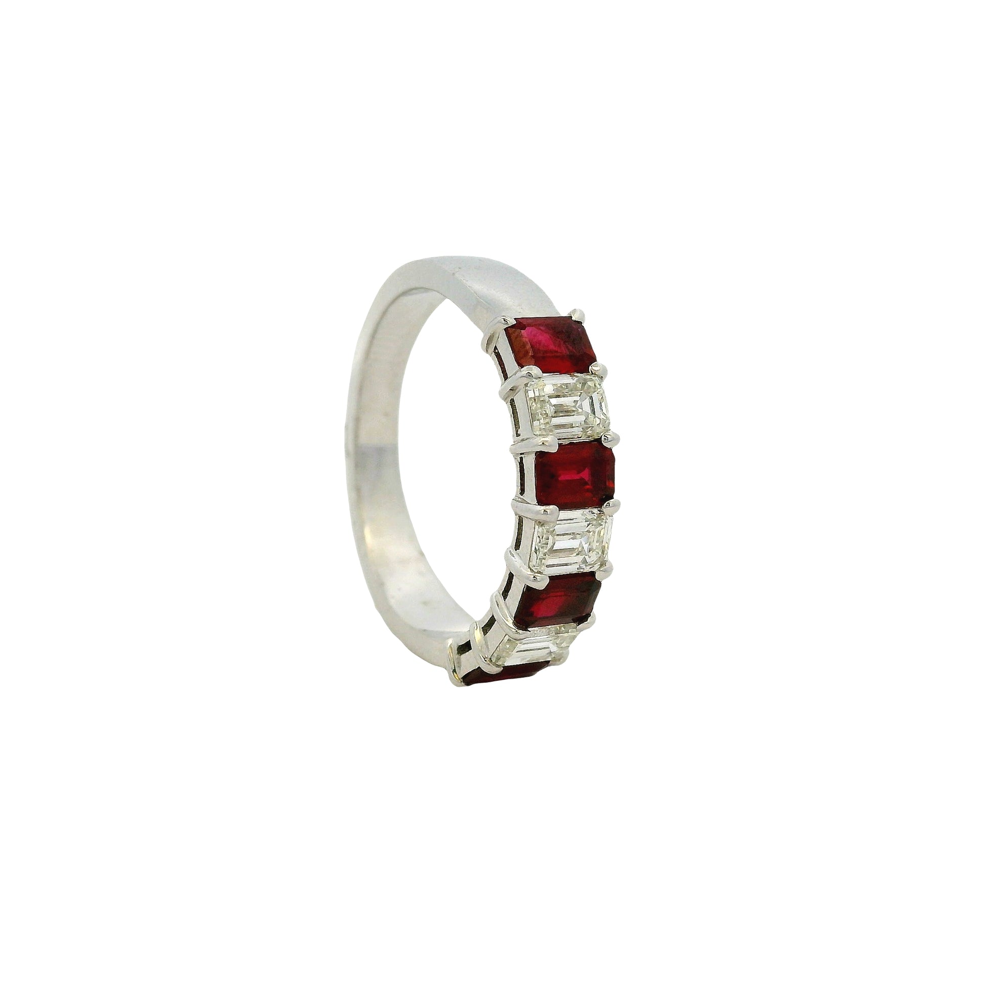 It showcases 4 mesmerizing ruby stones totaling and pairs them with 3 natural emerald cut diamonds. As a result, the ring radiates sophistication.