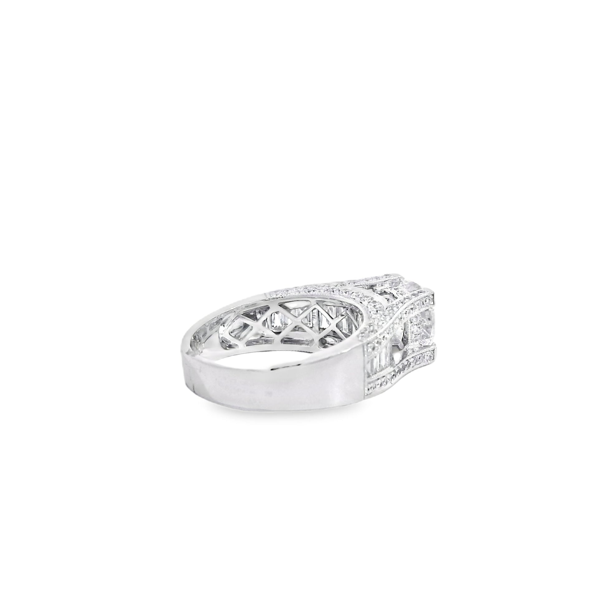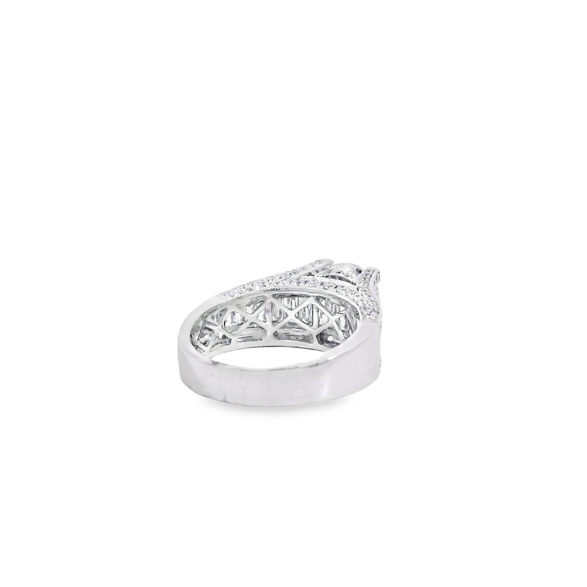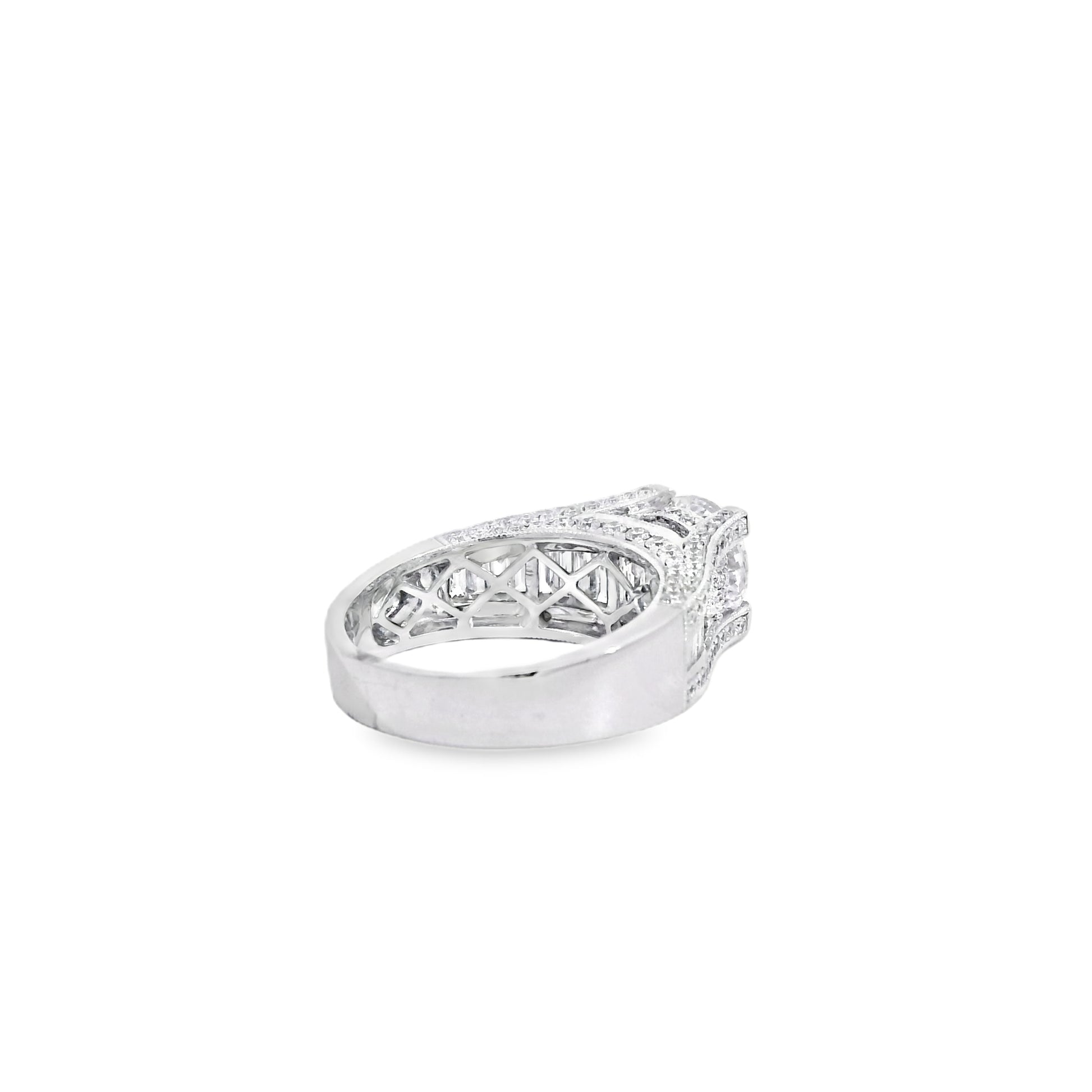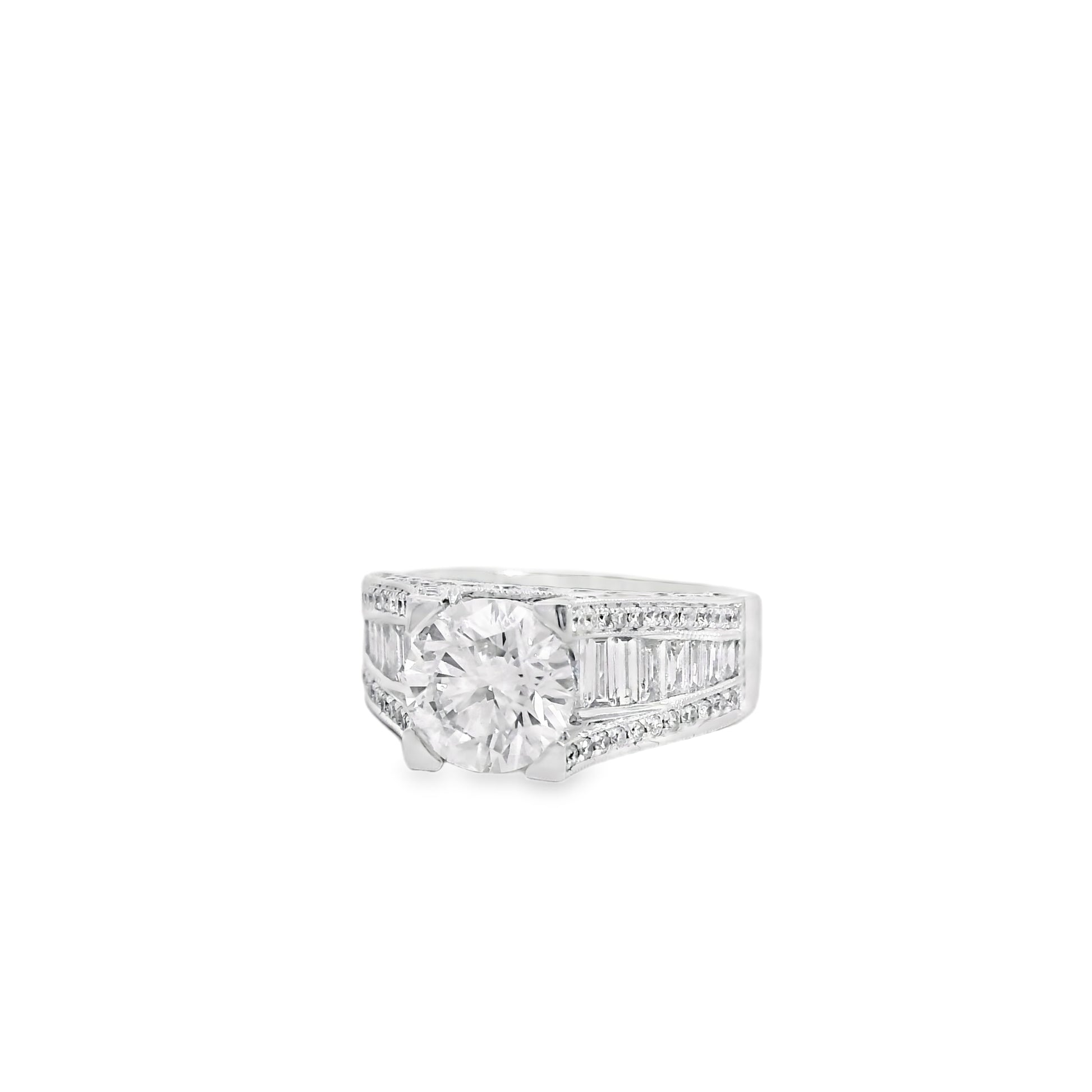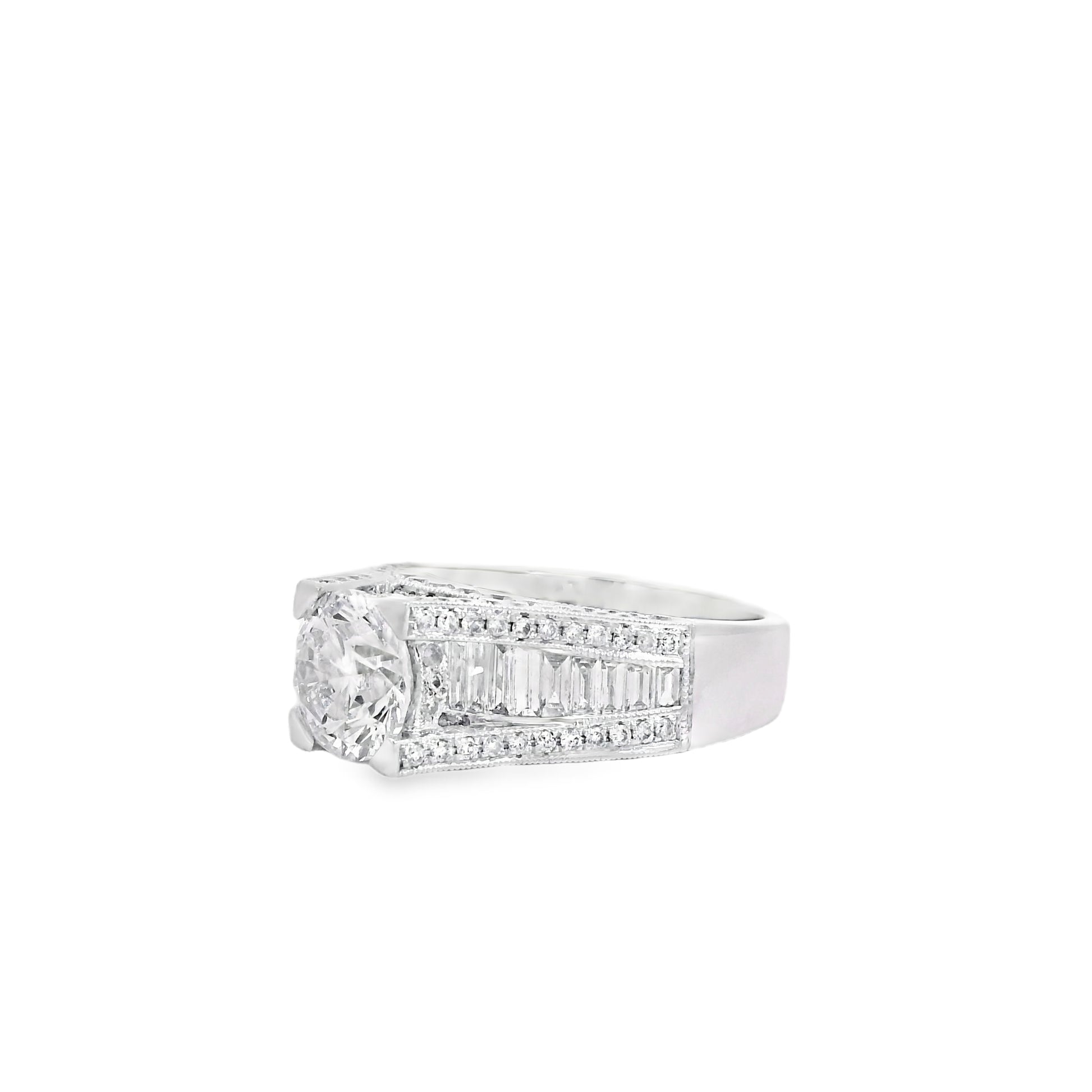 This engagement ring is crafted in radiant 14k white gold and showcases a stunning 1.67 carat round brilliant center diamond that commands attention with exceptional sparkle. The center stone is beautifully framed by an elegant combination of round brilliant and baguette cut diamonds totaling approximately 1.59 carats creating depth refined brilliance and timeless sophistication. Designed with graceful proportions and a substantial yet comfortable feel this ring is a striking symbol of love and commitment.