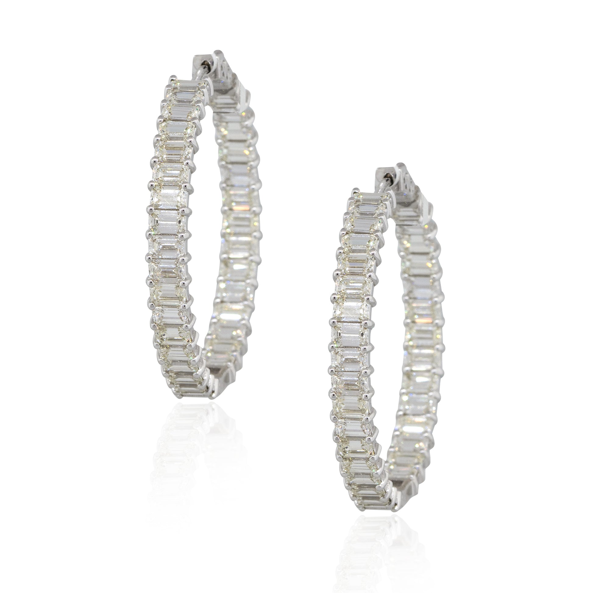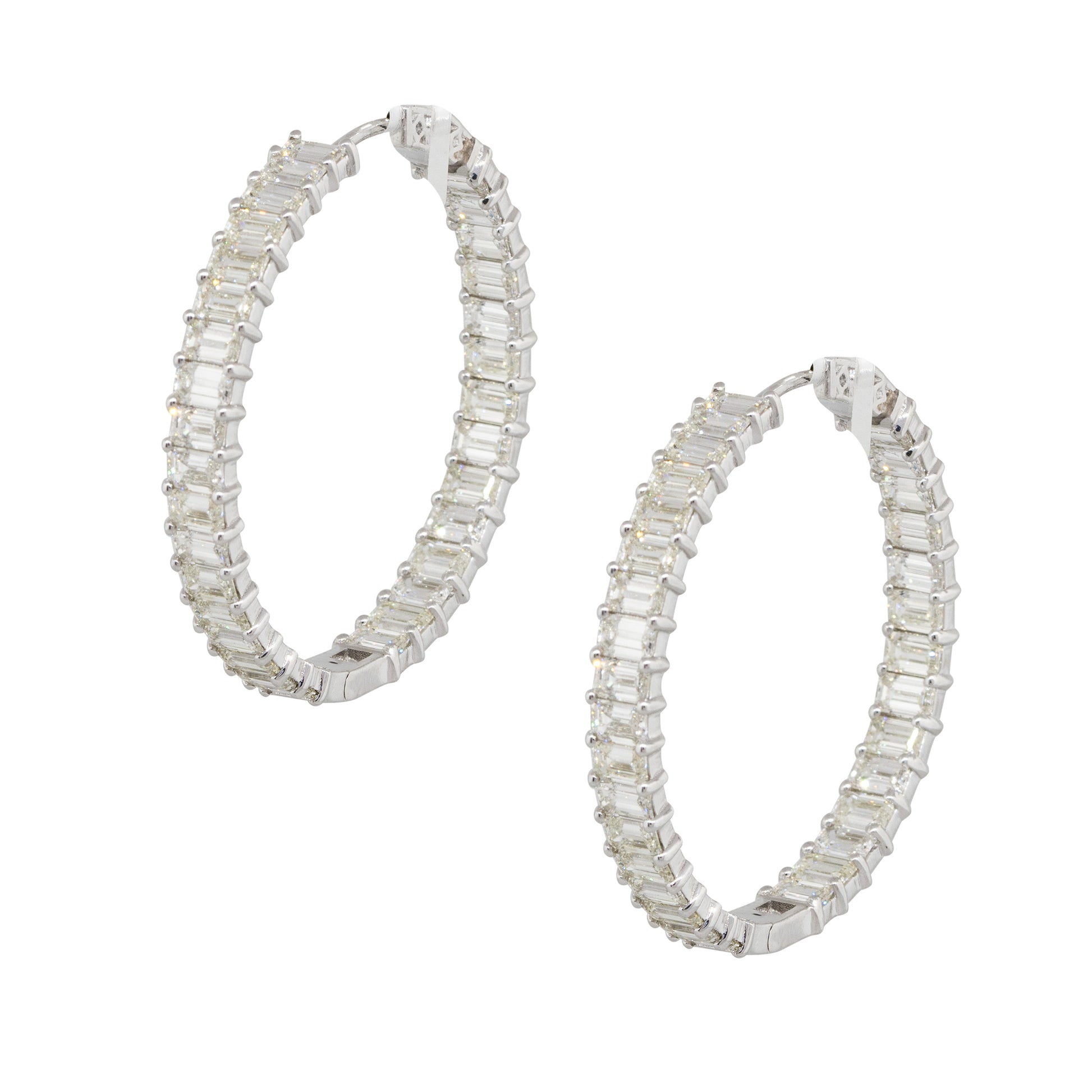 Elevate your fine jewelry collection with these spectacular inside-out hoop earrings featuring an incredible 11.75 carats of baguette cut diamonds. Crafted in gleaming 14k white gold, the stones line both the outer front and inner back curves—ensuring maximum brilliance from every angle.