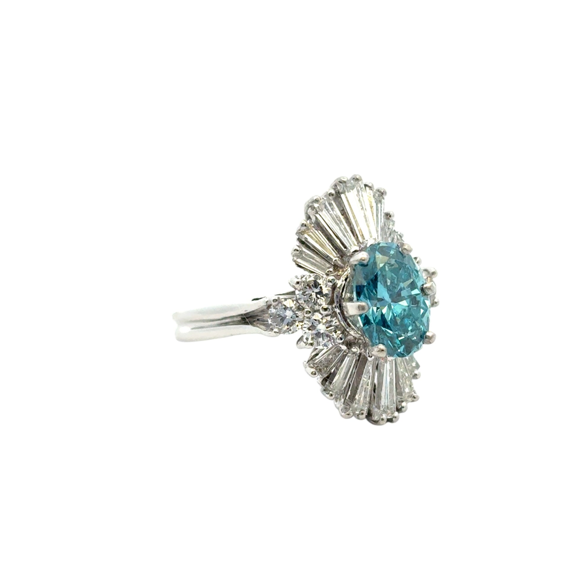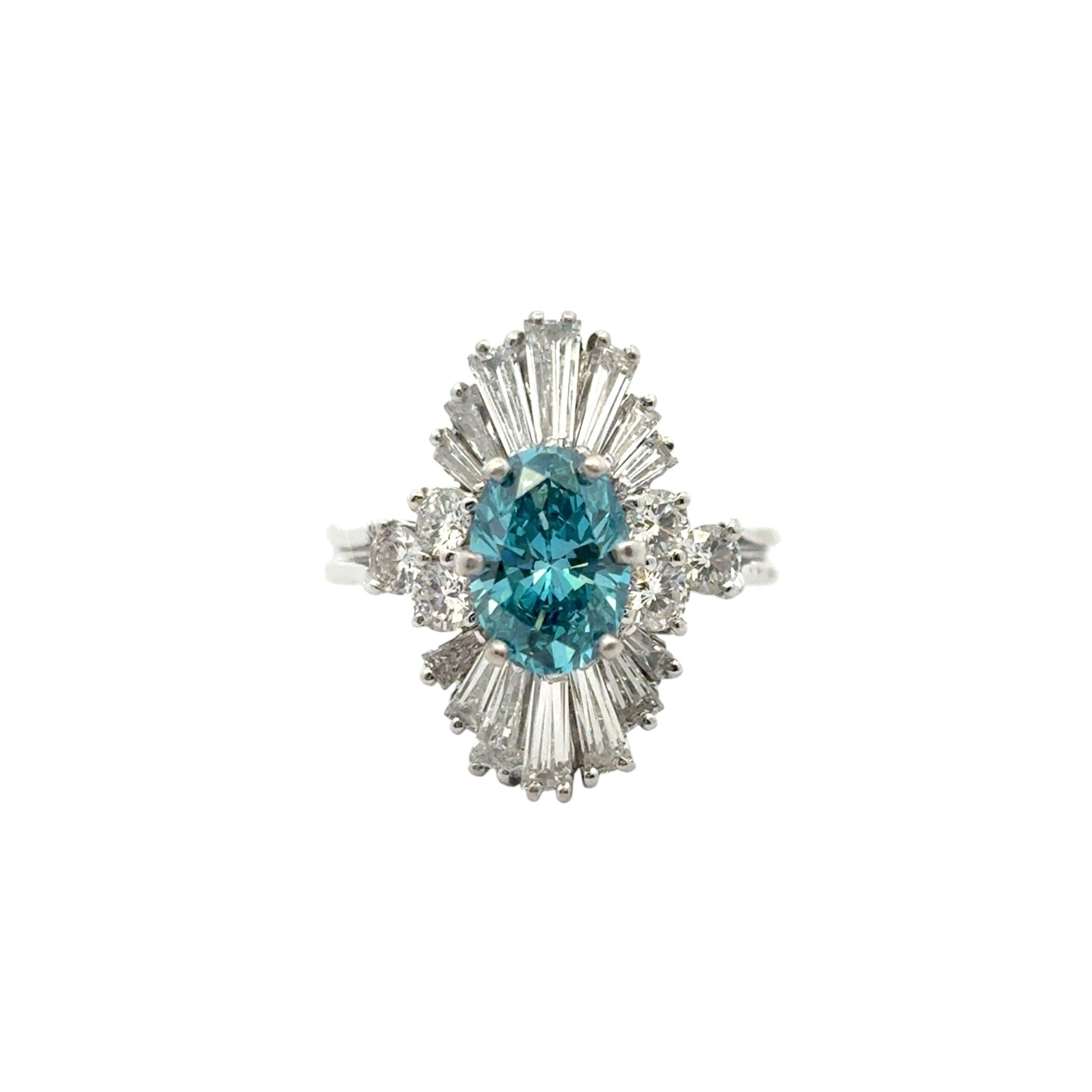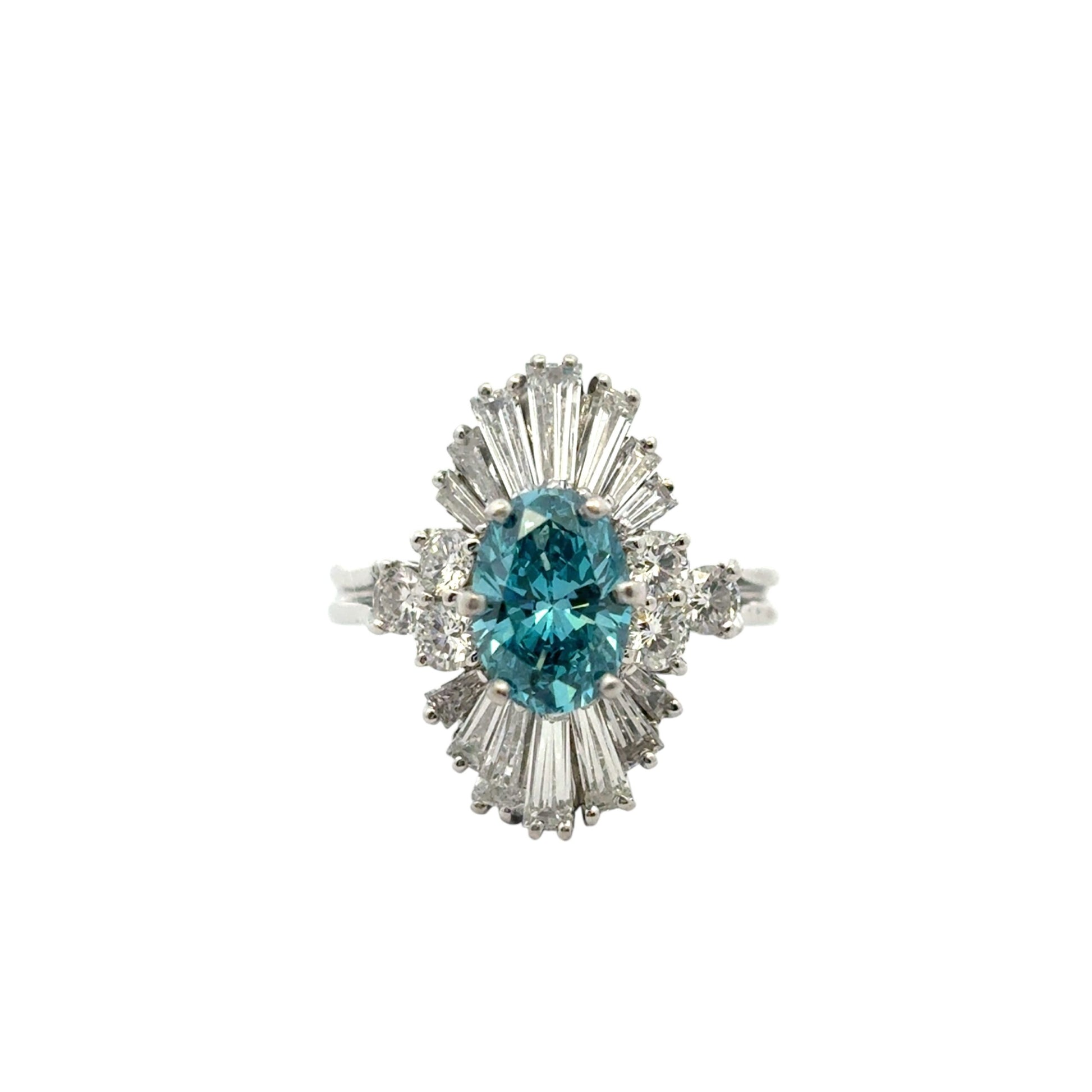 An approximately 1-carat blue irradiated diamond crowns the center.