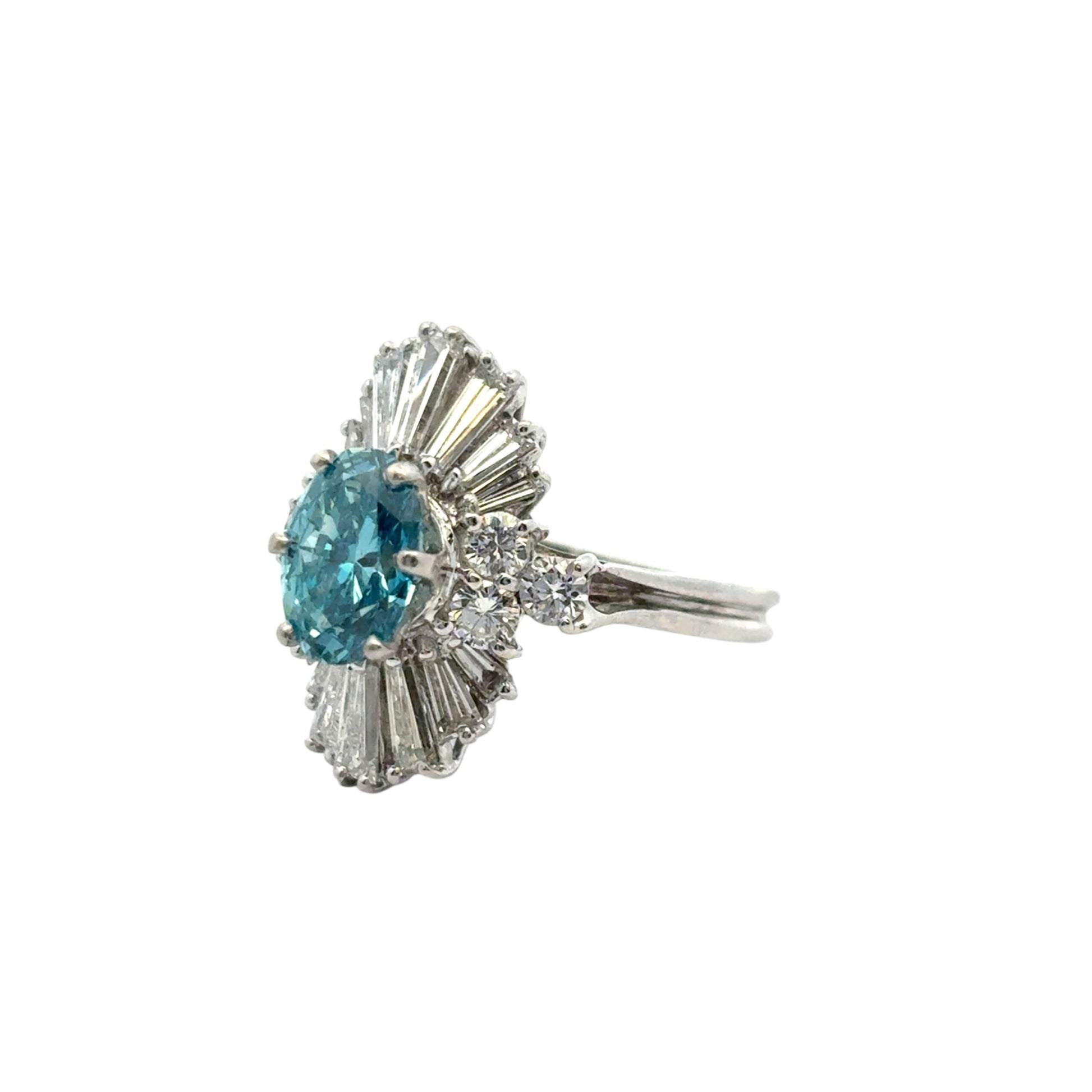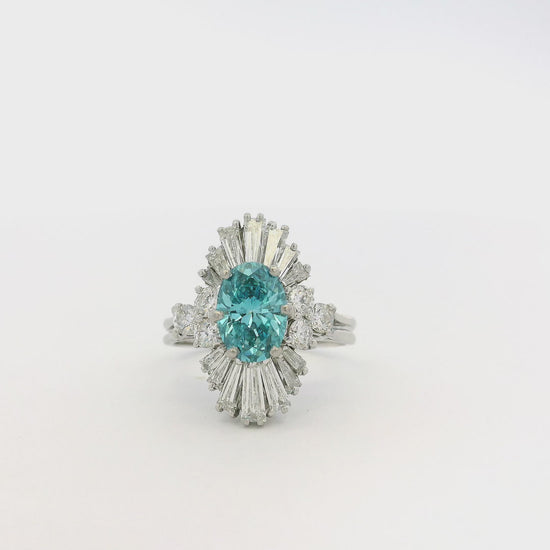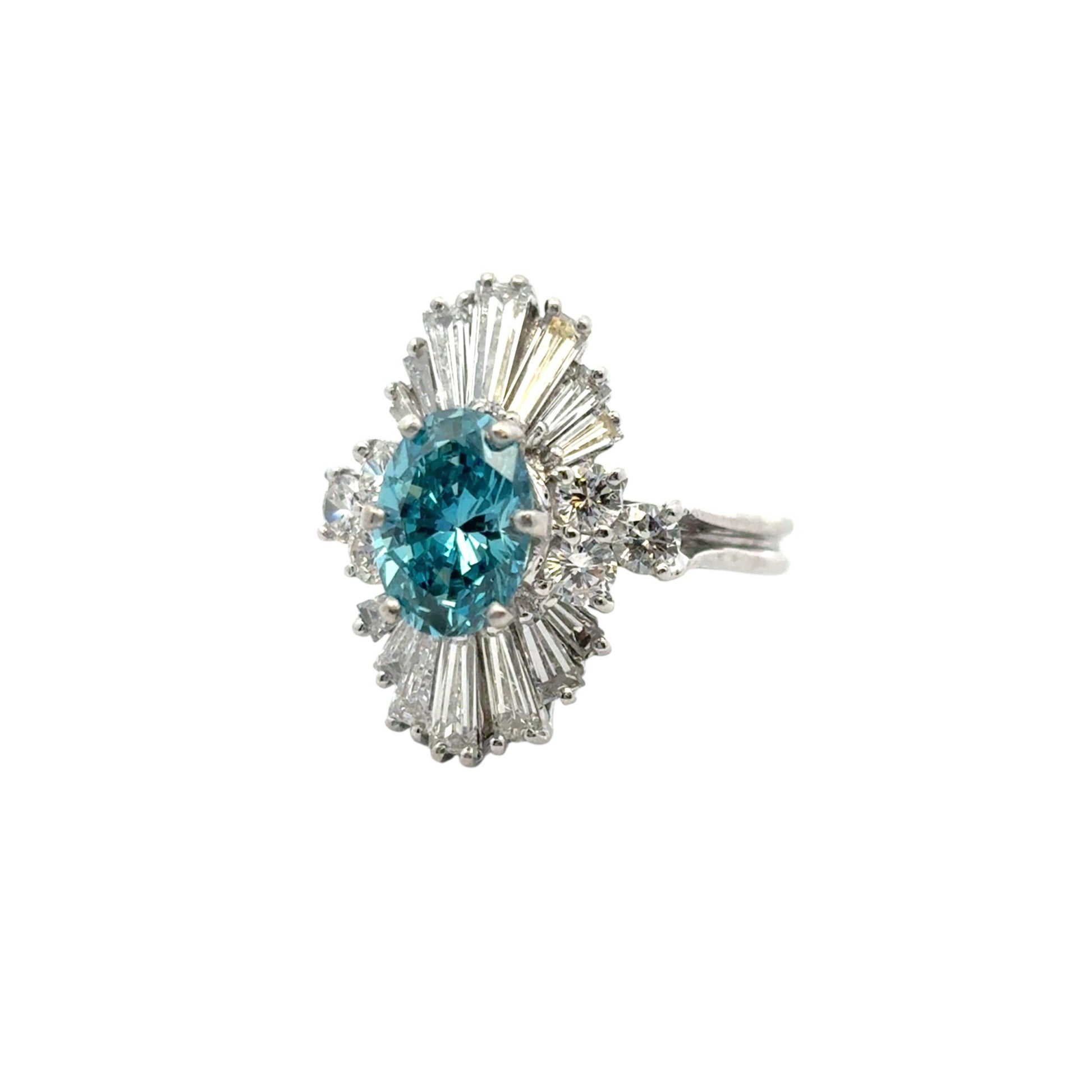 An approximately 1-carat blue irradiated diamond crowns the center.