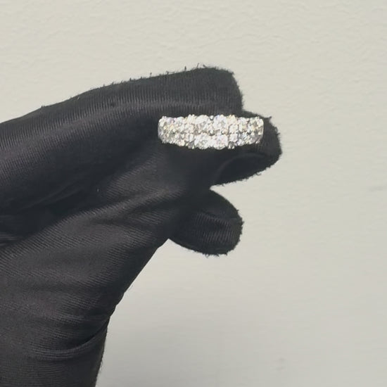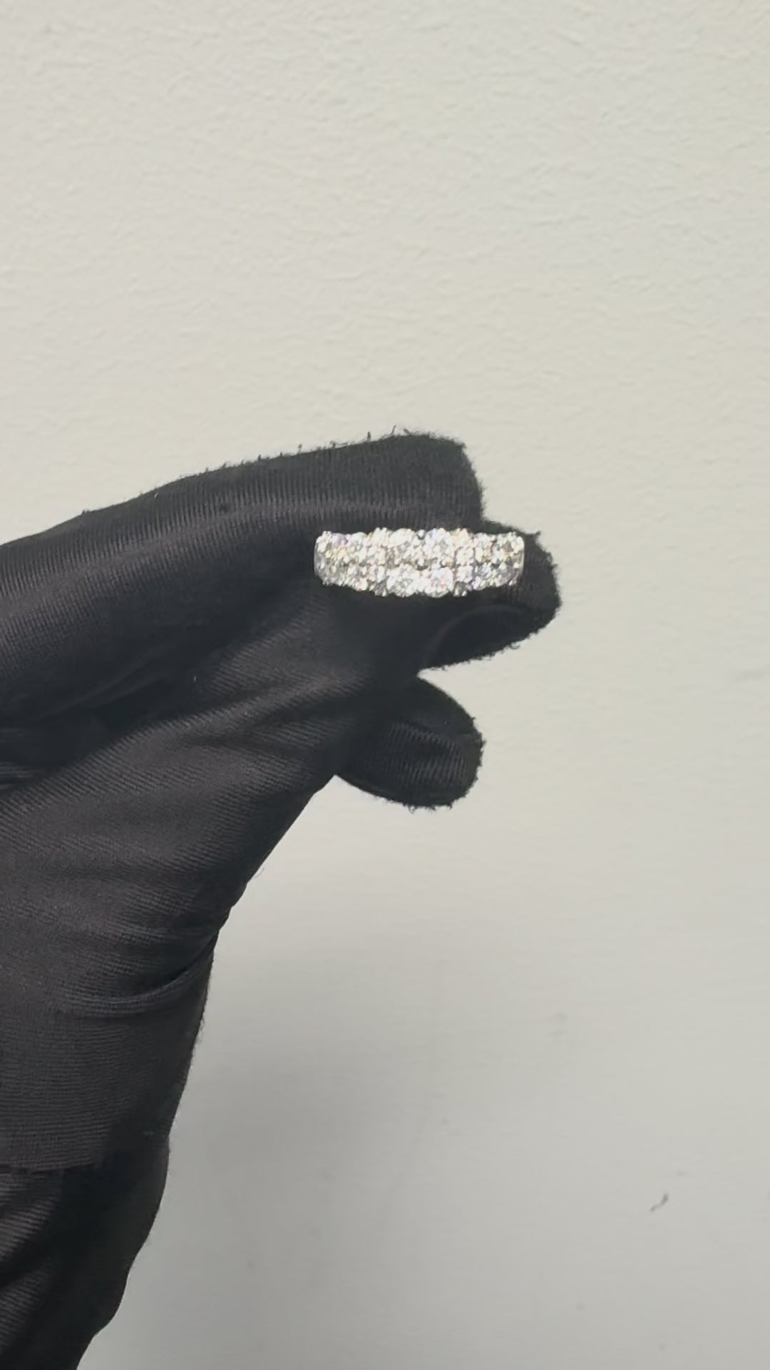 Two perfectly aligned rows of brilliant diamonds—each row weighing approximately 0.715 carats—create a seamless band of light that wraps around your finger with elegance and grace. The tapered band (3.3mm to 2.1mm) ensures a comfortable and flattering fit, while the polished finish adds a refined touch.