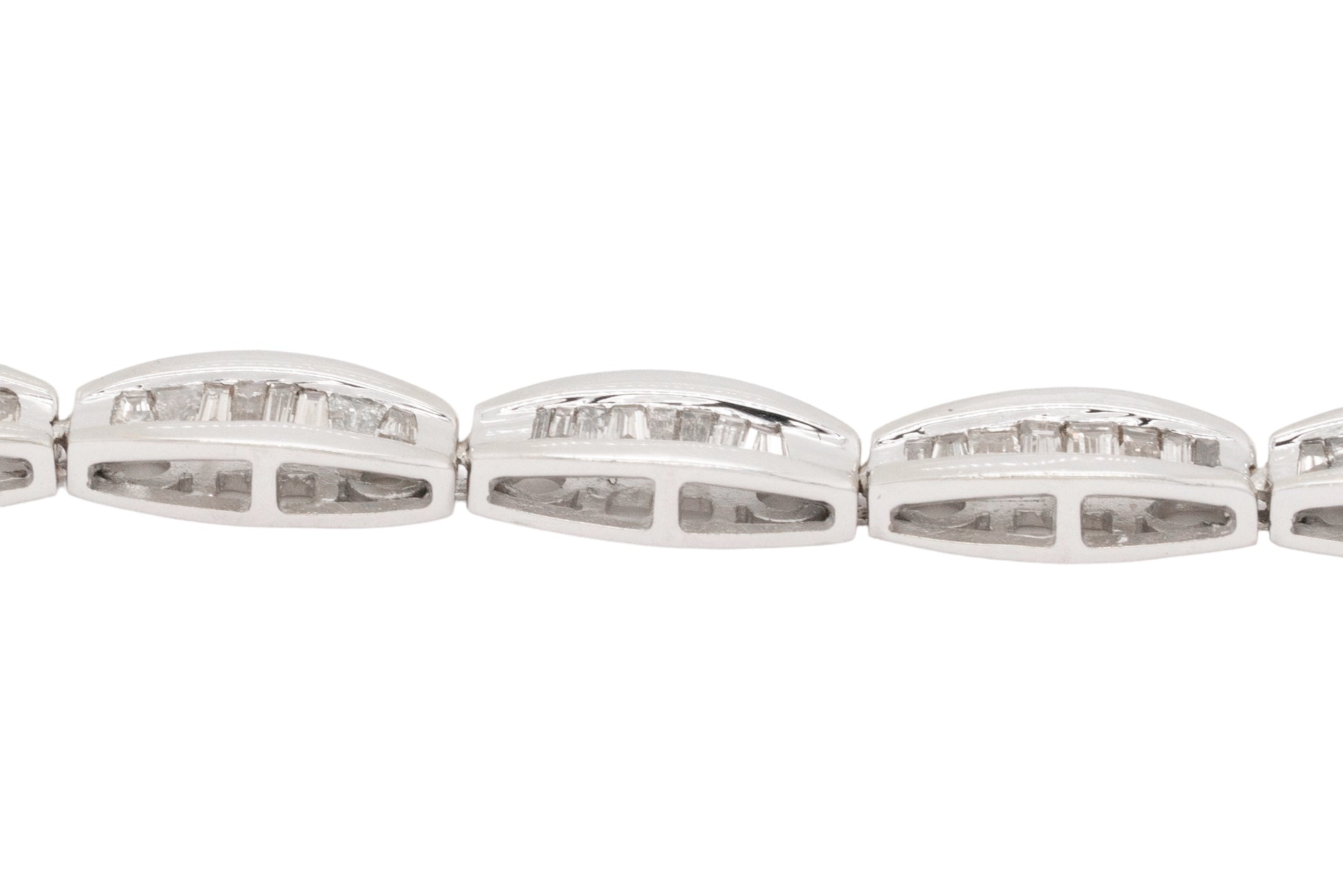 This timeless tennis bracelet features a sleek row of shimmering baguette-cut diamonds, expertly channel set in polished 14k white gold. Its understated elegance makes it a versatile piece—perfect for everyday luxury or special occasions.