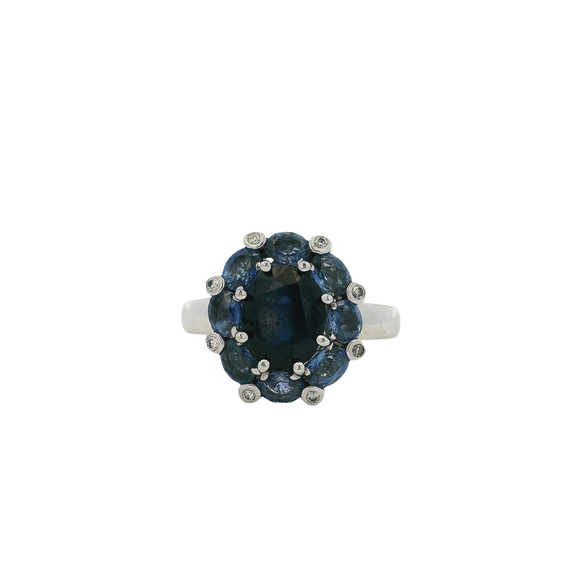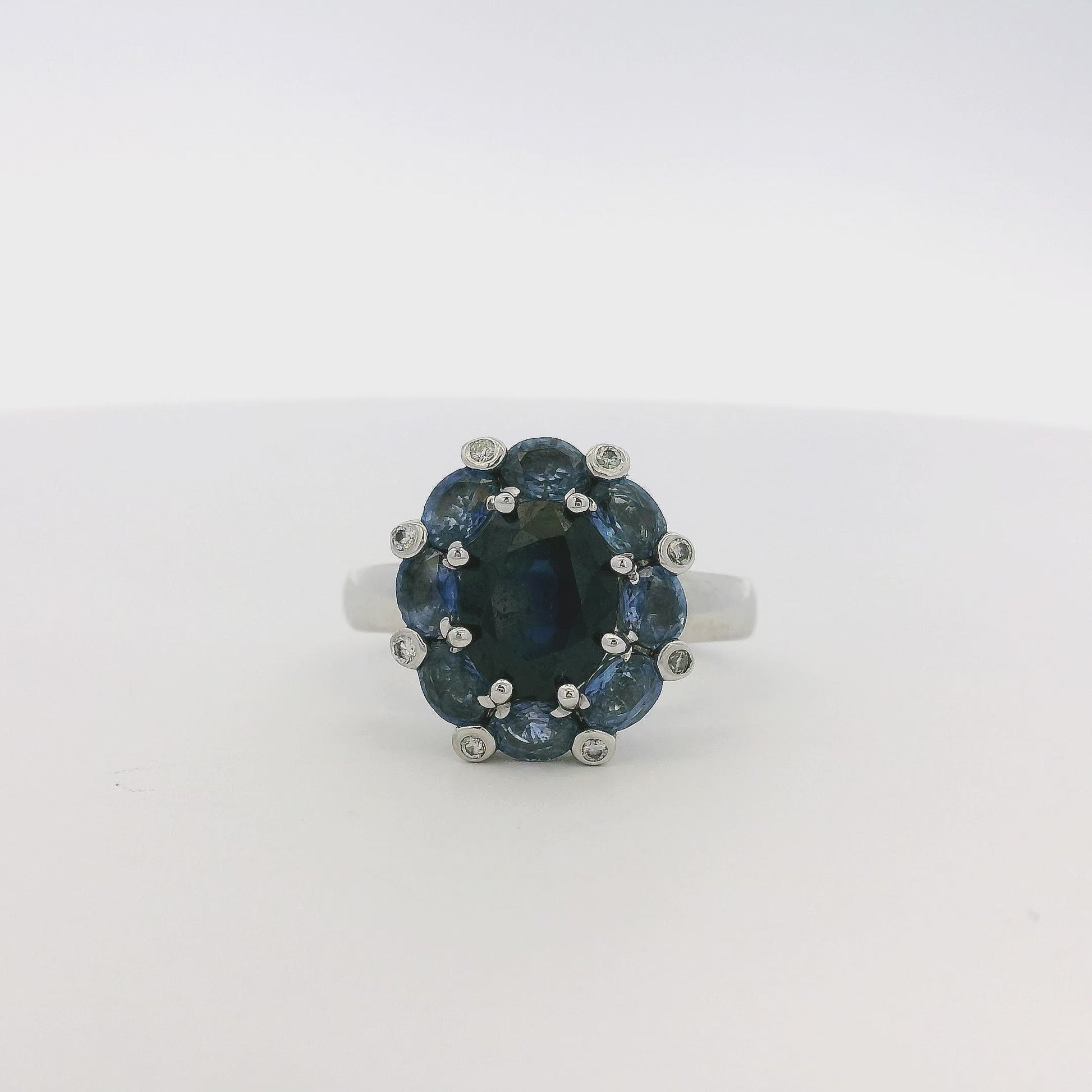 Slip on this 14k white-gold ring and watch color drama unfold: first, a midnight-dark 2ct sapphire anchors the center like a deep-sea gem; then, a halo of 2.8ct medium-saturation pastel sapphires wraps around it, creating an ombré effect that shifts from dusk to dawn with every tilt of your hand.