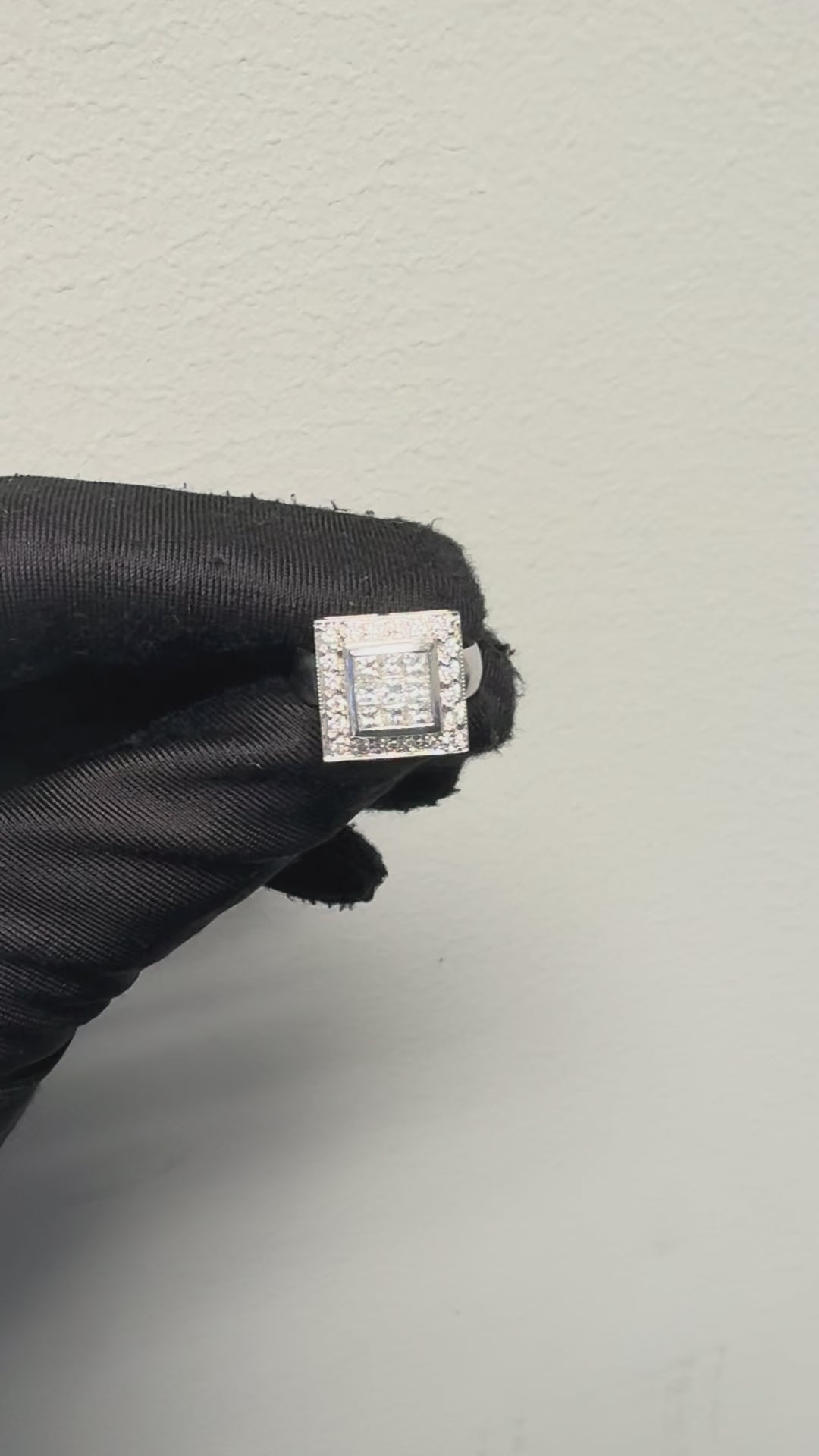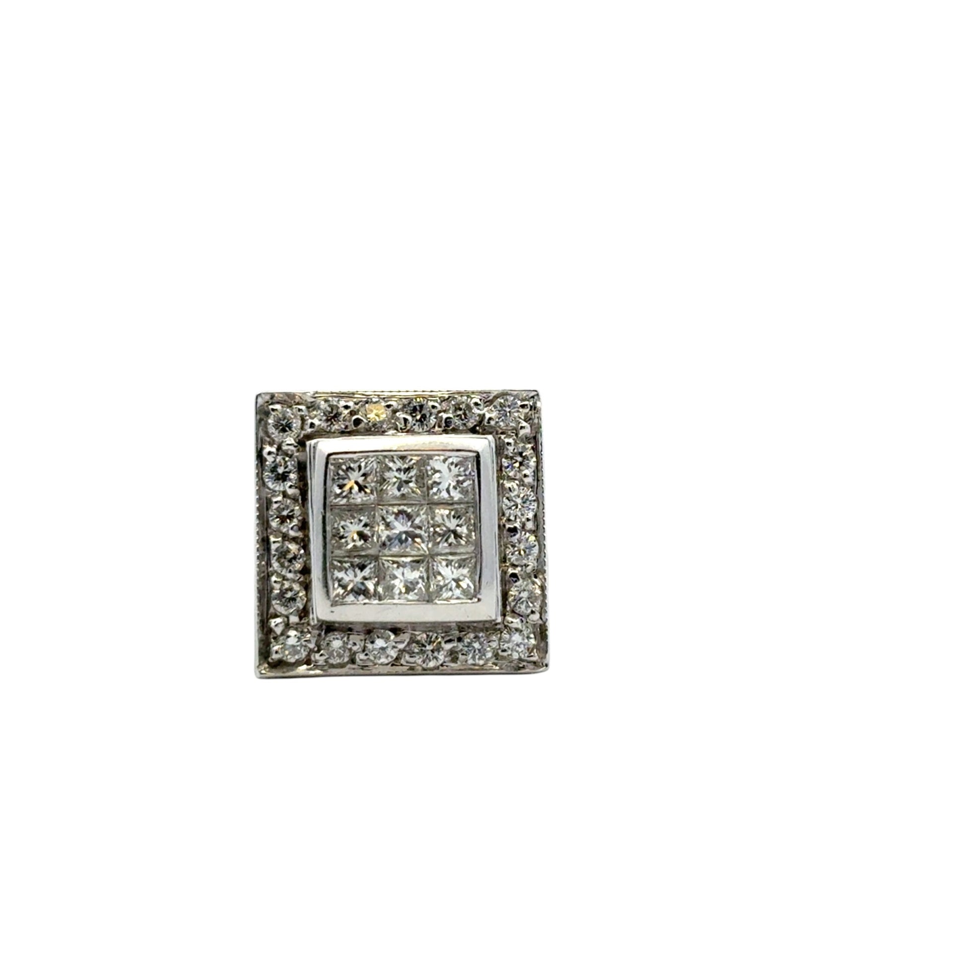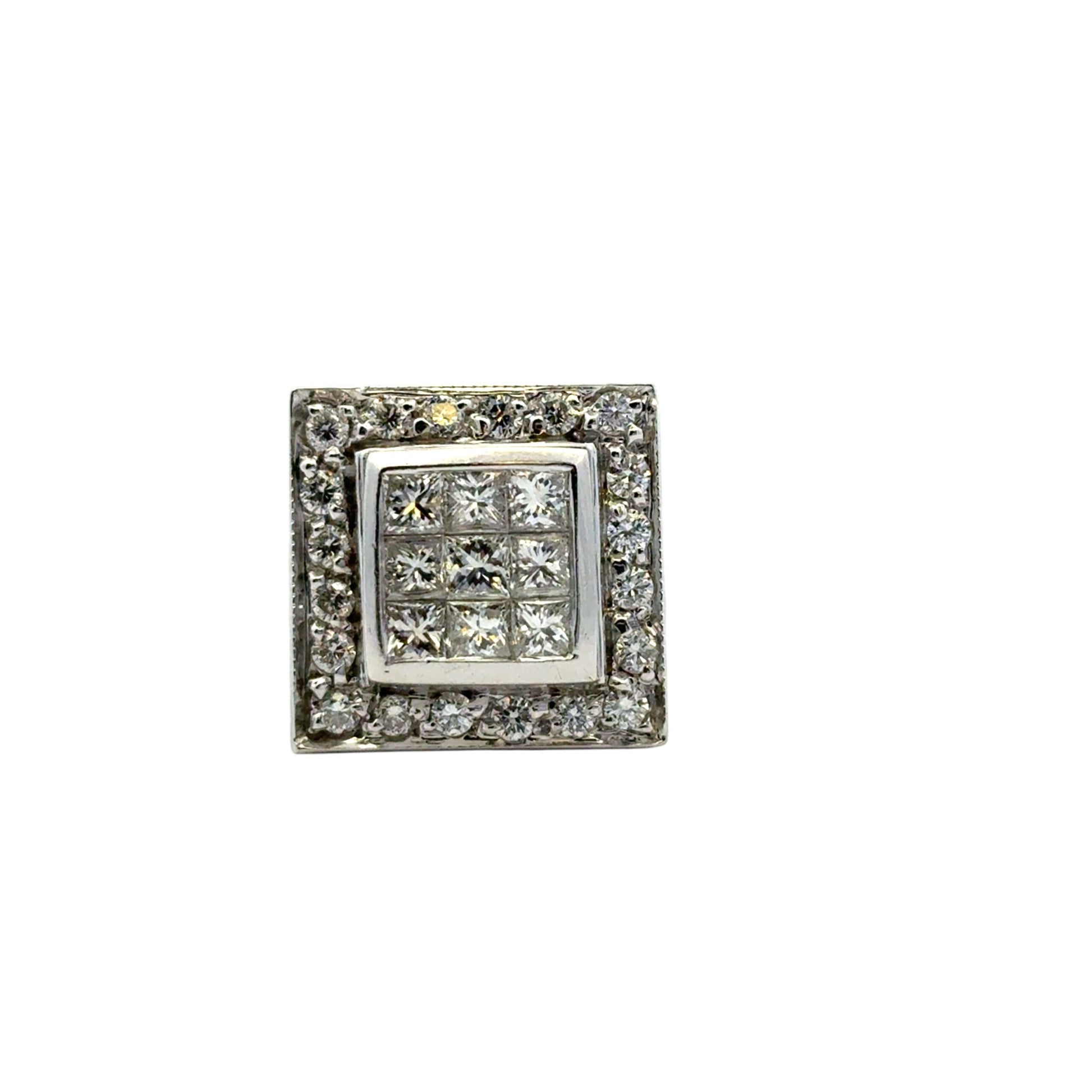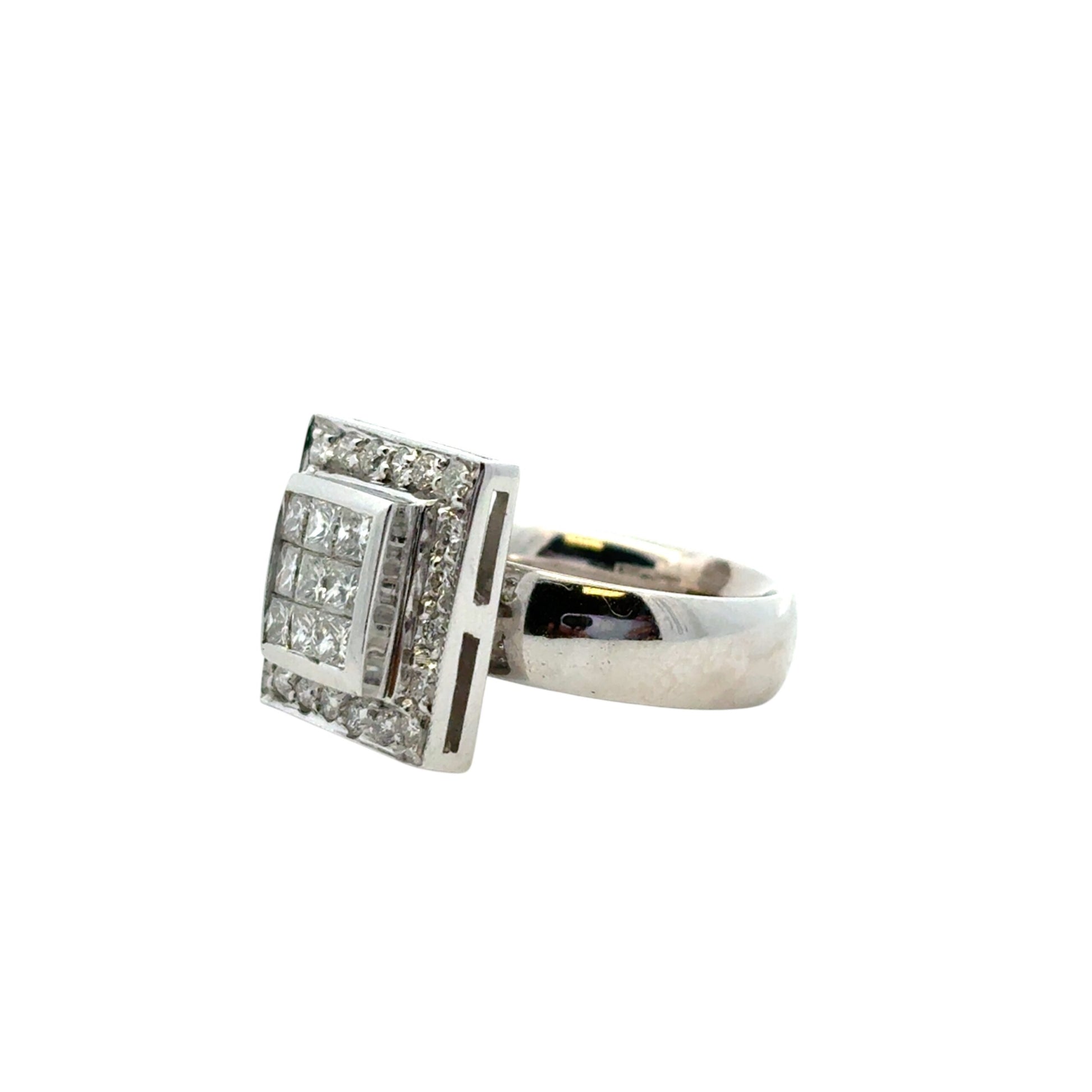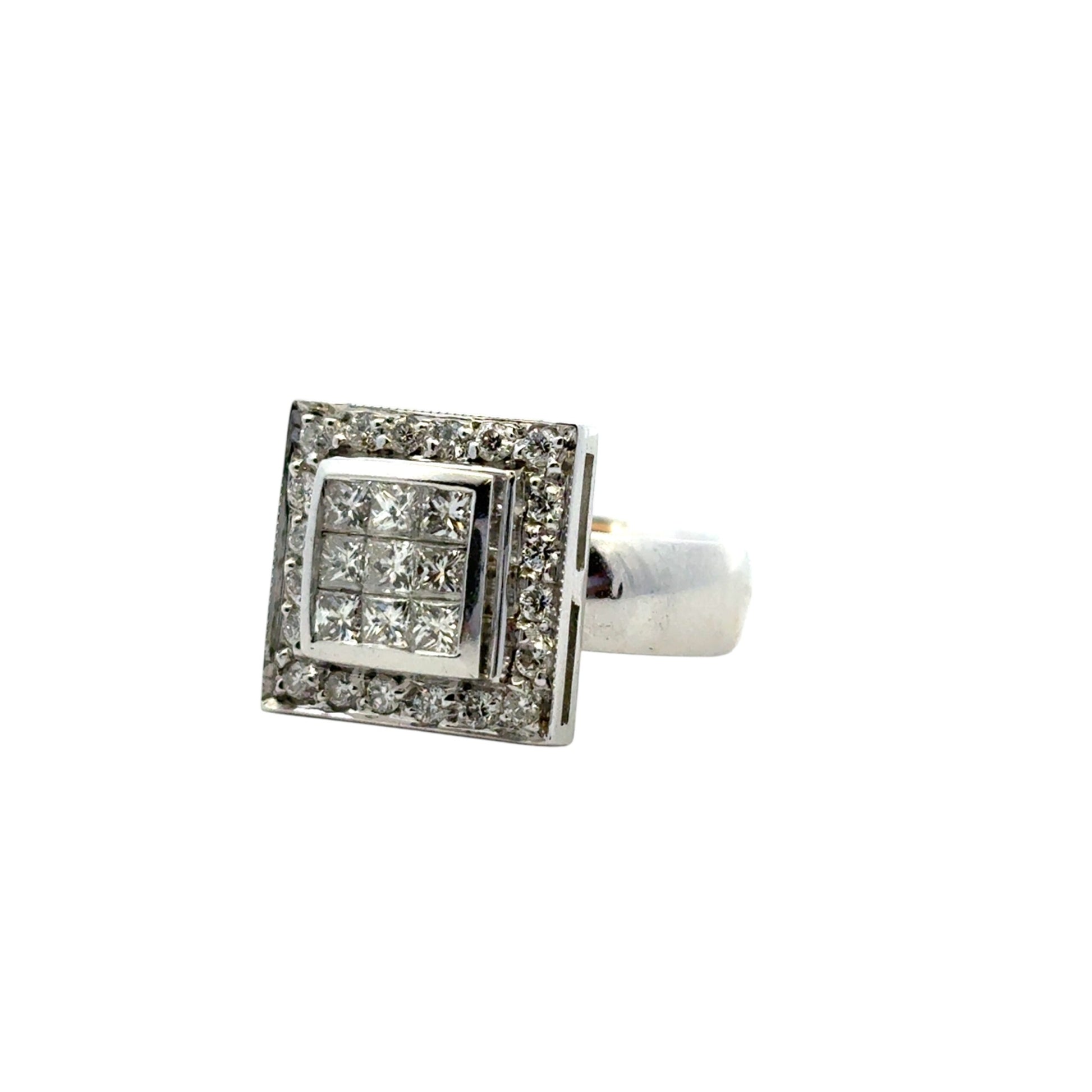 At the heart of this luxurious ring are square-cut natural diamonds totaling approximately 0.49 carats, framed by a luminous halo of 0.24 carats of round-cut natural diamonds that enhance the brilliance and create a captivating sparkle from every angle. The clean, square design (approx. 13.1 mm x 13.1 mm) offers a modern elegance that’s both eye-catching and sophisticated.