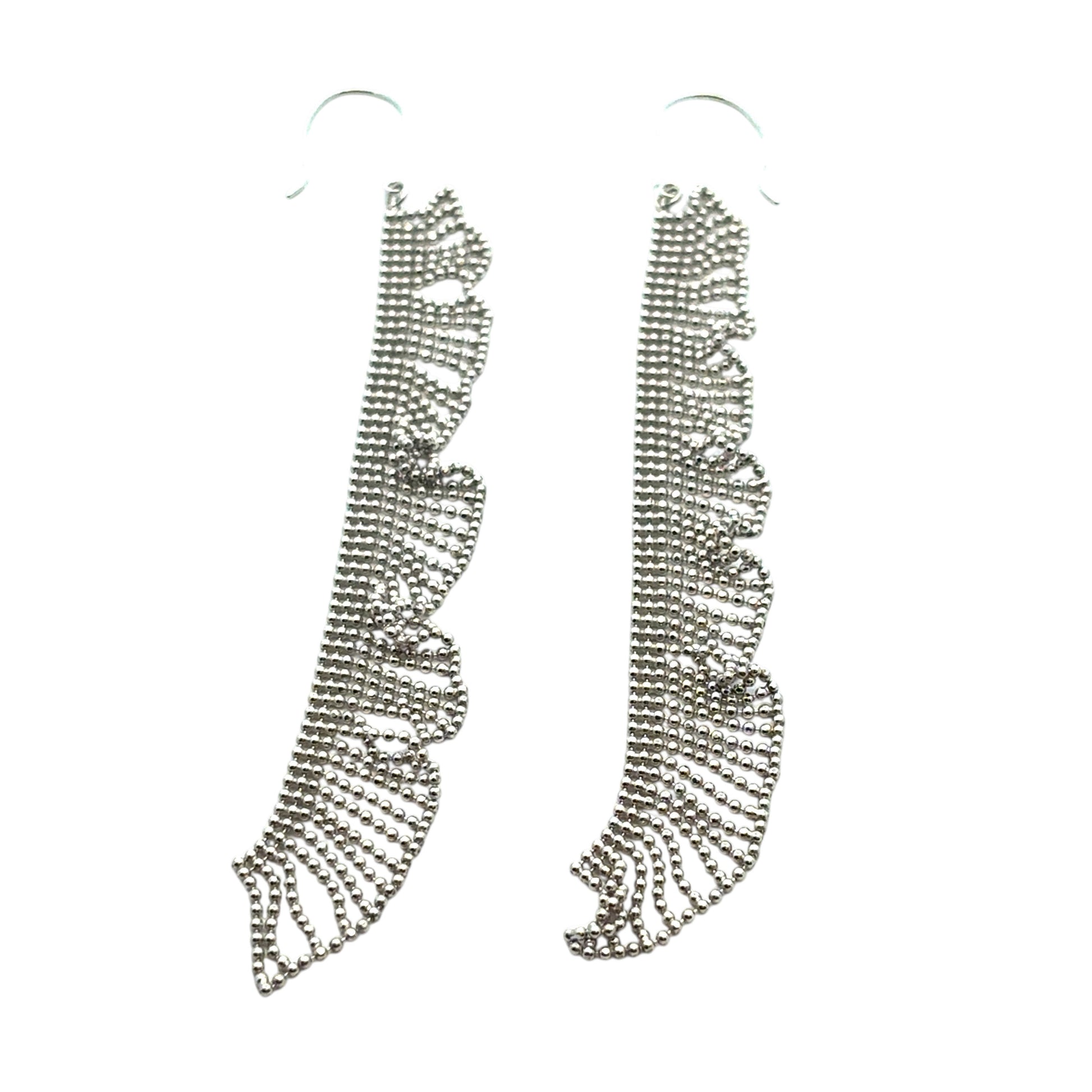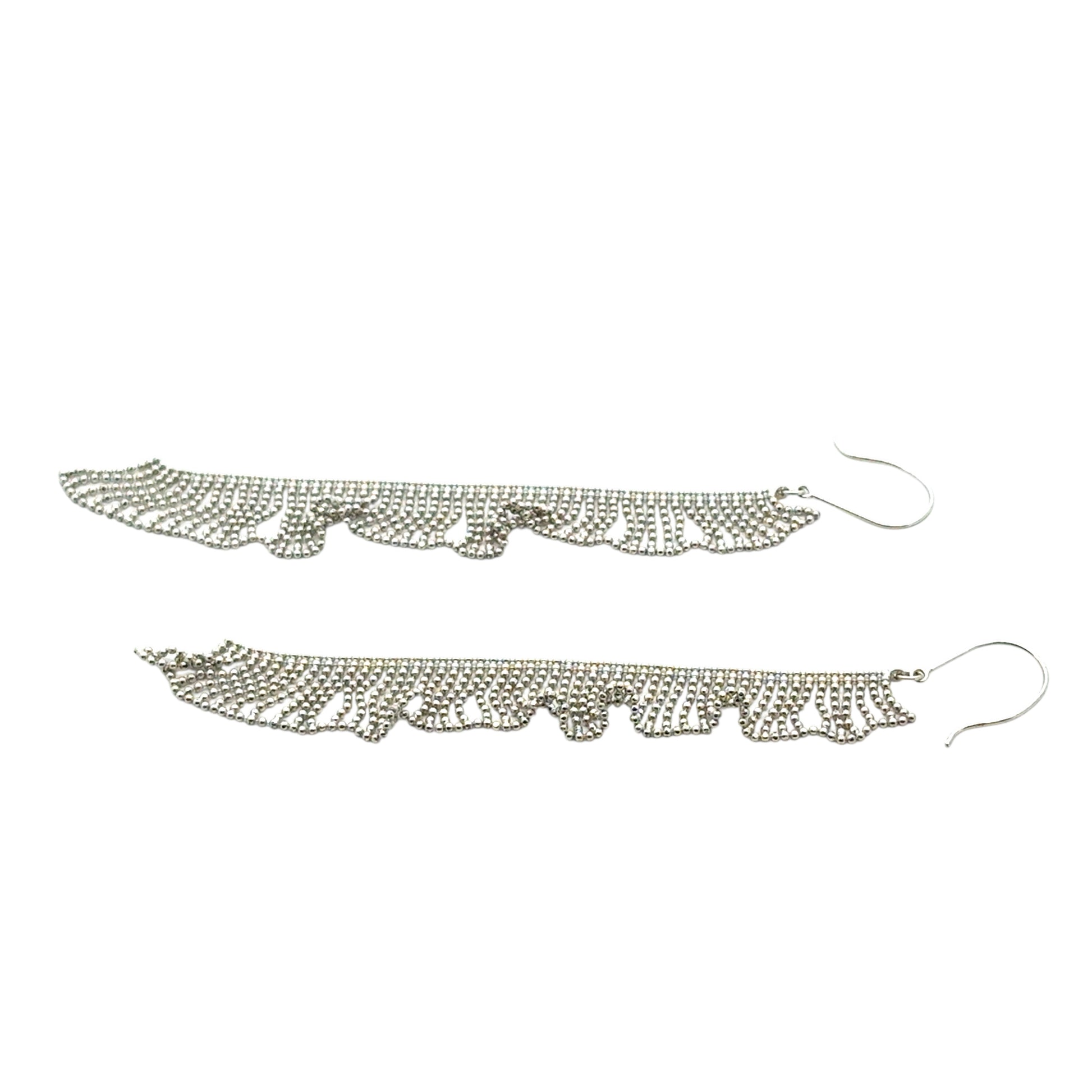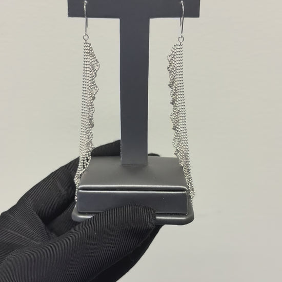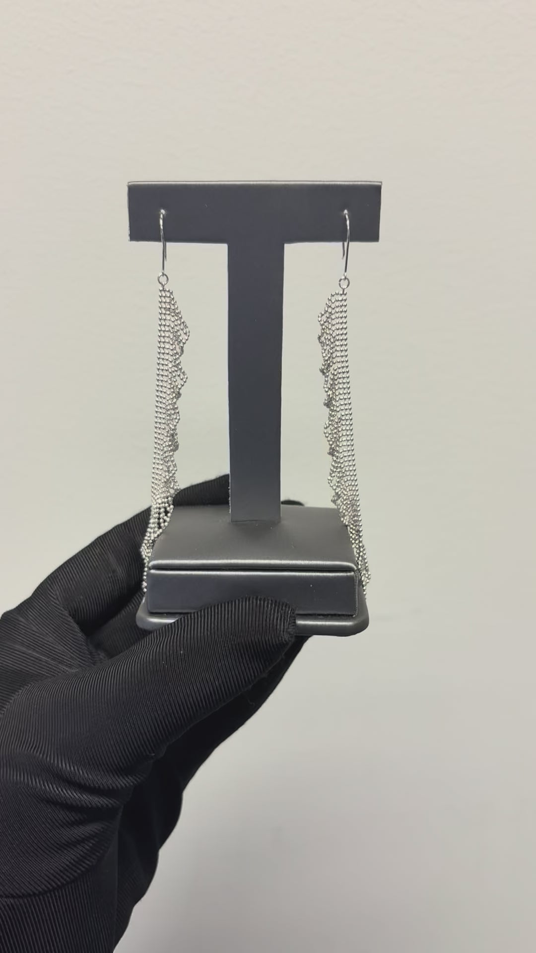 These long platinum dangle earrings are a statement in motion—expertly designed with delicate cascading chains that shimmer and sway with every movement. The intricate drape of the chains creates a dramatic yet refined silhouette that elongates the neck and adds striking texture to any ensemble.