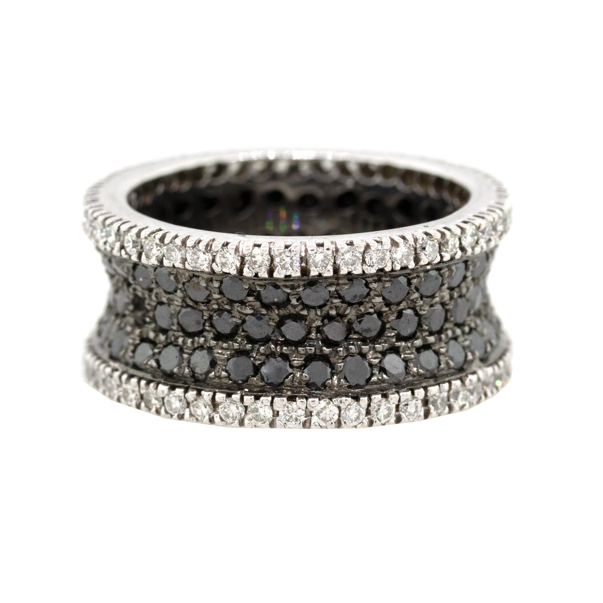 Make a striking statement with this stunning 14k white gold wide wedding band ring, adorned with a brilliant combination of black and white round diamonds. Totaling approximately 2.5 carats, the alternating rows of contrast diamonds deliver bold texture and sparkle in every direction.