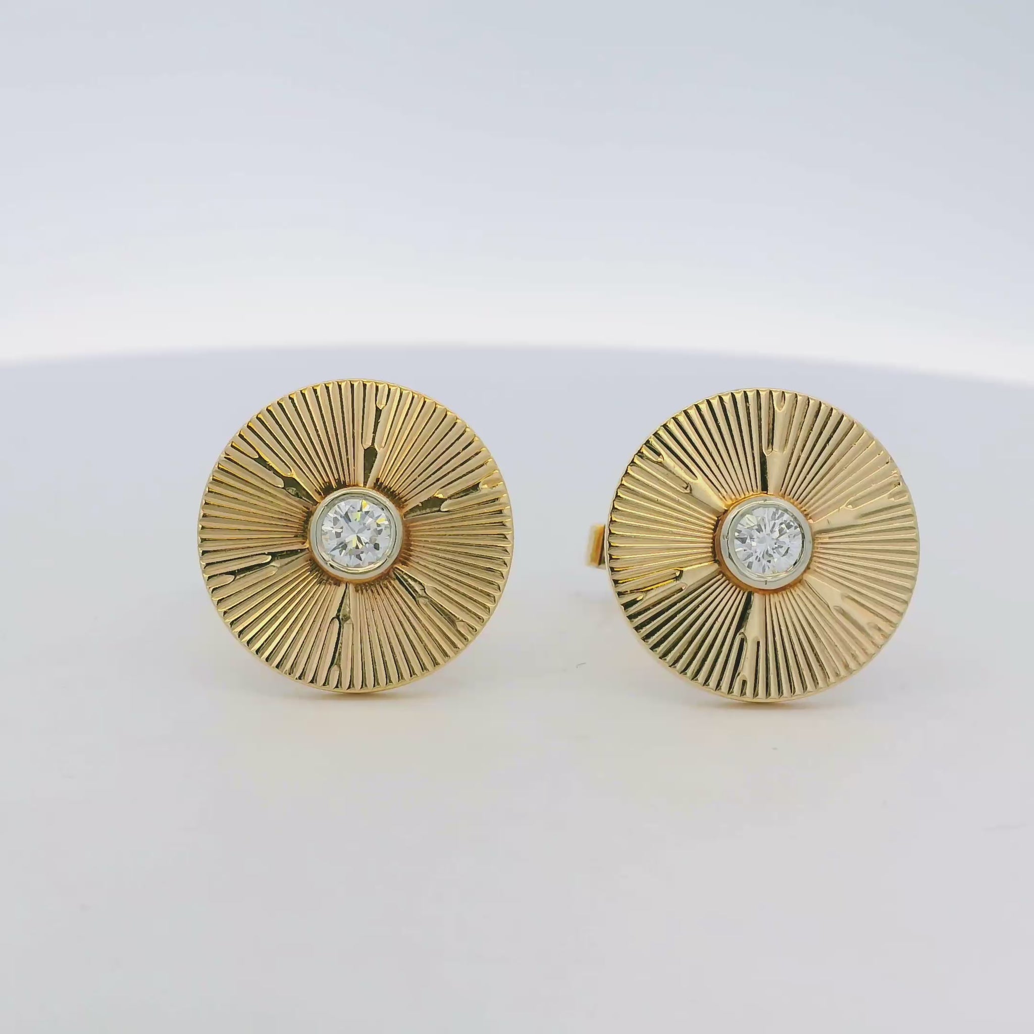 These refined cufflinks feature a striking sun rays coin design crafted in solid 14k yellow gold. At the center of each cufflink sits a brilliant white diamond, with a combined total carat weight of 0.66 carats, adding crisp contrast and understated sparkle against the radiating gold pattern.