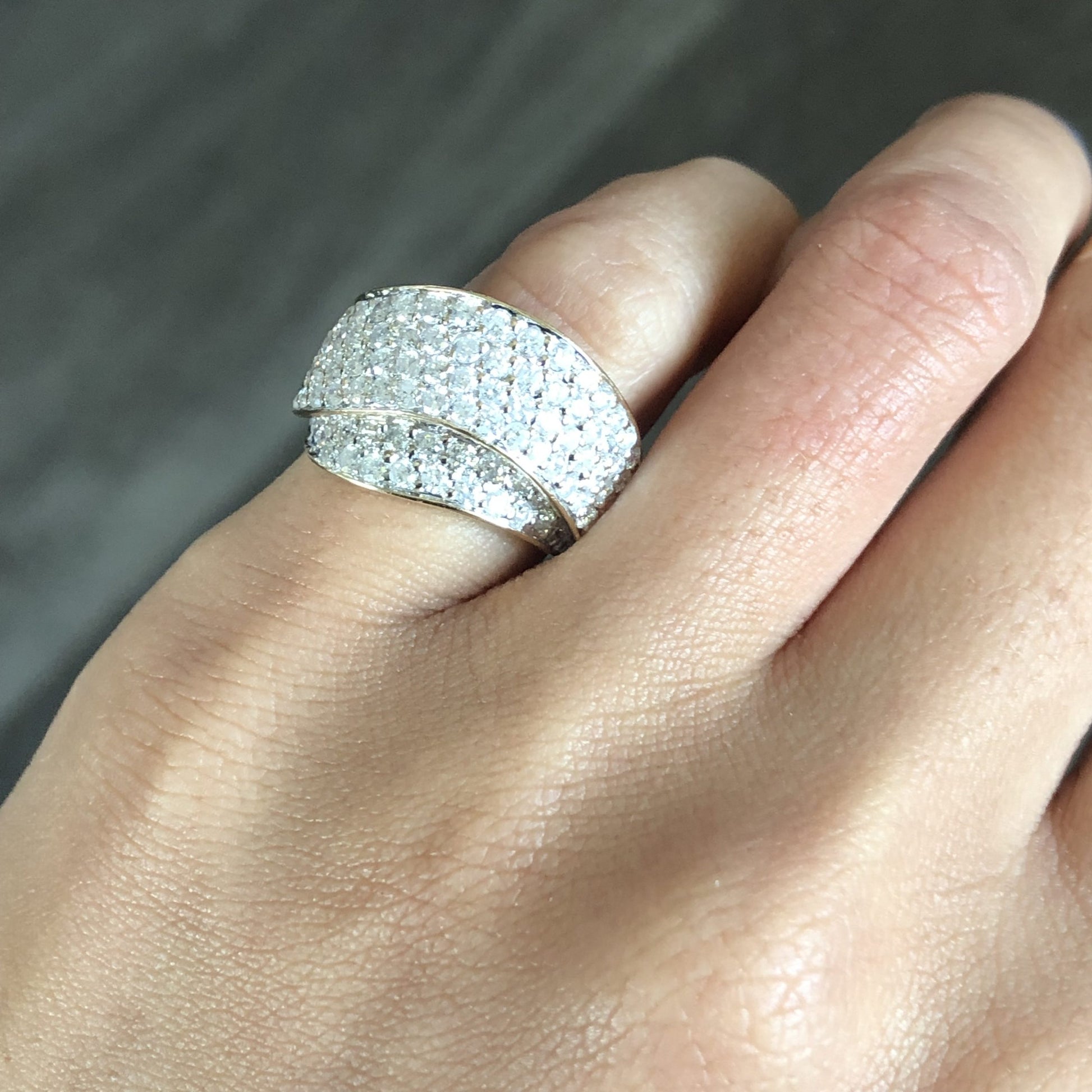 This stunning 14k yellow gold diamond pave crossover ring is in excellent condition and ready to ship!
