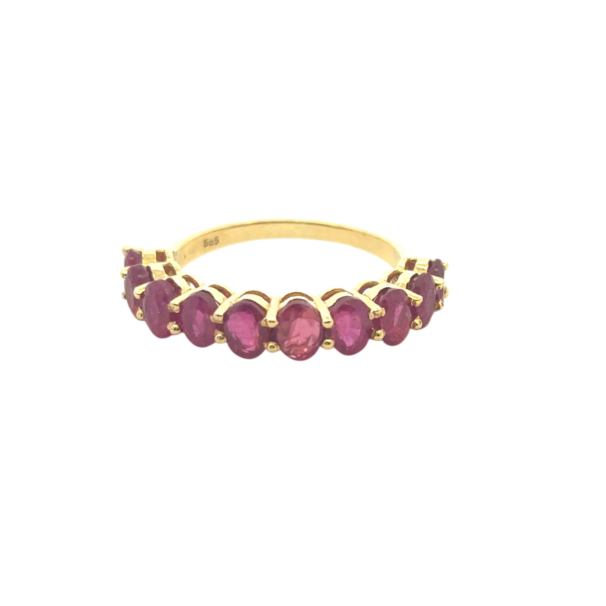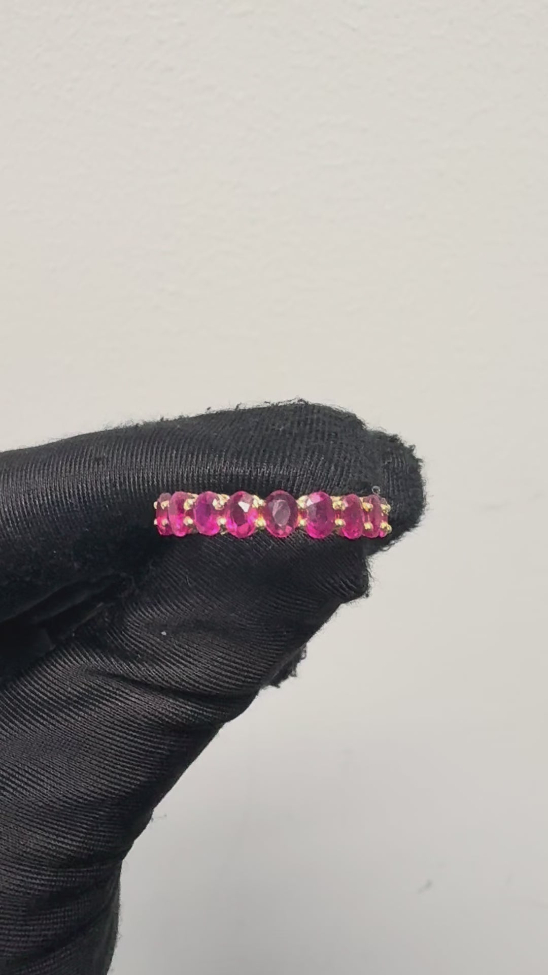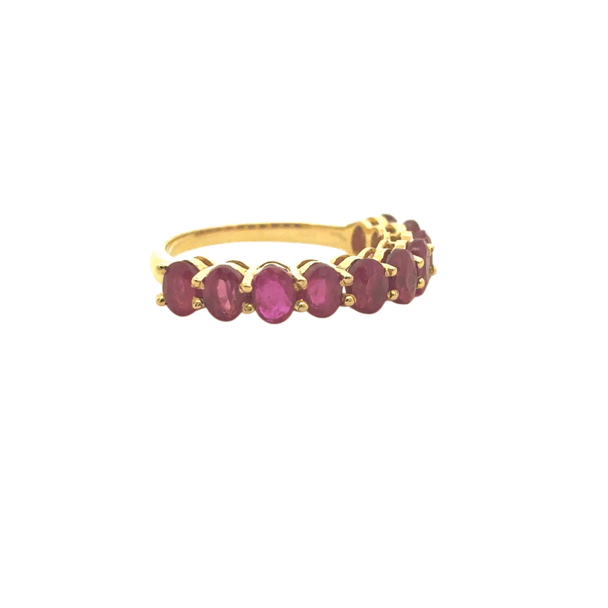 Slide this 14k yellow-gold band onto your hand and watch eleven oval rubies—totaling a full 3 carats—ignite in a continuous blaze of red. Each stone glows with velvety depth, its facets flashing hints of pink and scarlet as the light moves.