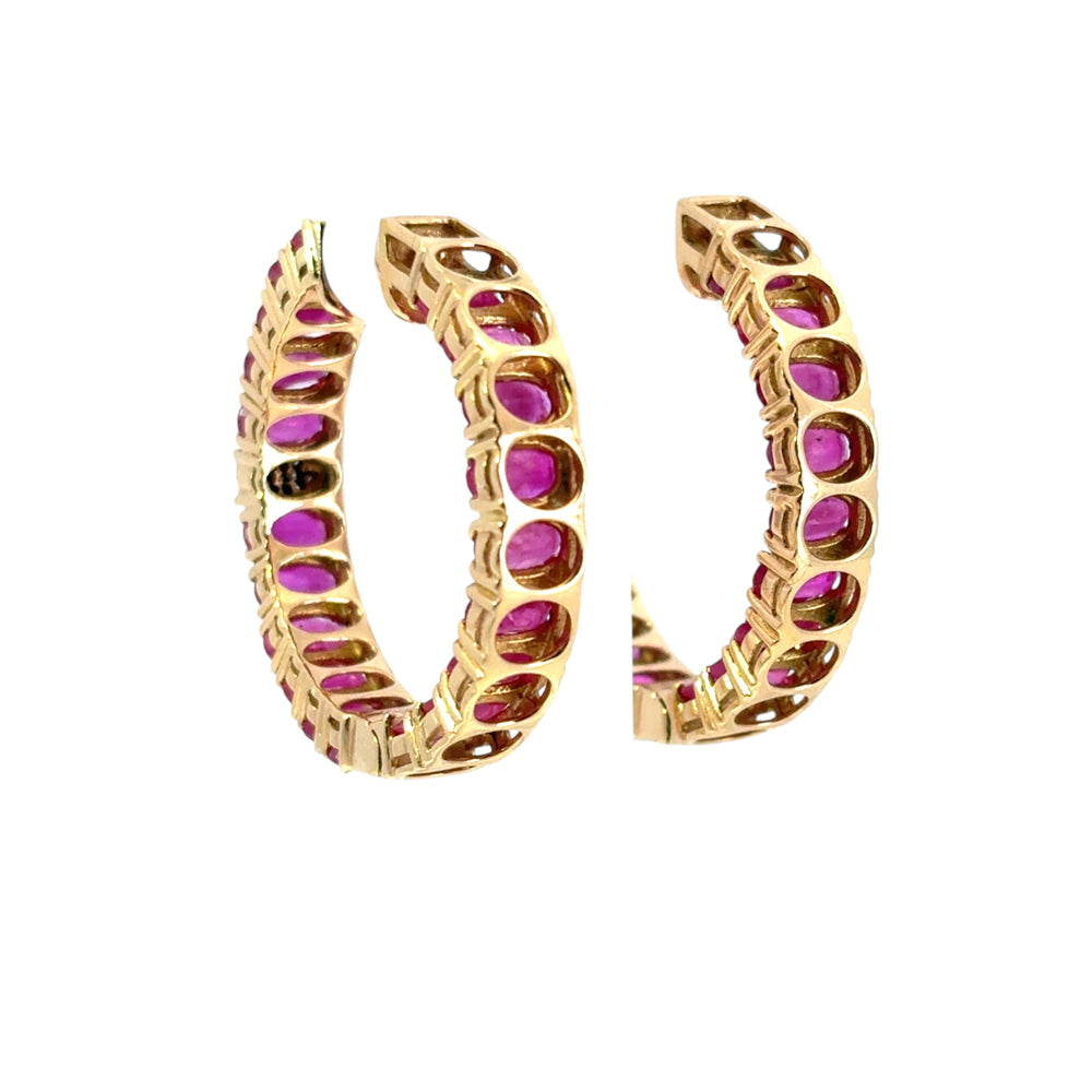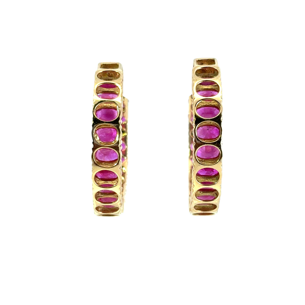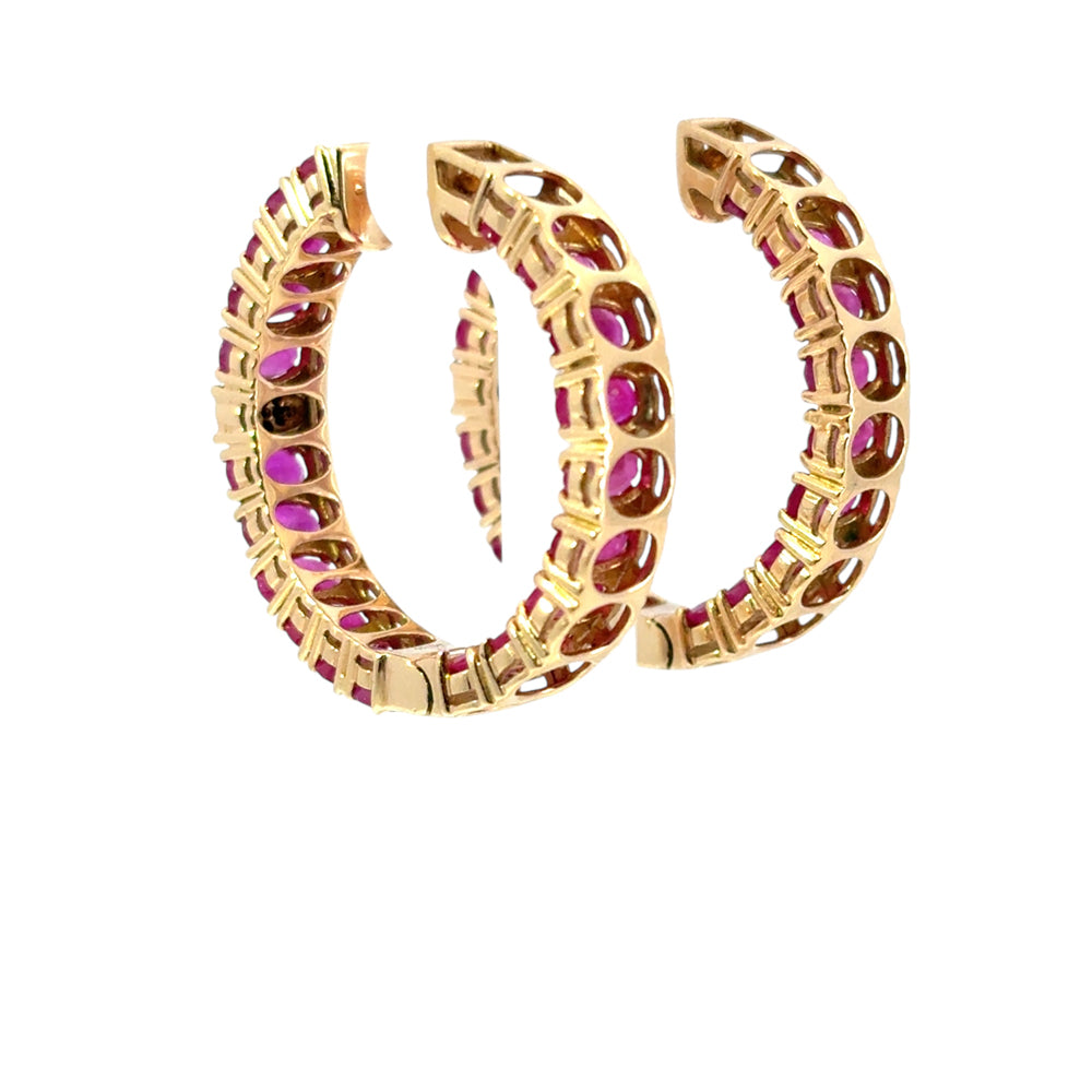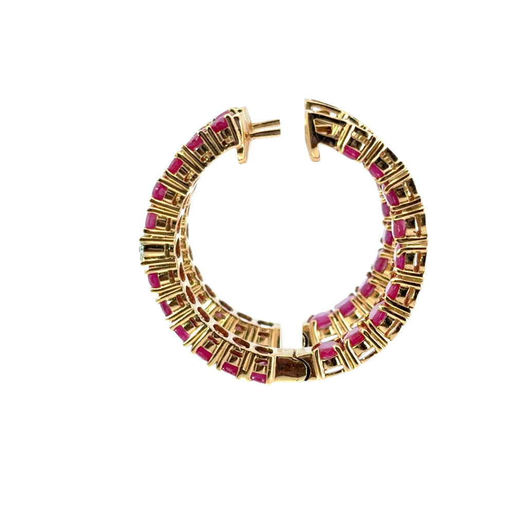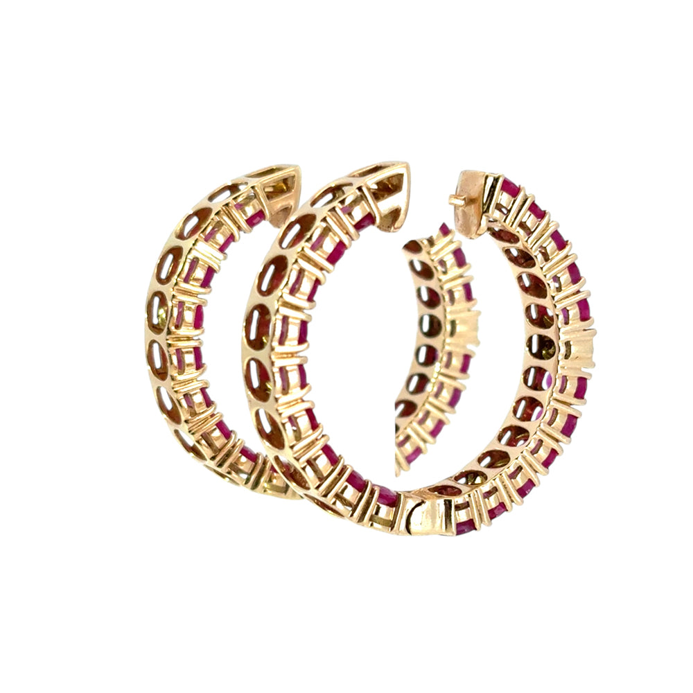 These hoop earrings have approximately 10 carats of Ruby Gemstones. Each gemstone is approximately 4.6mm in length, 3.00mm in width, and 2.1mm in depth. |