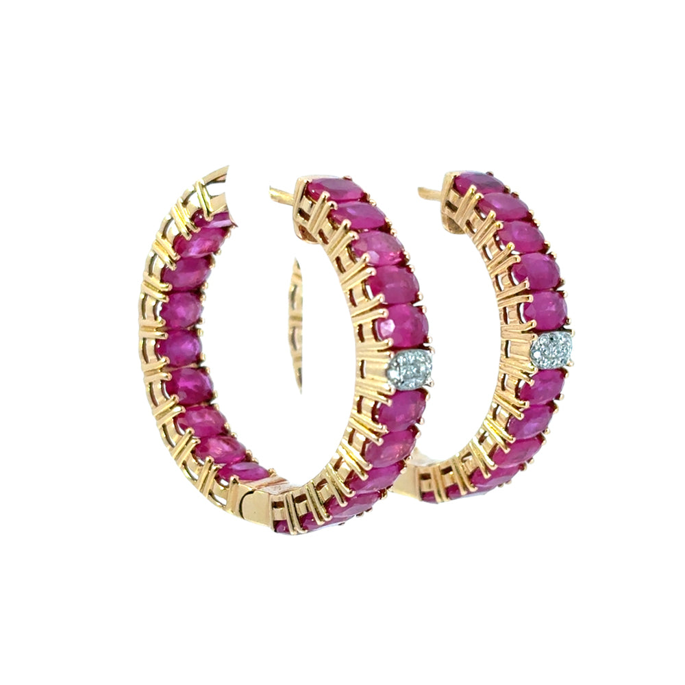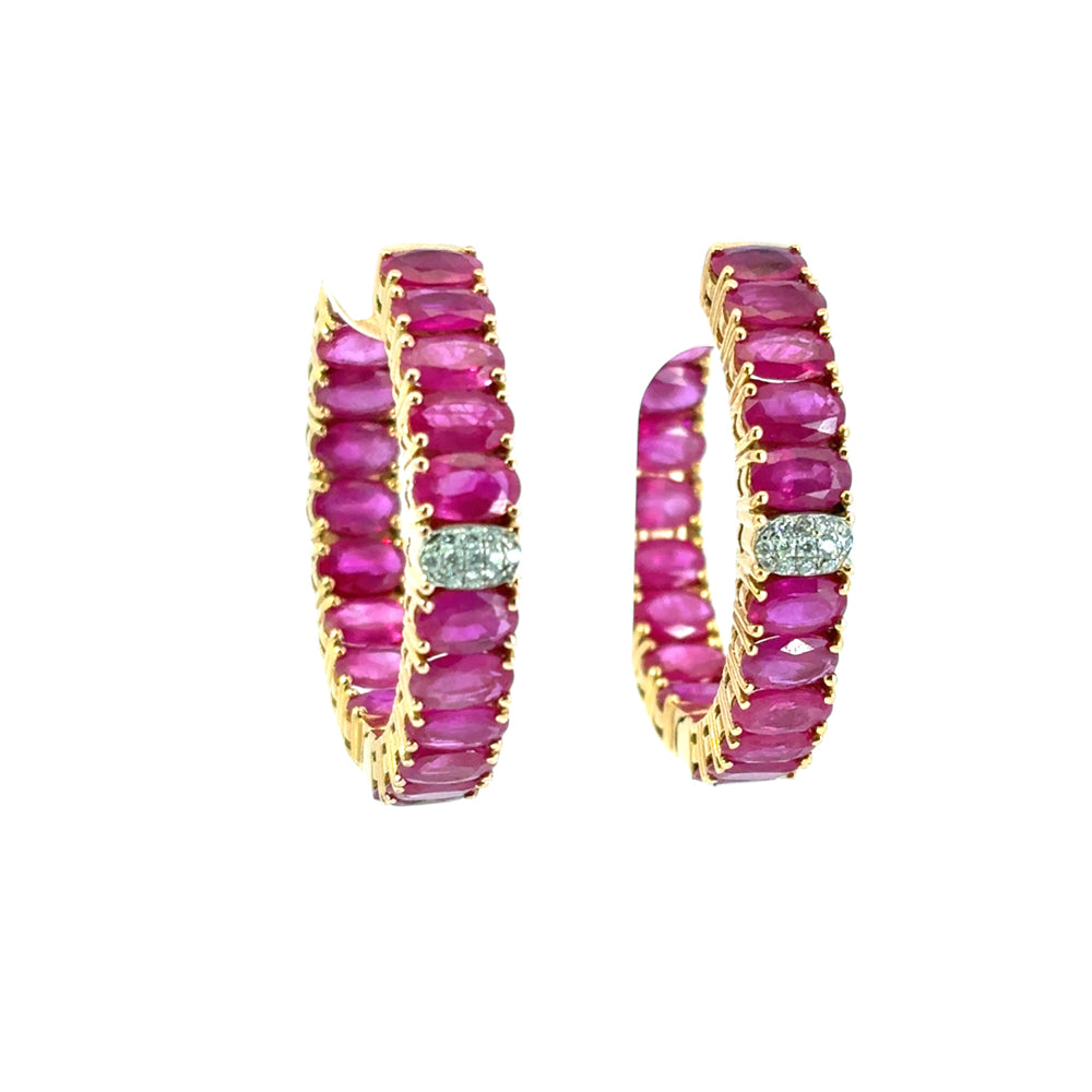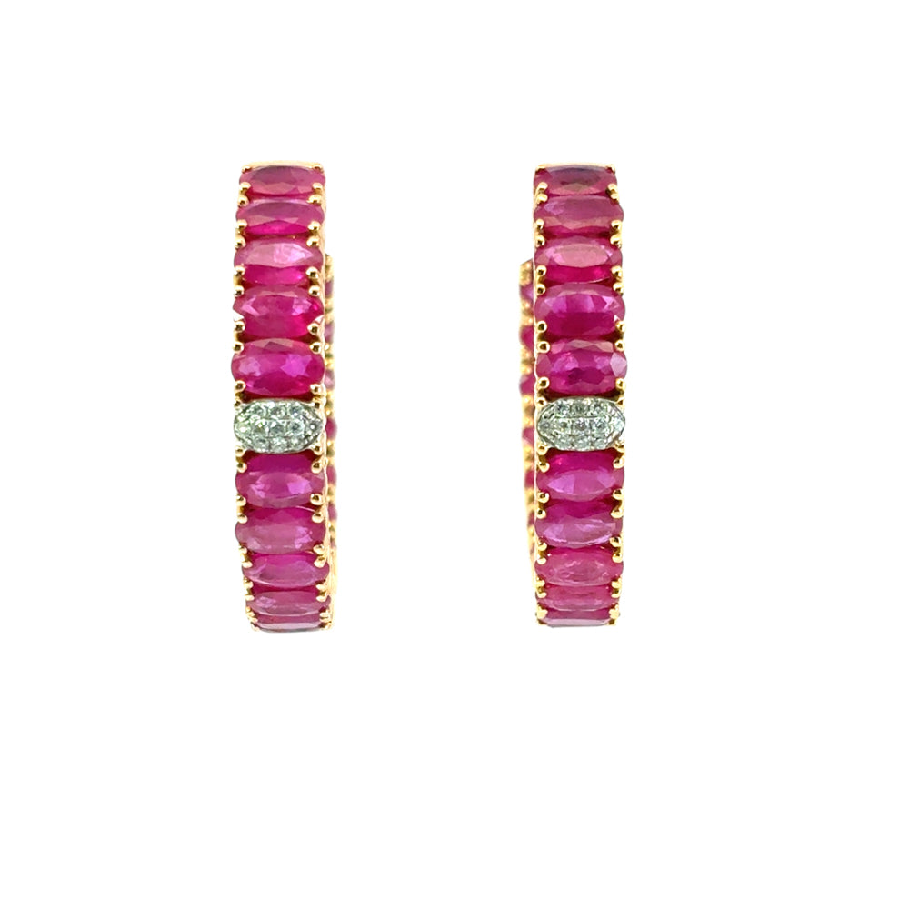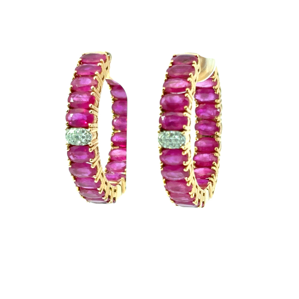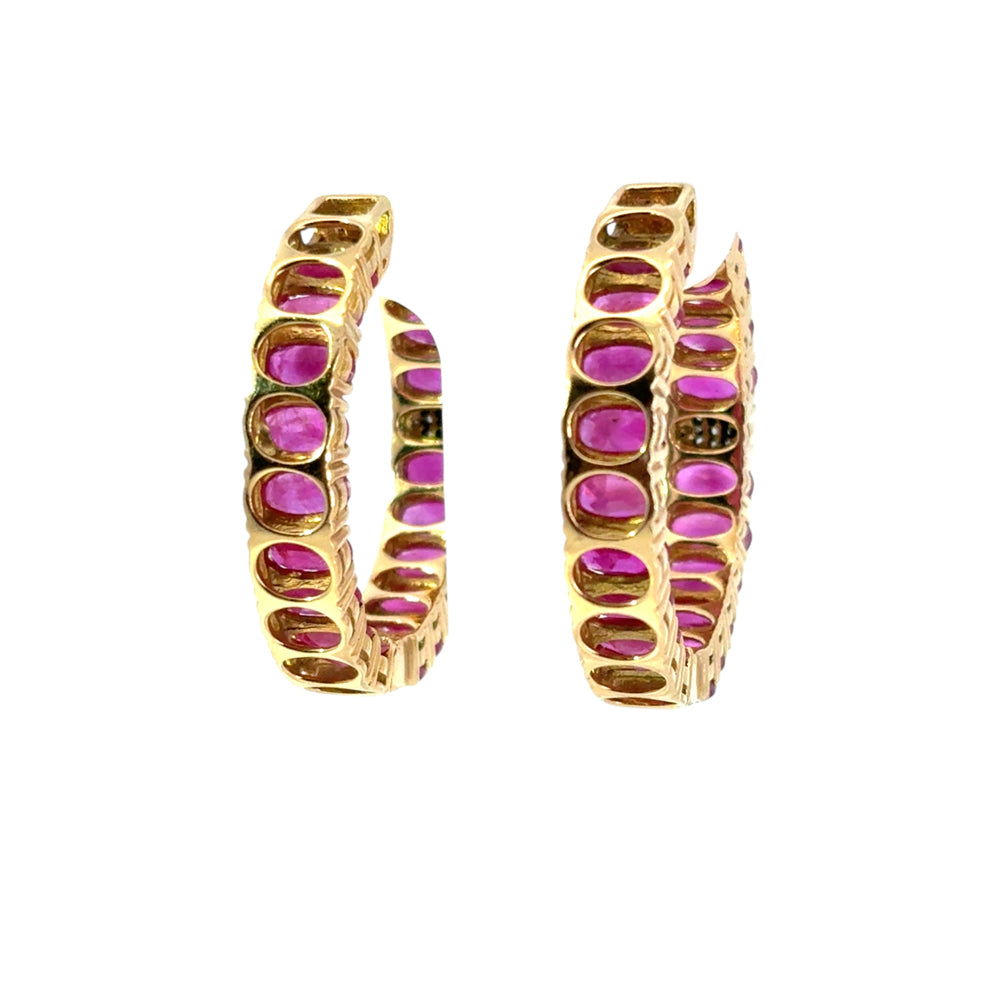 These hoop earrings have approximately 10 carats of Ruby Gemstones. Each gemstone is approximately 4.6mm in length, 3.00mm in width, and 2.1mm in depth. |