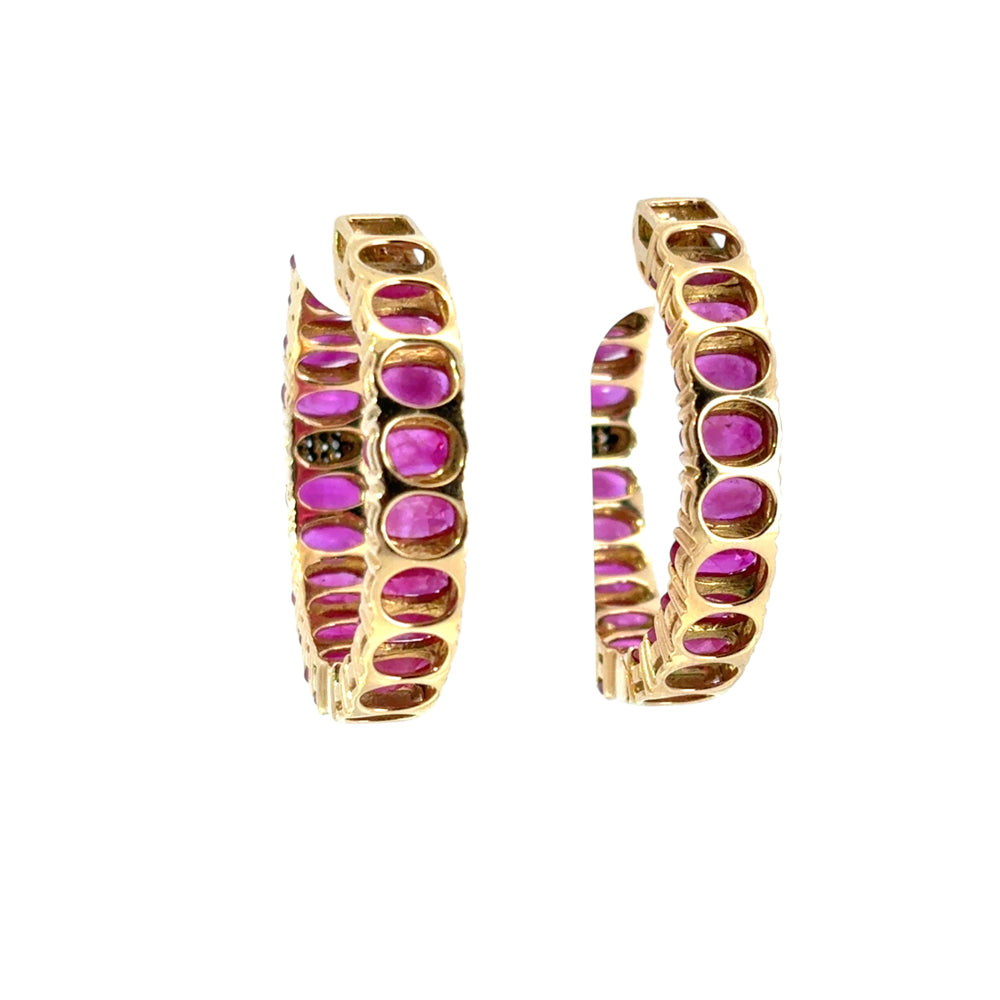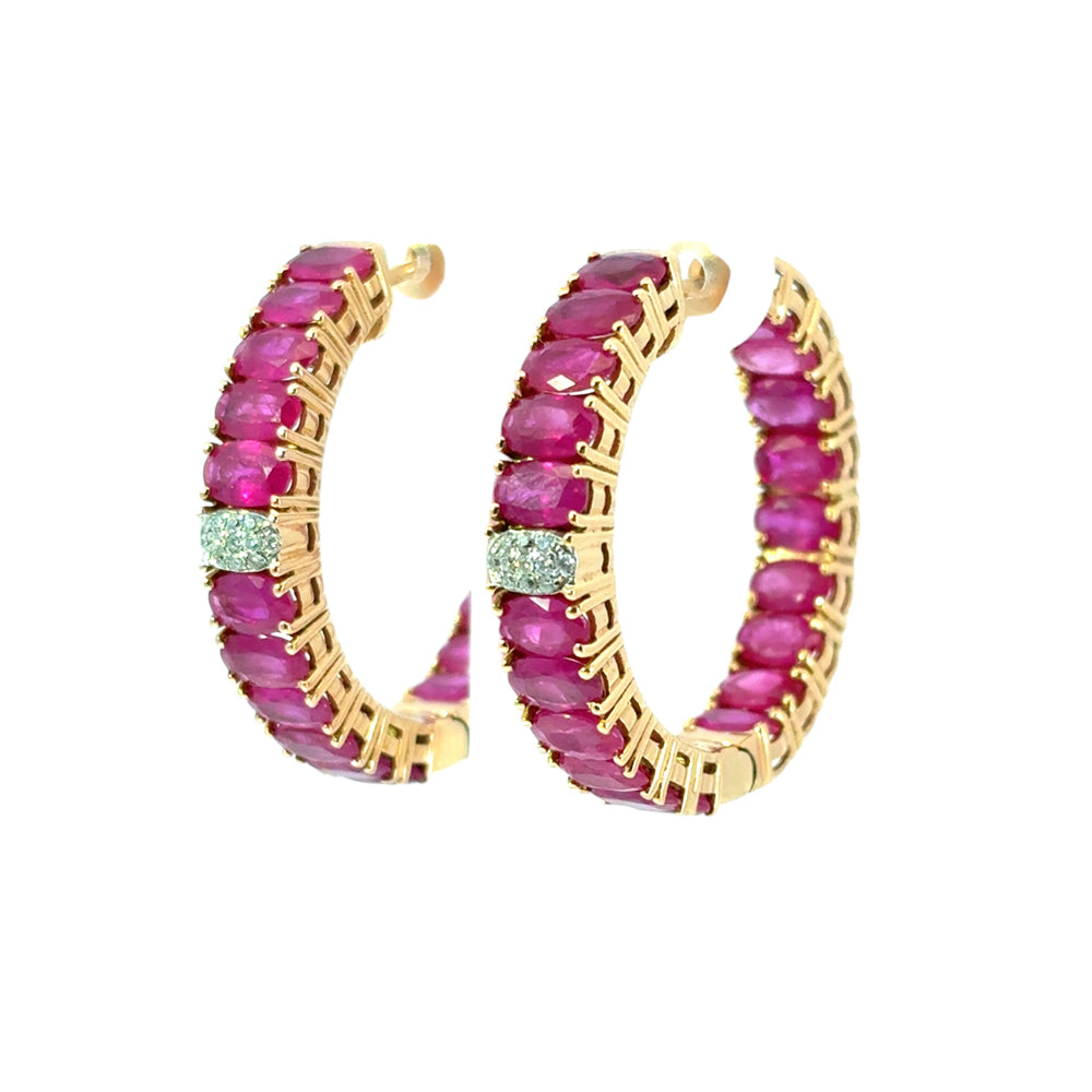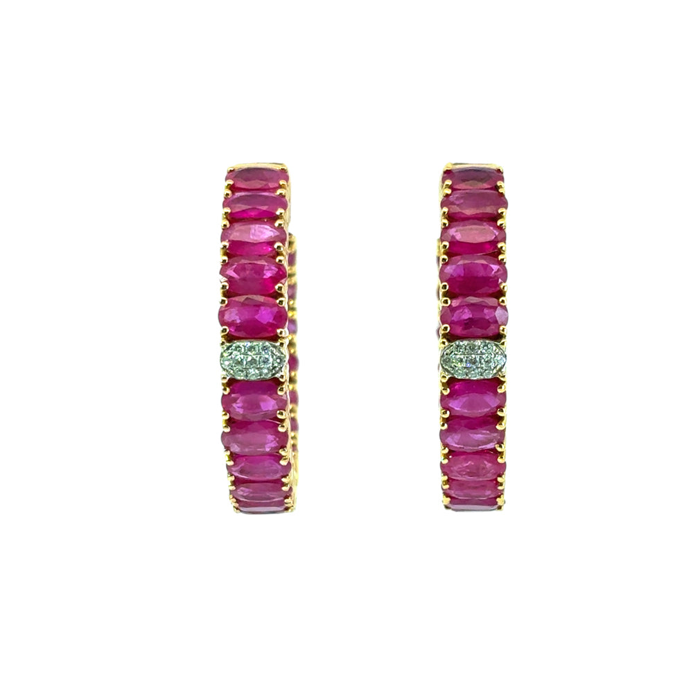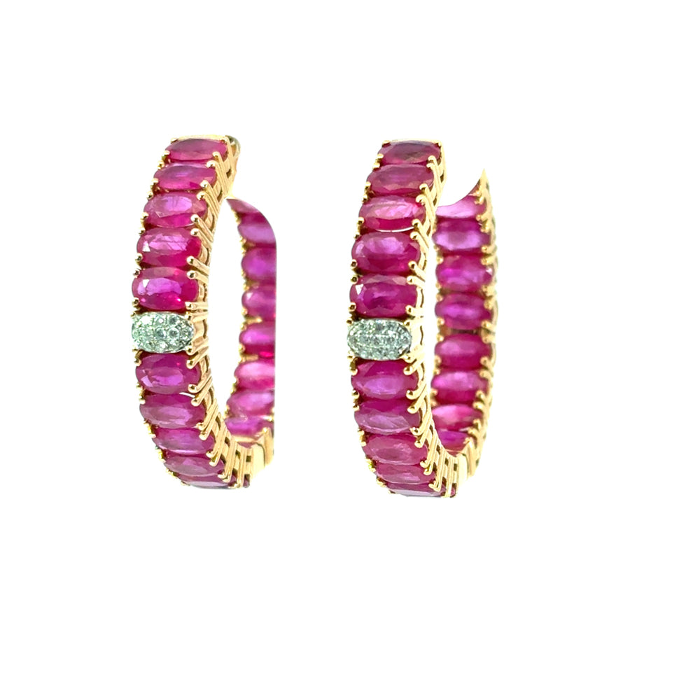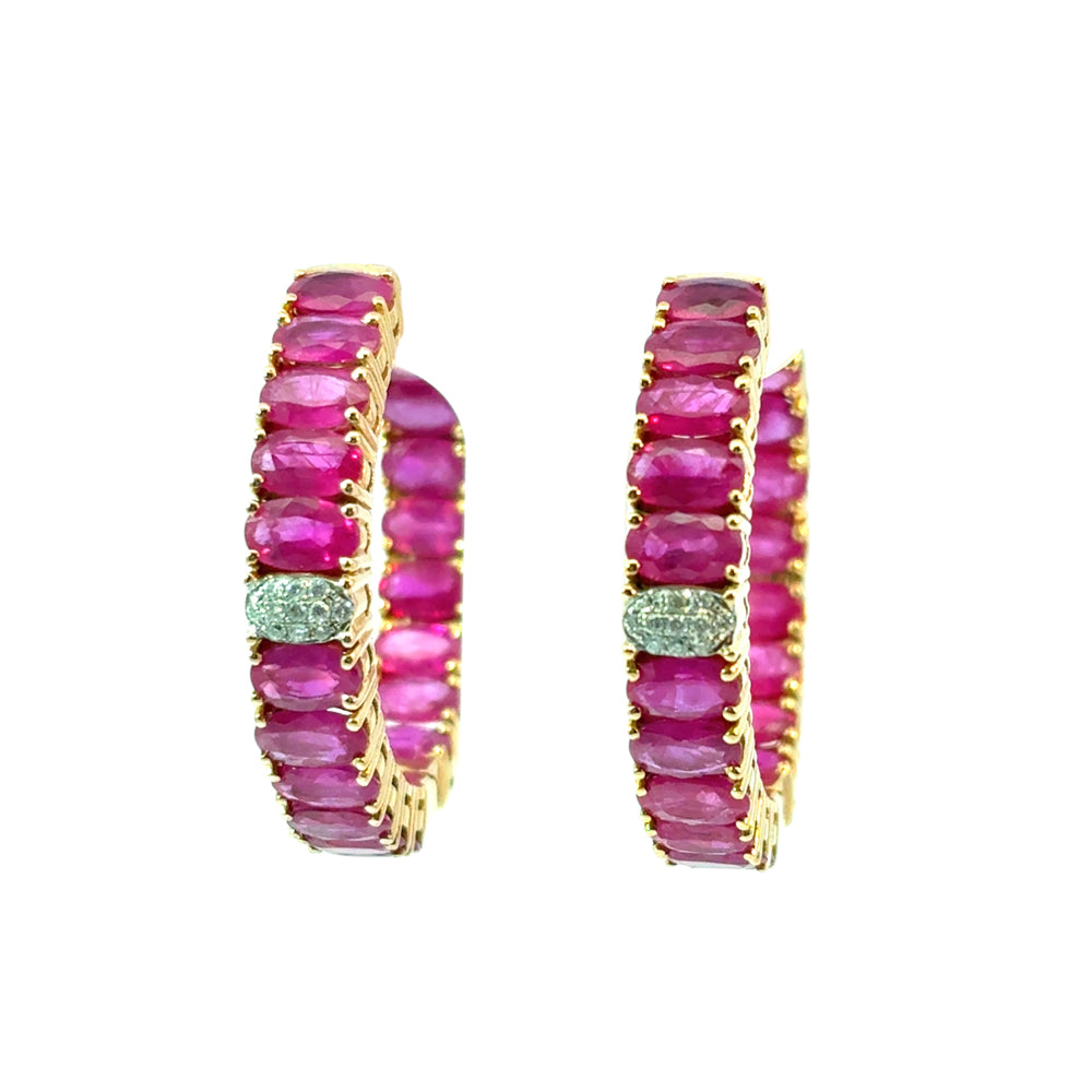 These hoop earrings have approximately 10 carats of Ruby Gemstones. Each gemstone is approximately 4.6mm in length, 3.00mm in width, and 2.1mm in depth. |