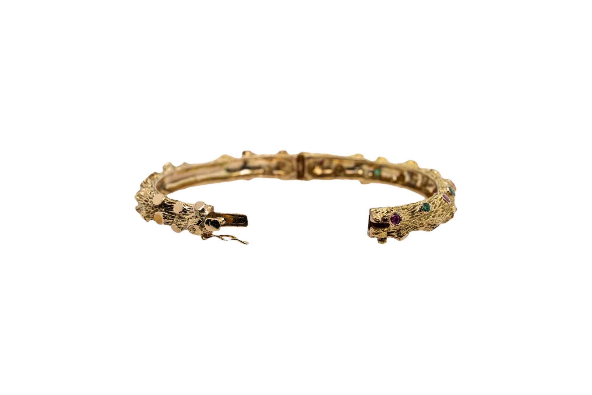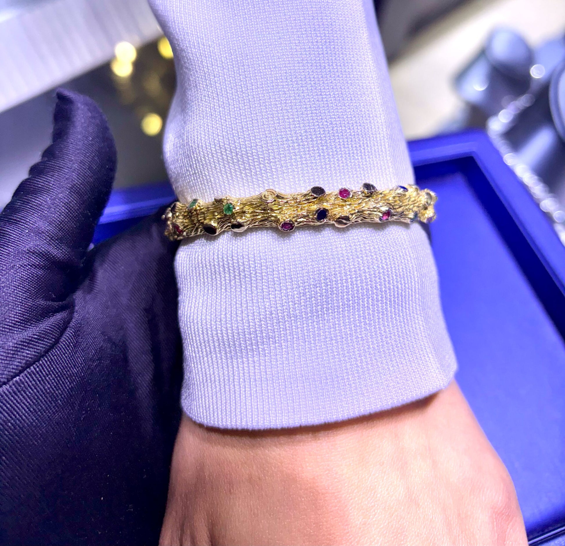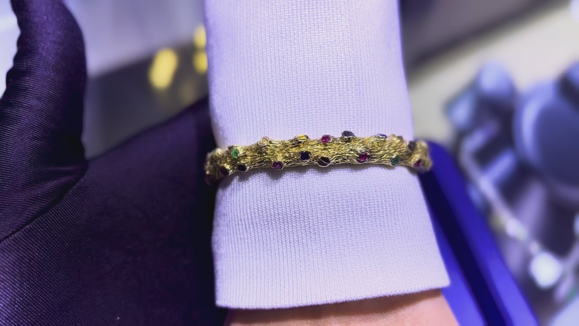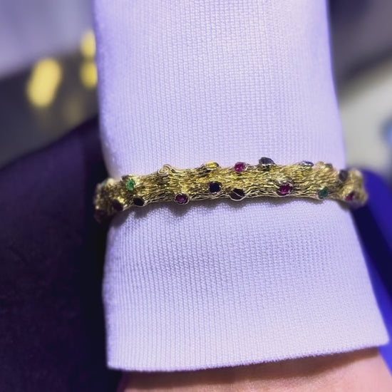 Make a powerful statement with this 14k Yellow Gold Bark Finish Bangle, a striking piece that blends natural texture with vibrant gemstones.