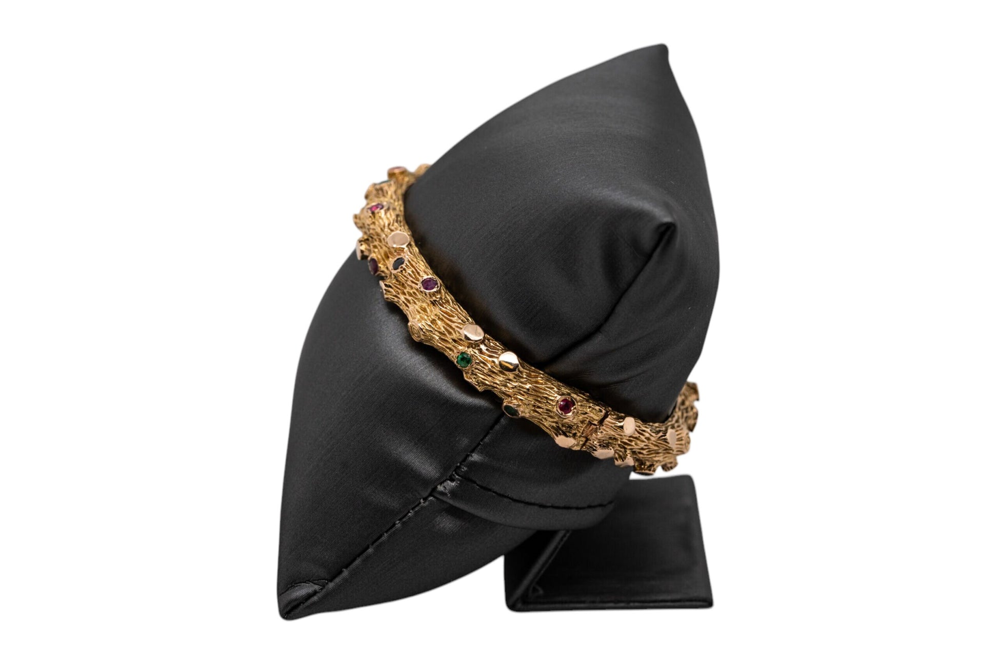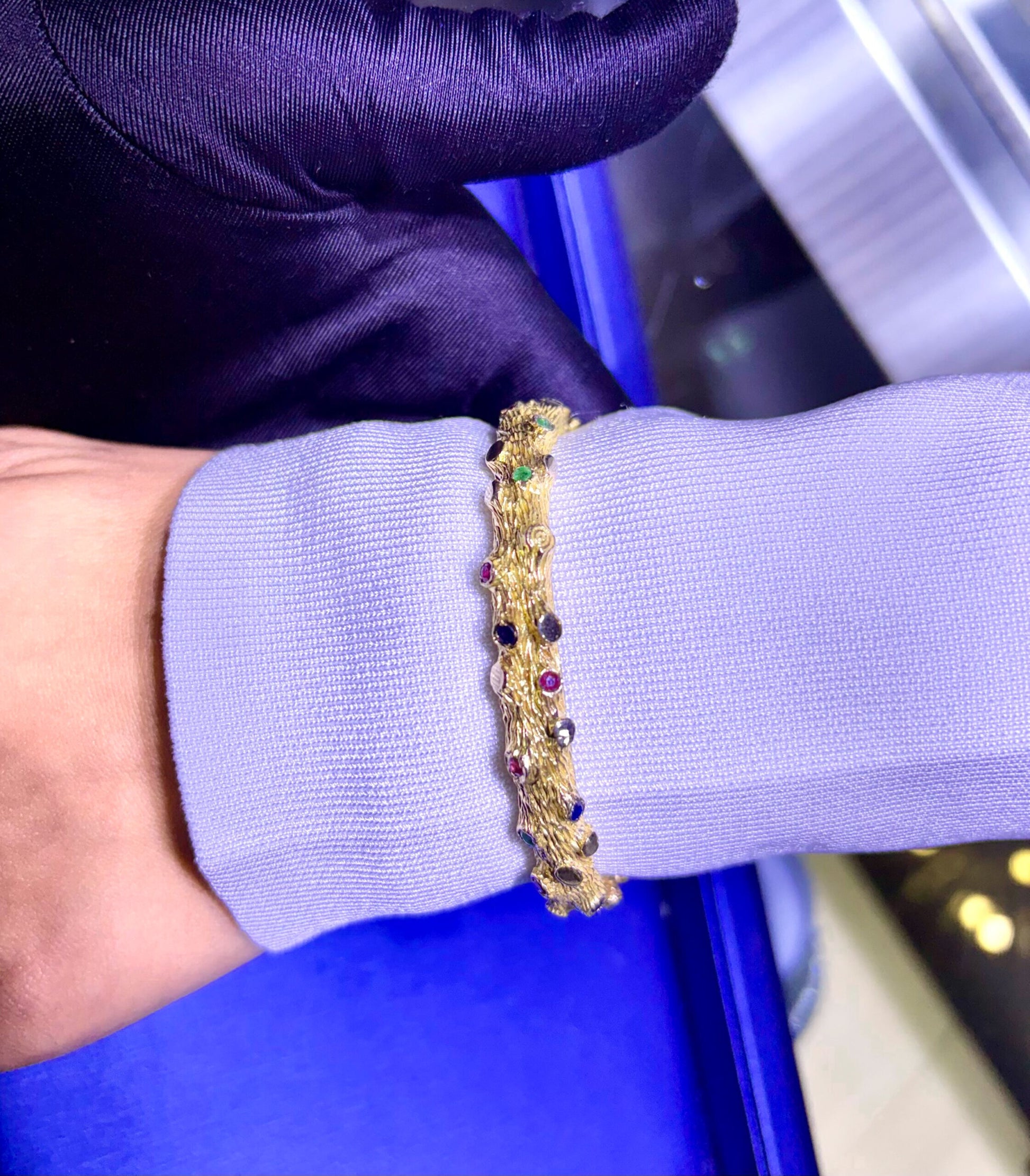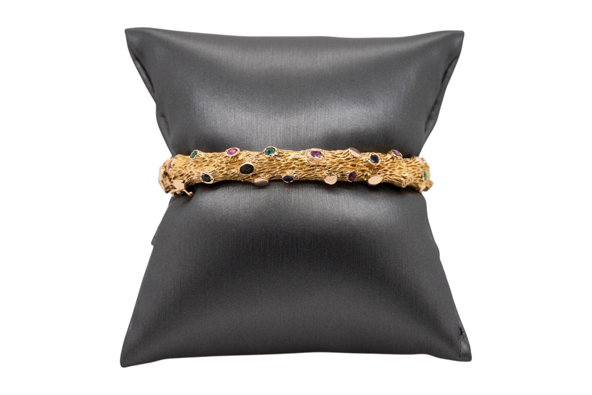 Make a powerful statement with this 14k Yellow Gold Bark Finish Bangle, a striking piece that blends natural texture with vibrant gemstones.