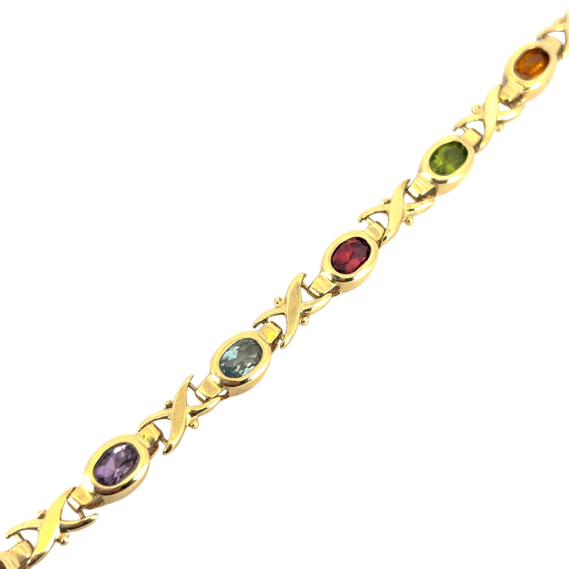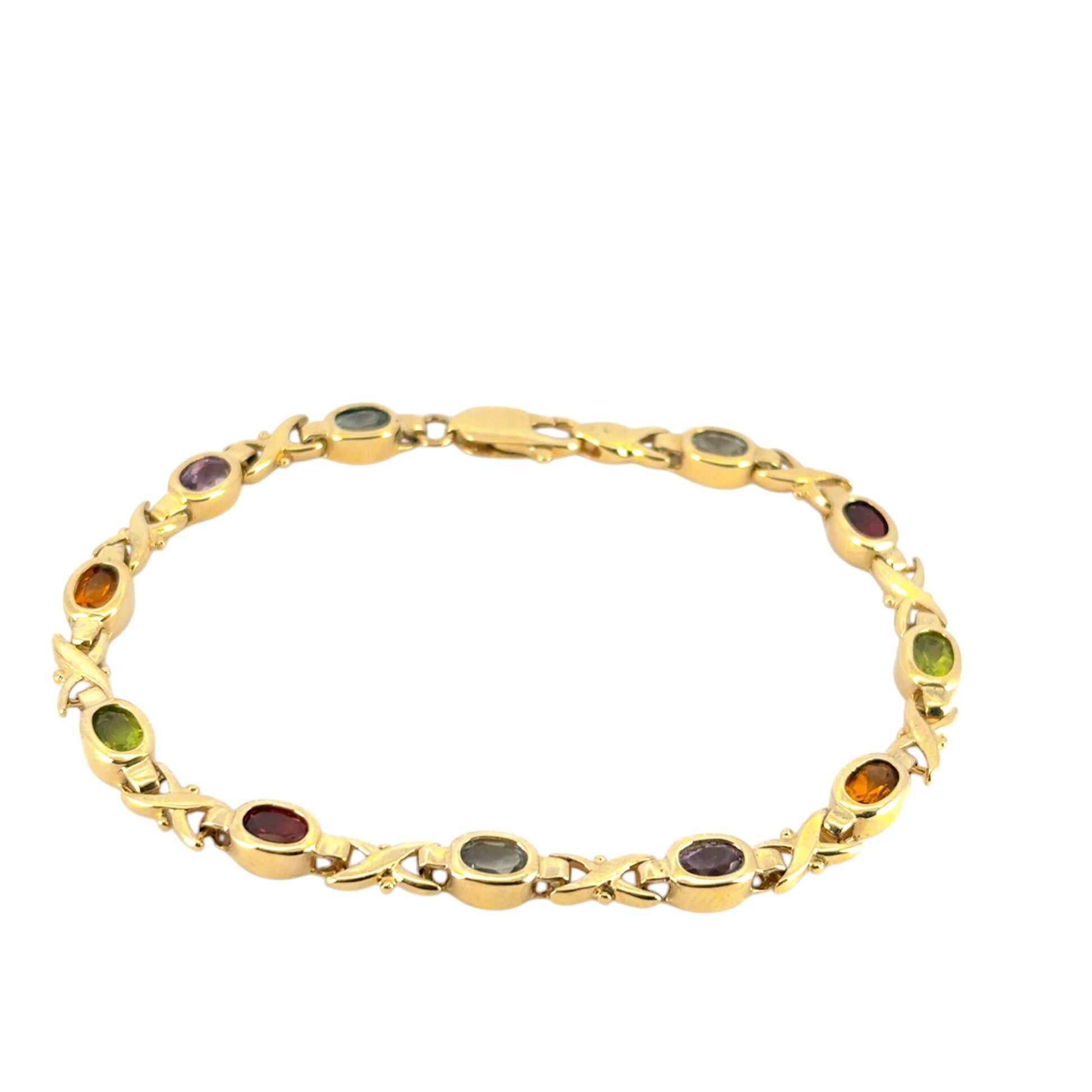 Add a touch of vibrant charm to your collection with this exquisite 14k Yellow Gold “X” Bracelet, featuring a striking series of eleven oval cut colored gemstones.