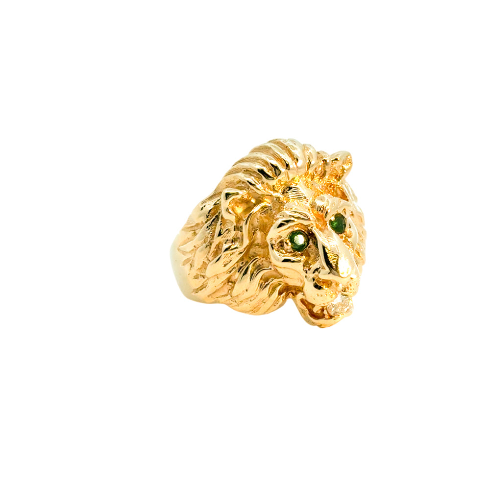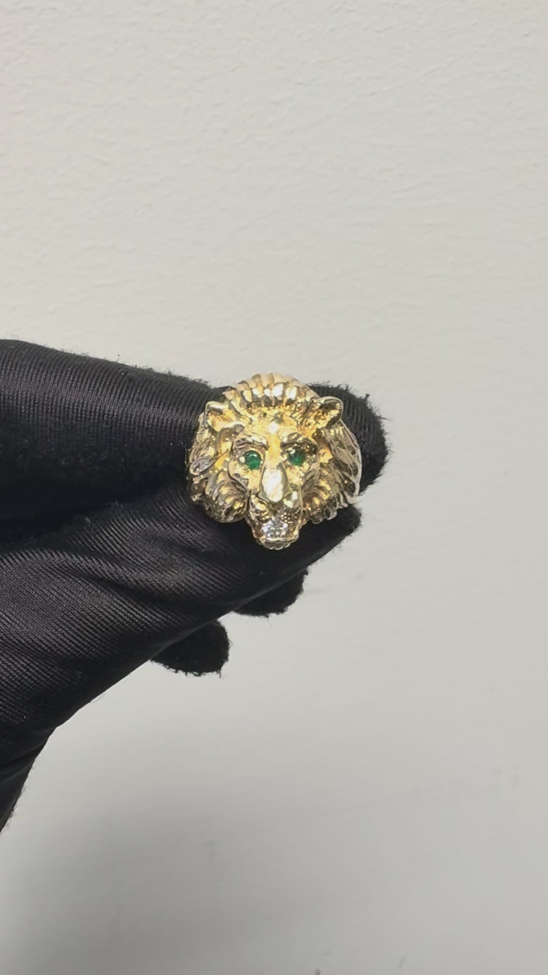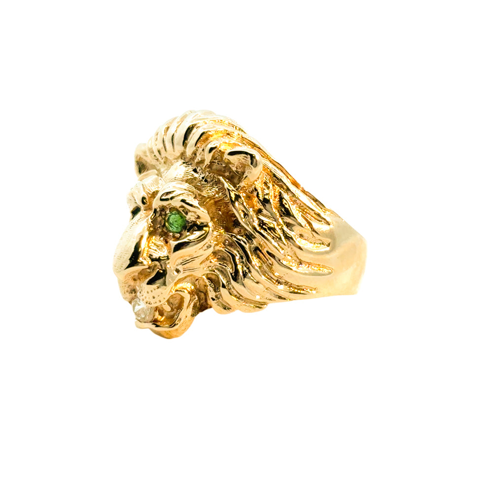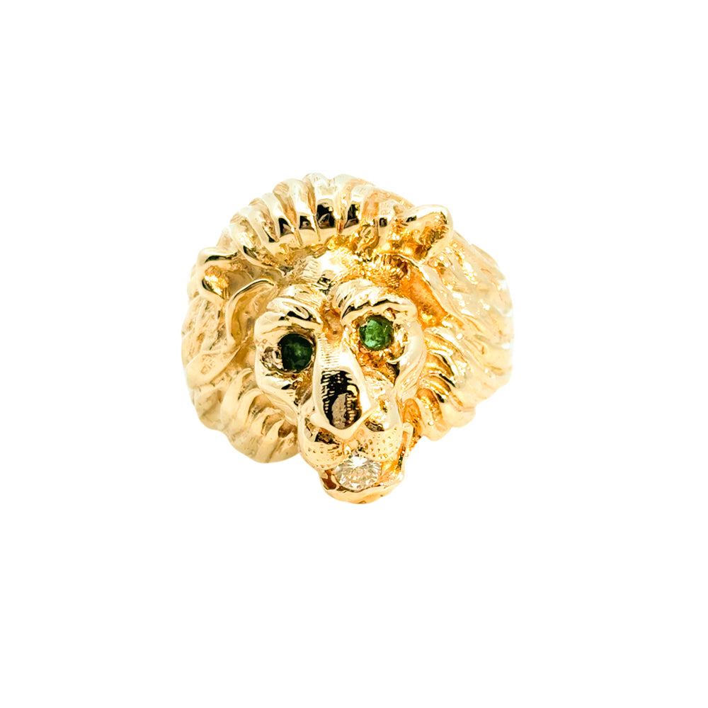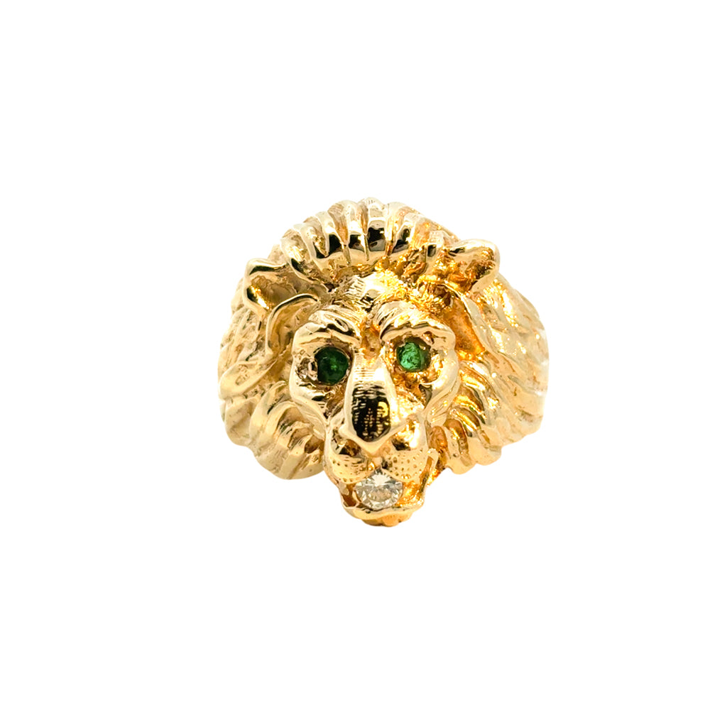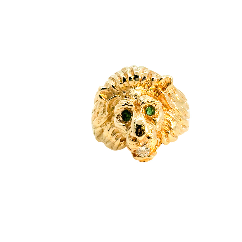 14k Yellow Gold Lion's Head Ring with Emerald Eyes and One Round Diamond in Mouth