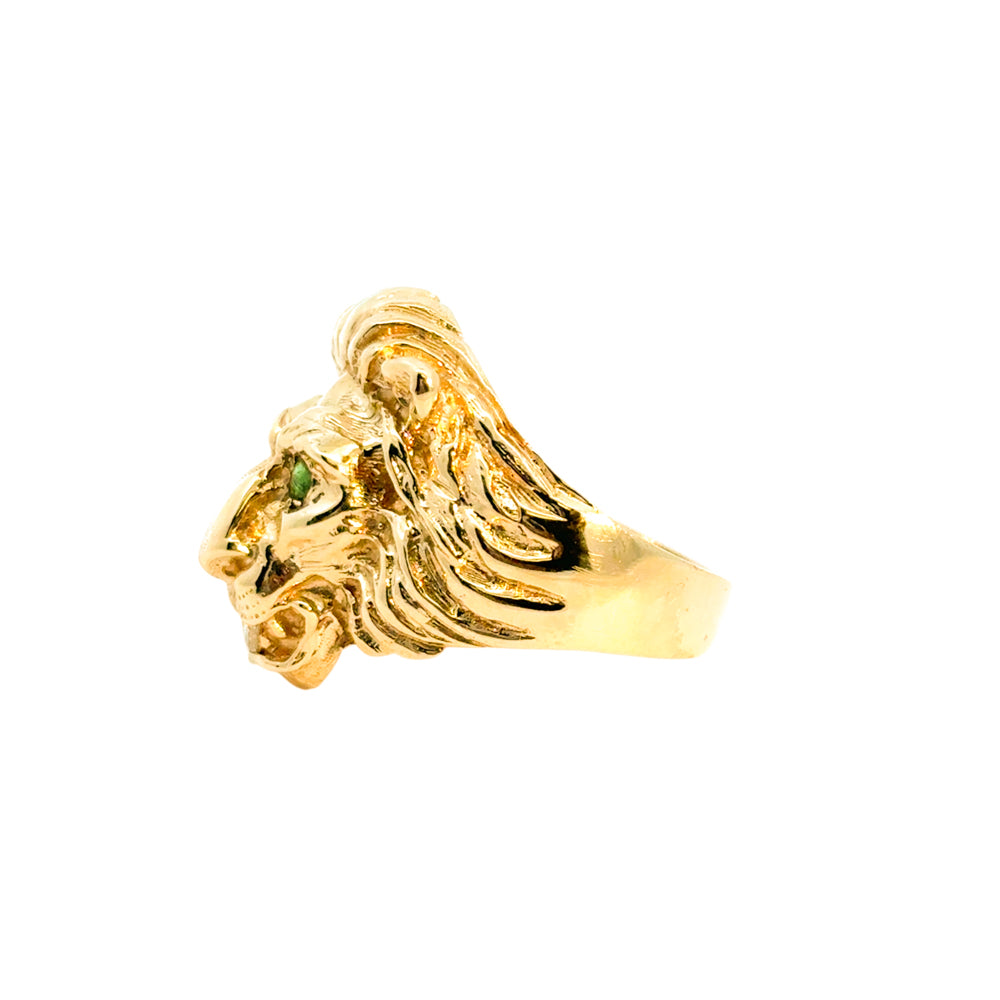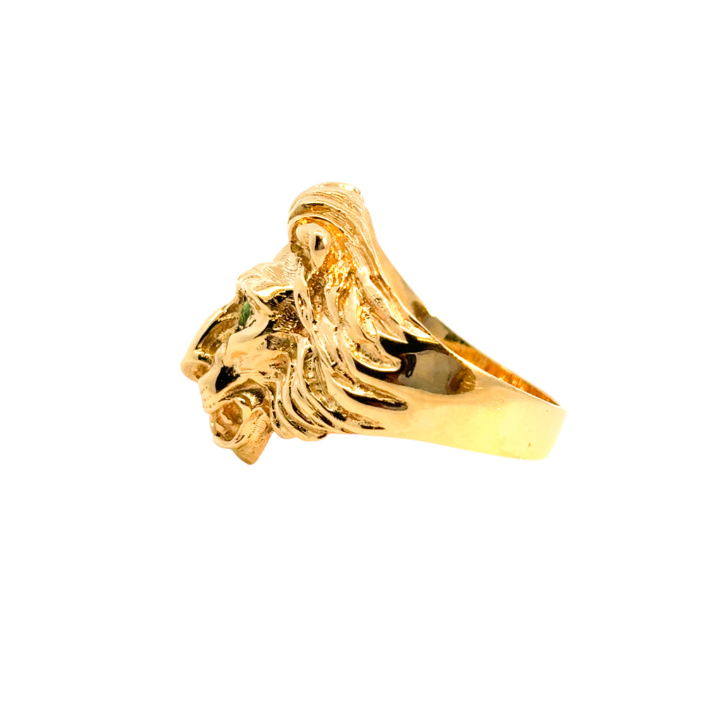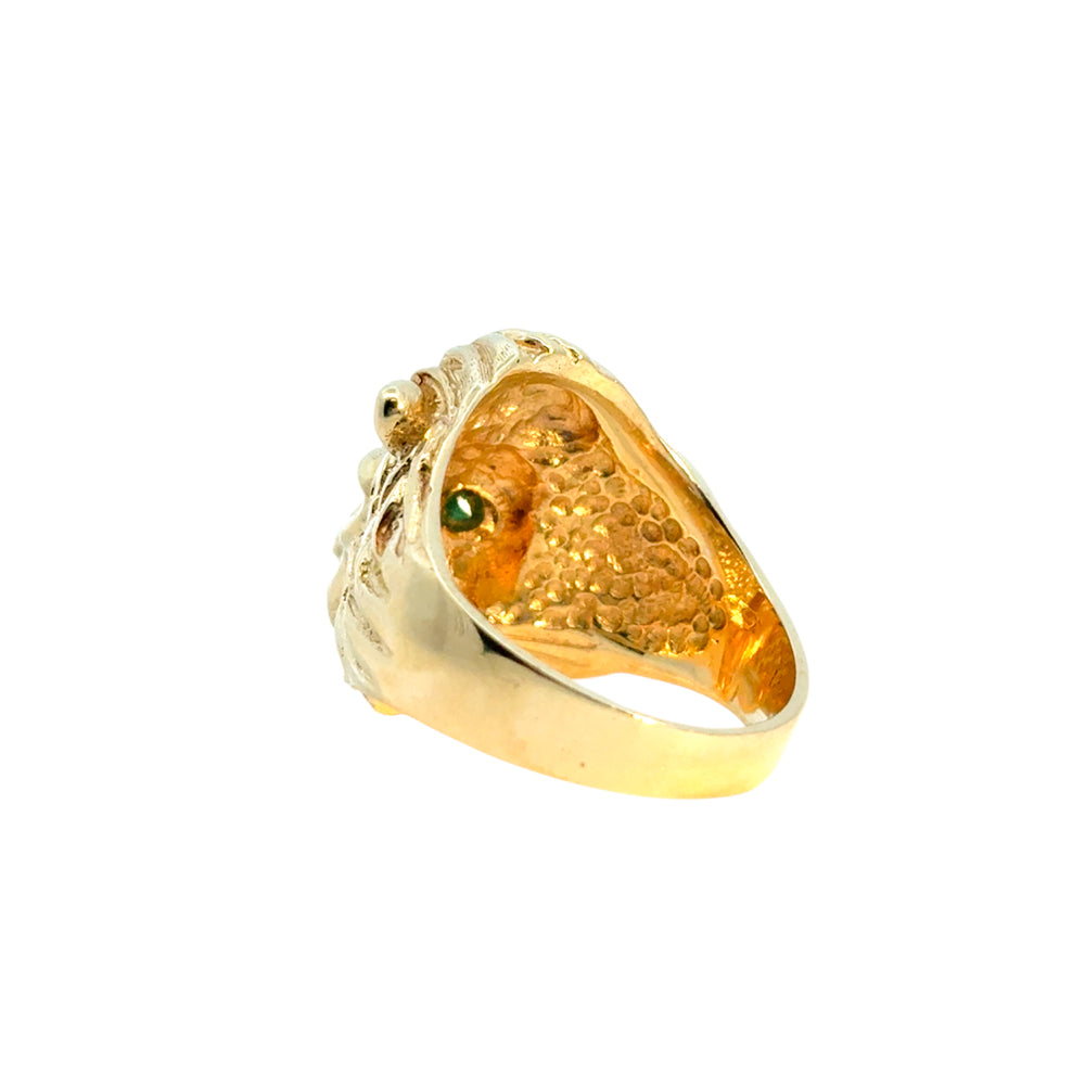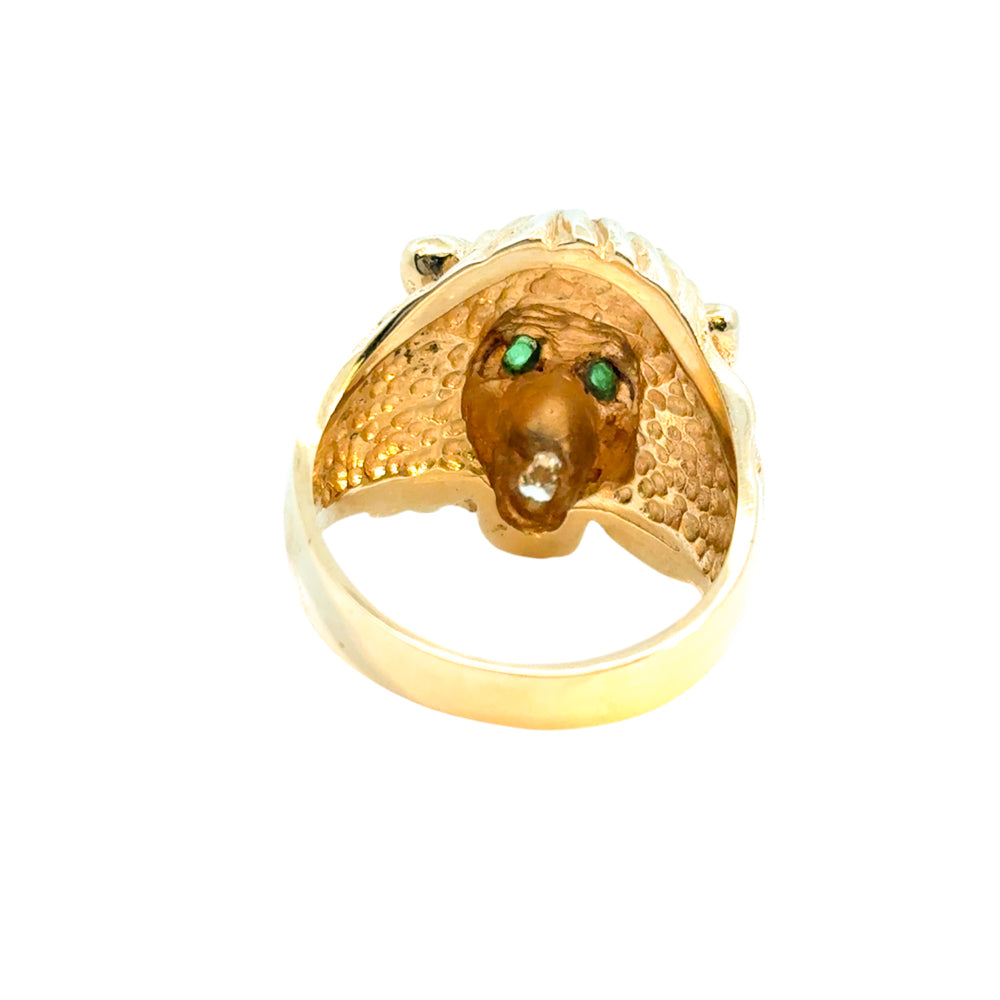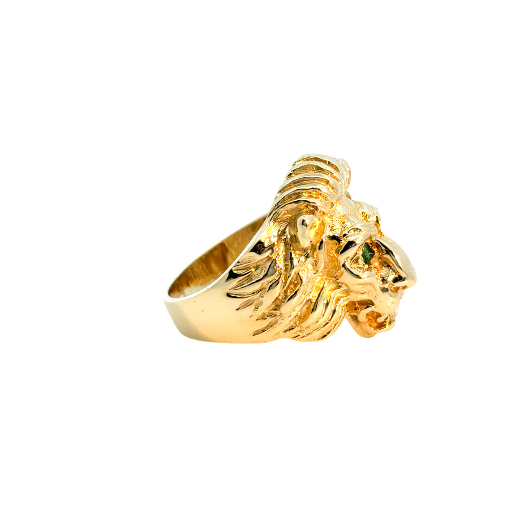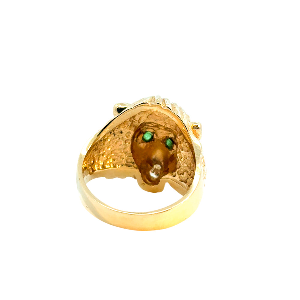 14k Yellow Gold Lion's Head Ring with Emerald Eyes and One Round Diamond in Mouth