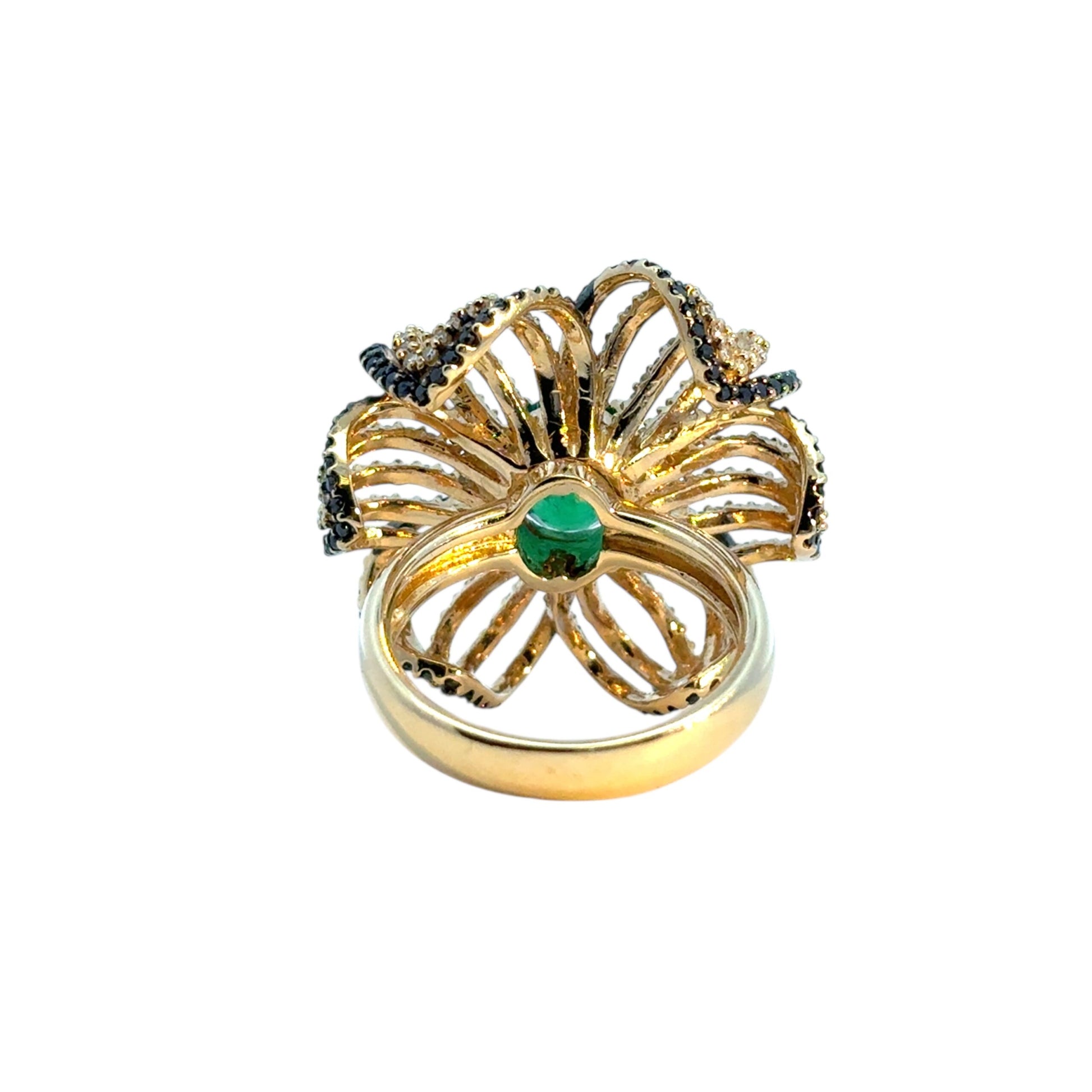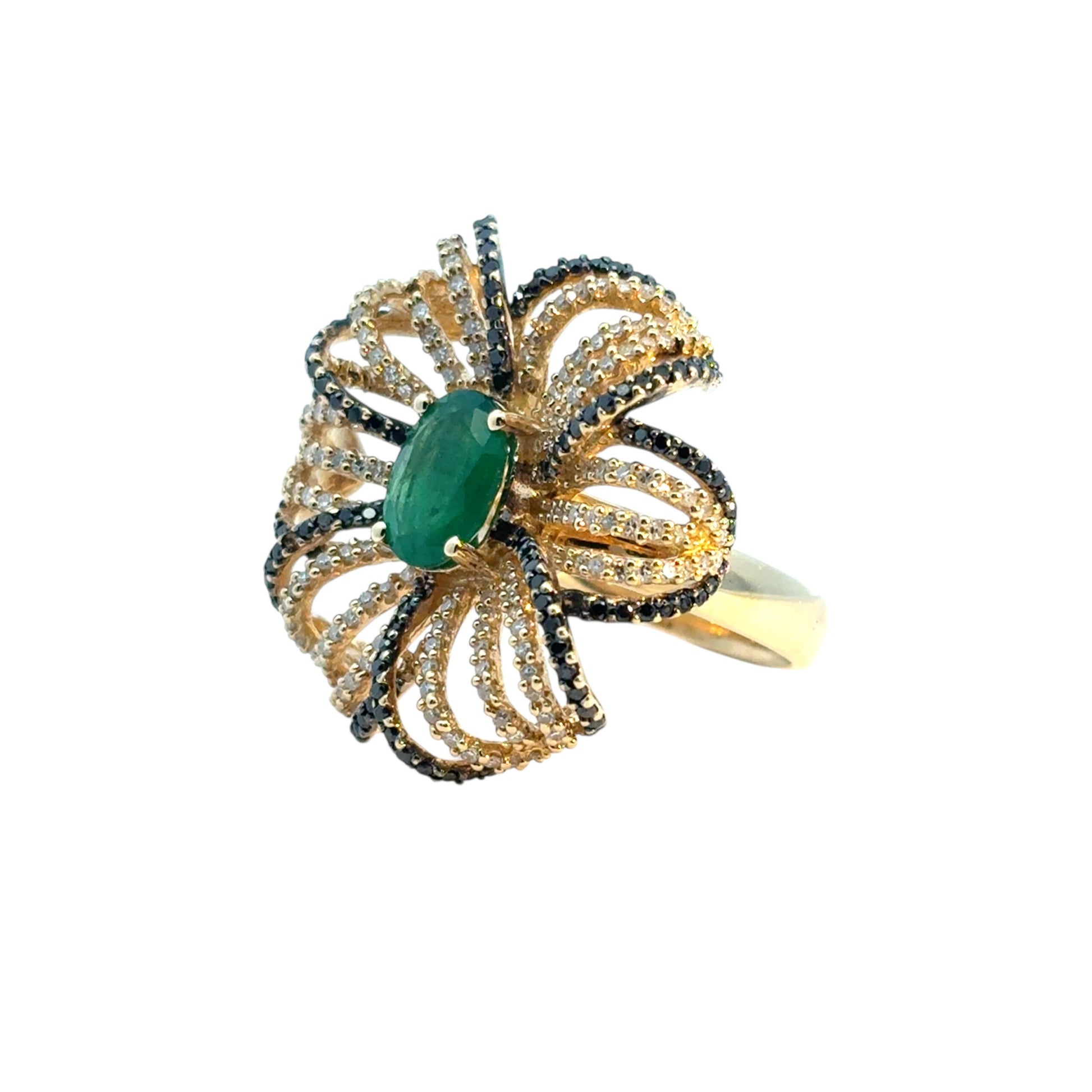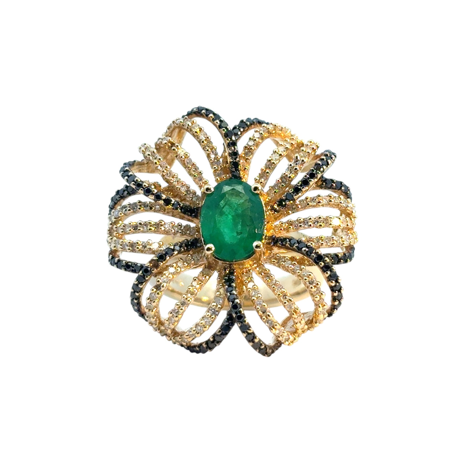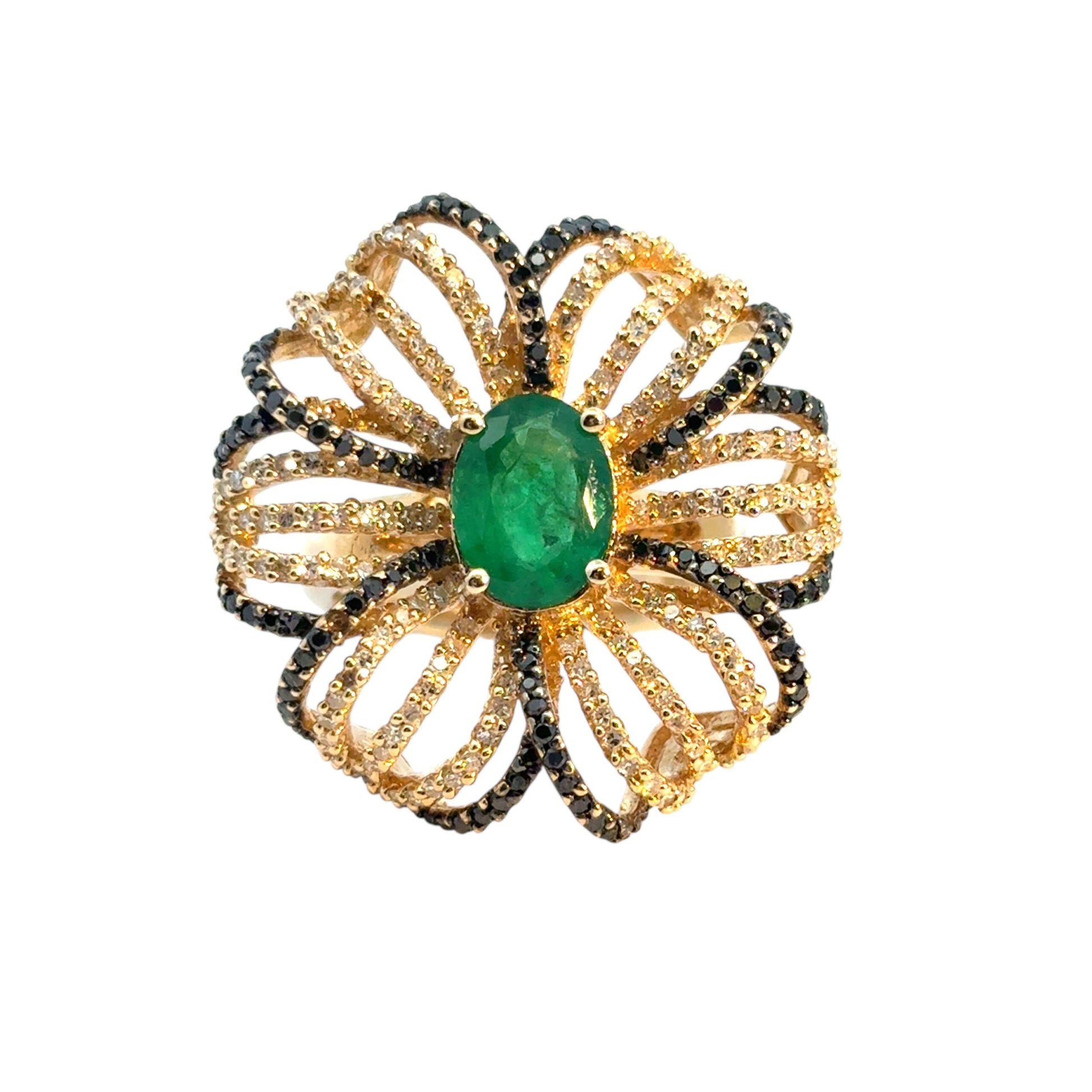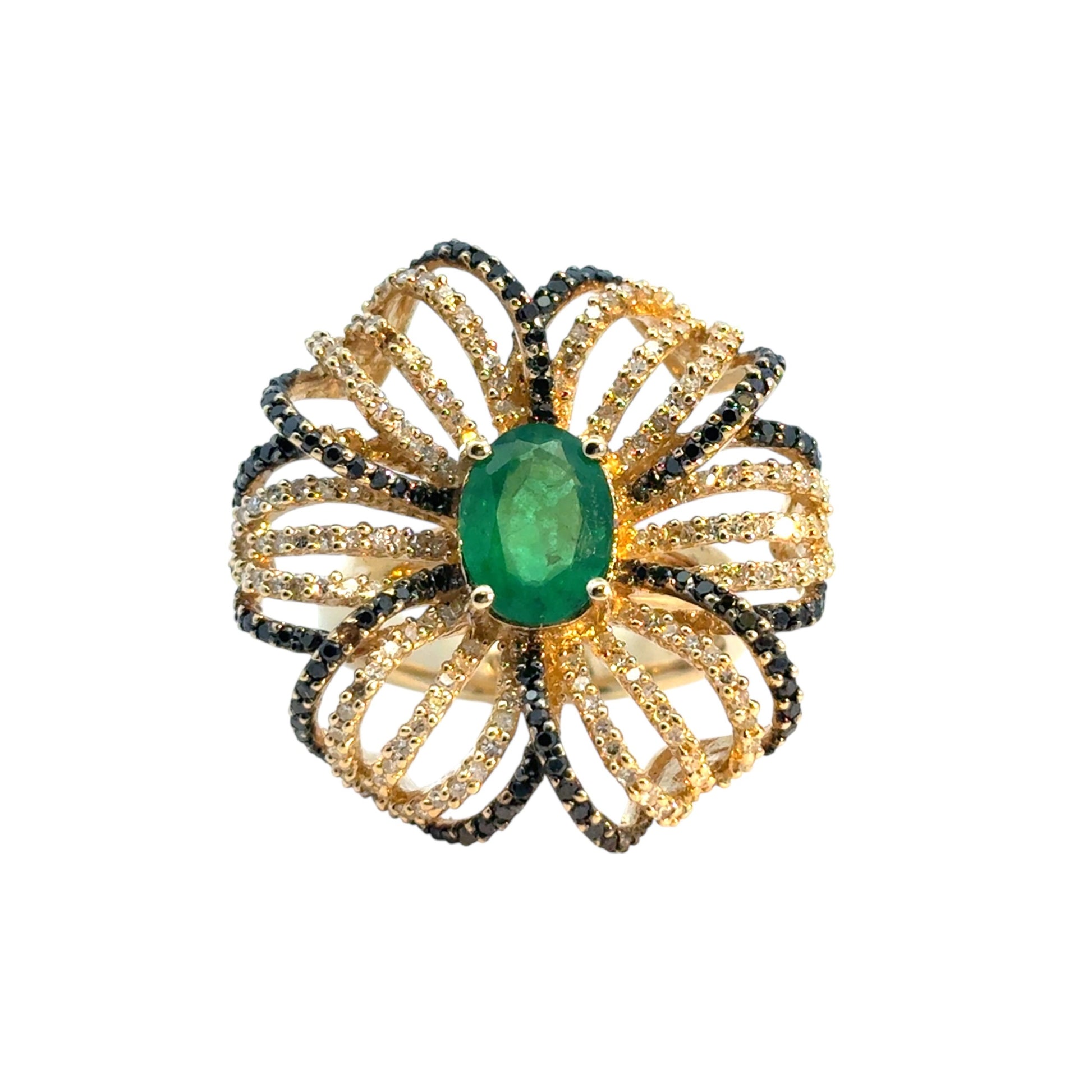 14k Yellow Gold Oval Emerald and Black and White Diamond Flower Ring