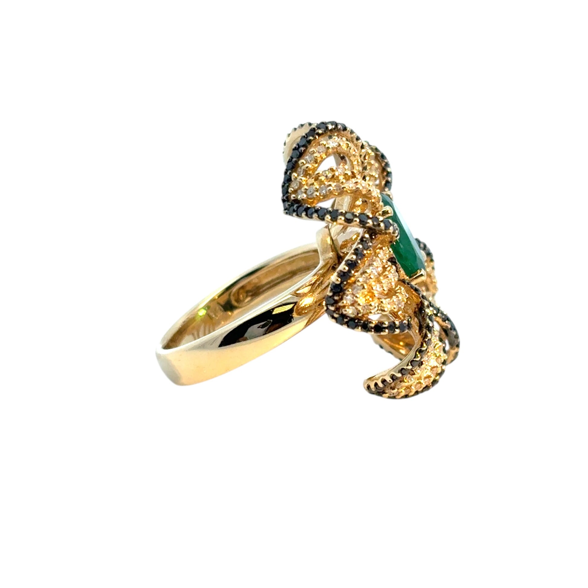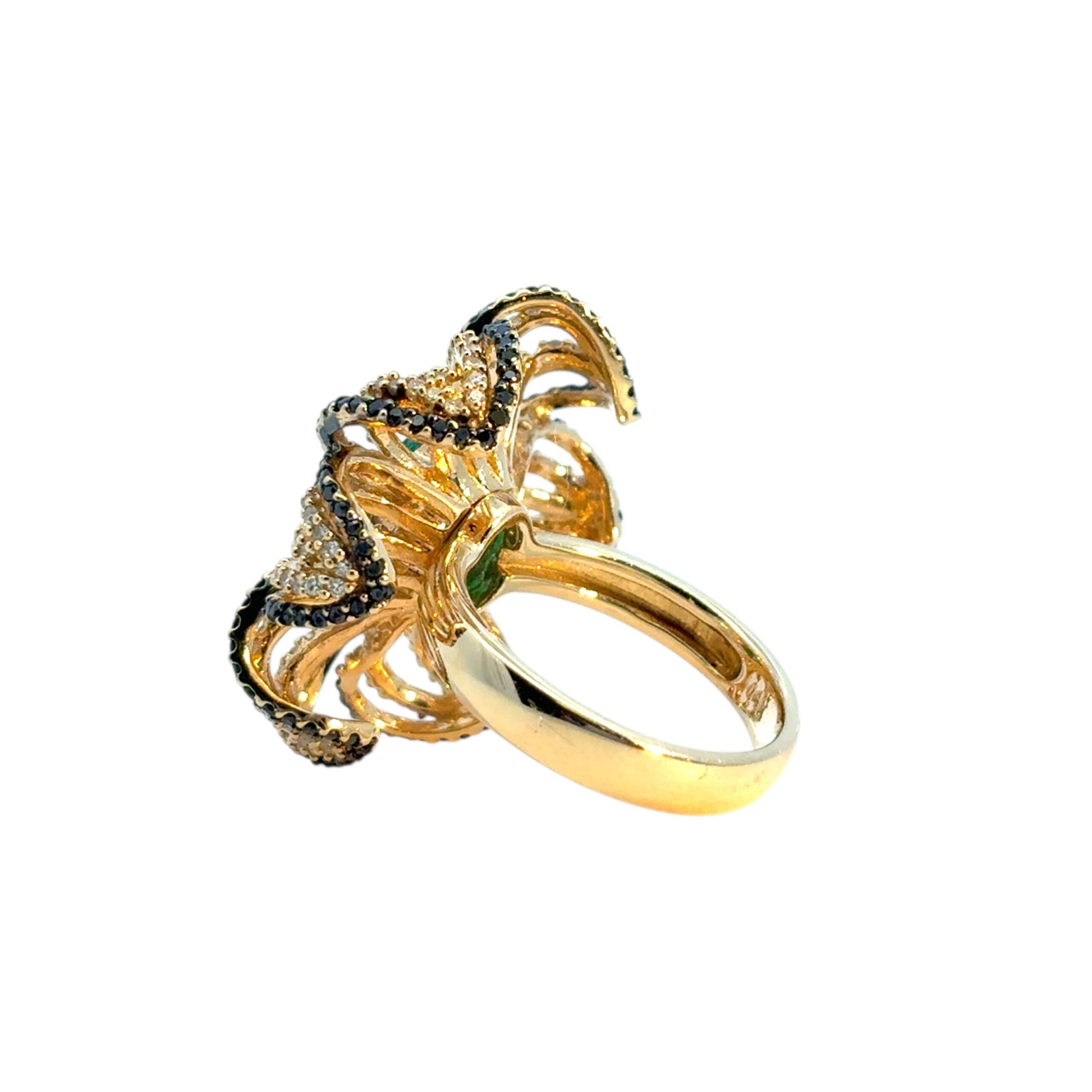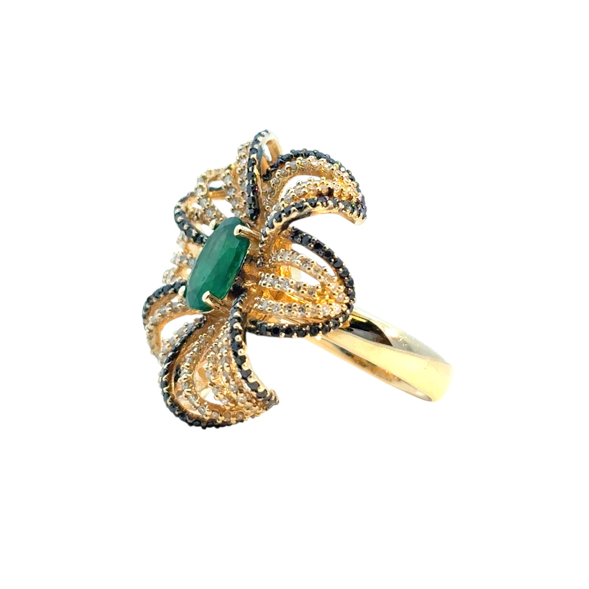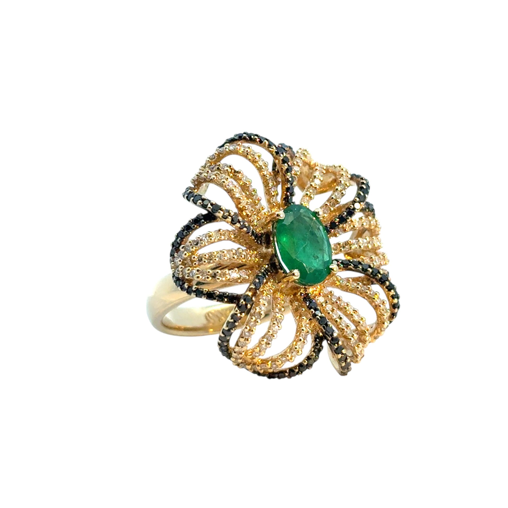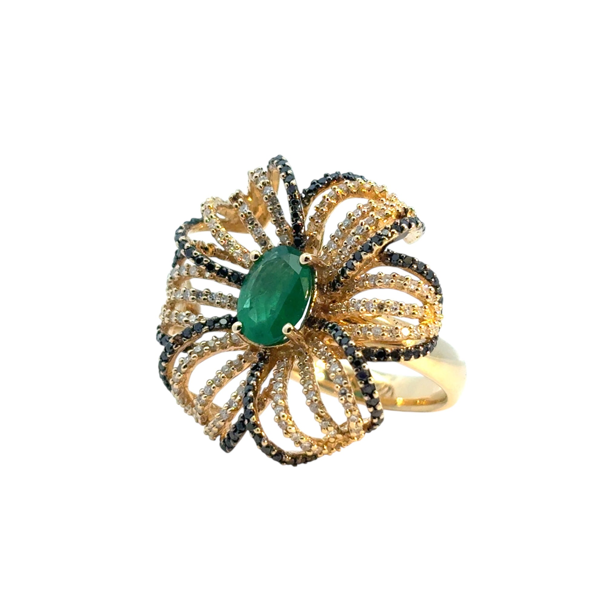 14k Yellow Gold Oval Emerald and Black and White Diamond Flower Ring