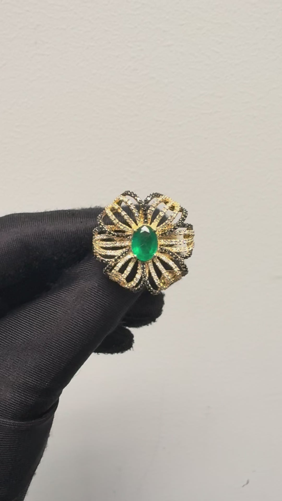 At its heart, the ring features a stunning natural oval-cut emerald measuring approximately 8.5 mm x 6.5 mm. Surrounding it, approximately 2 carats of natural round black and white diamonds form an intricate floral design, adding depth, contrast, and radiant sparkle.