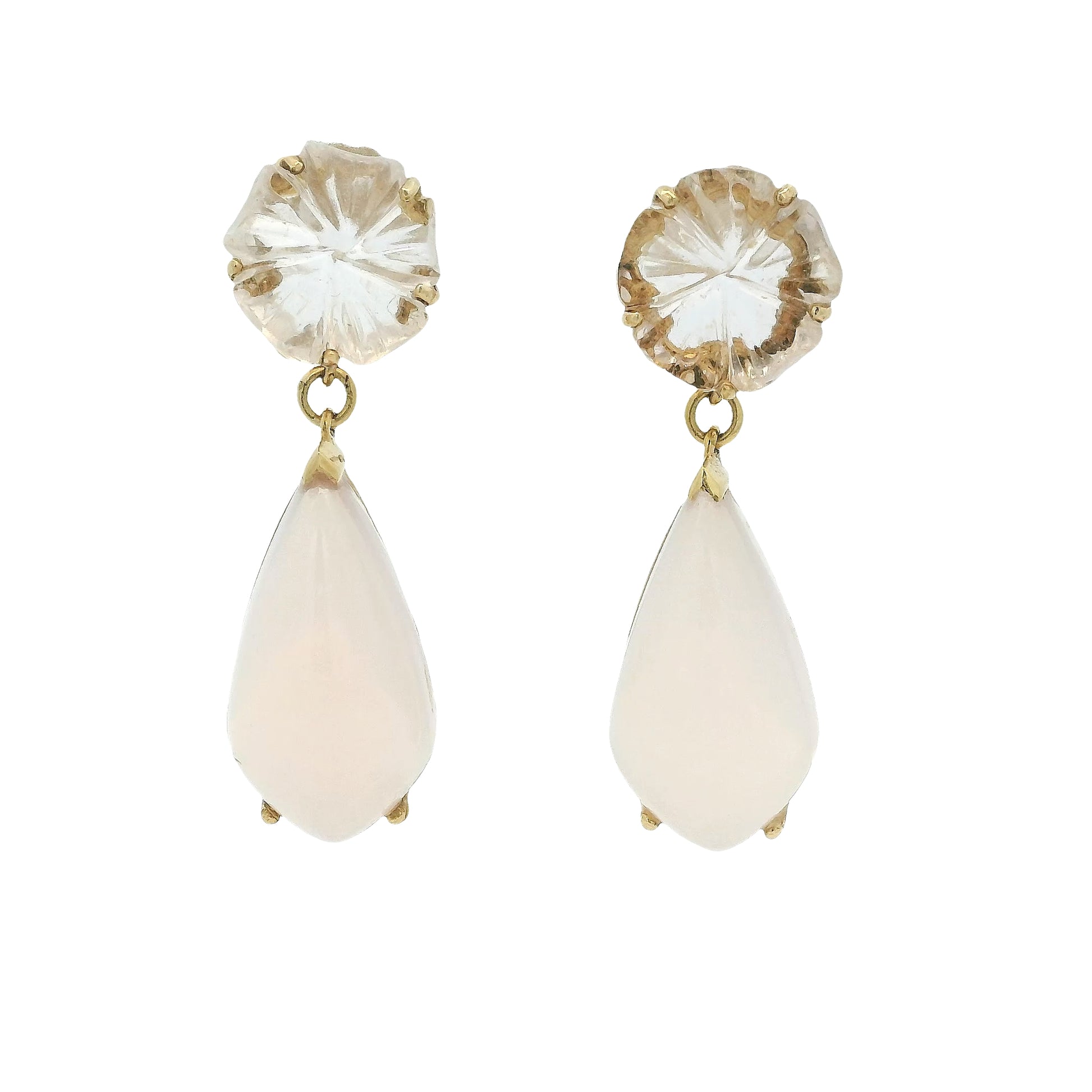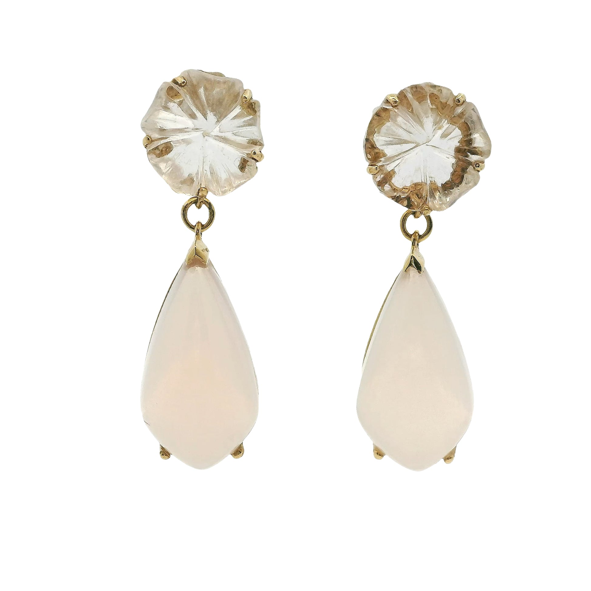 Gemstone Details | Each earring features two natural Rose White Quartz stones—one intricately carved into a floral motif, and the other in a graceful pear cut for added movement and shimmer. |