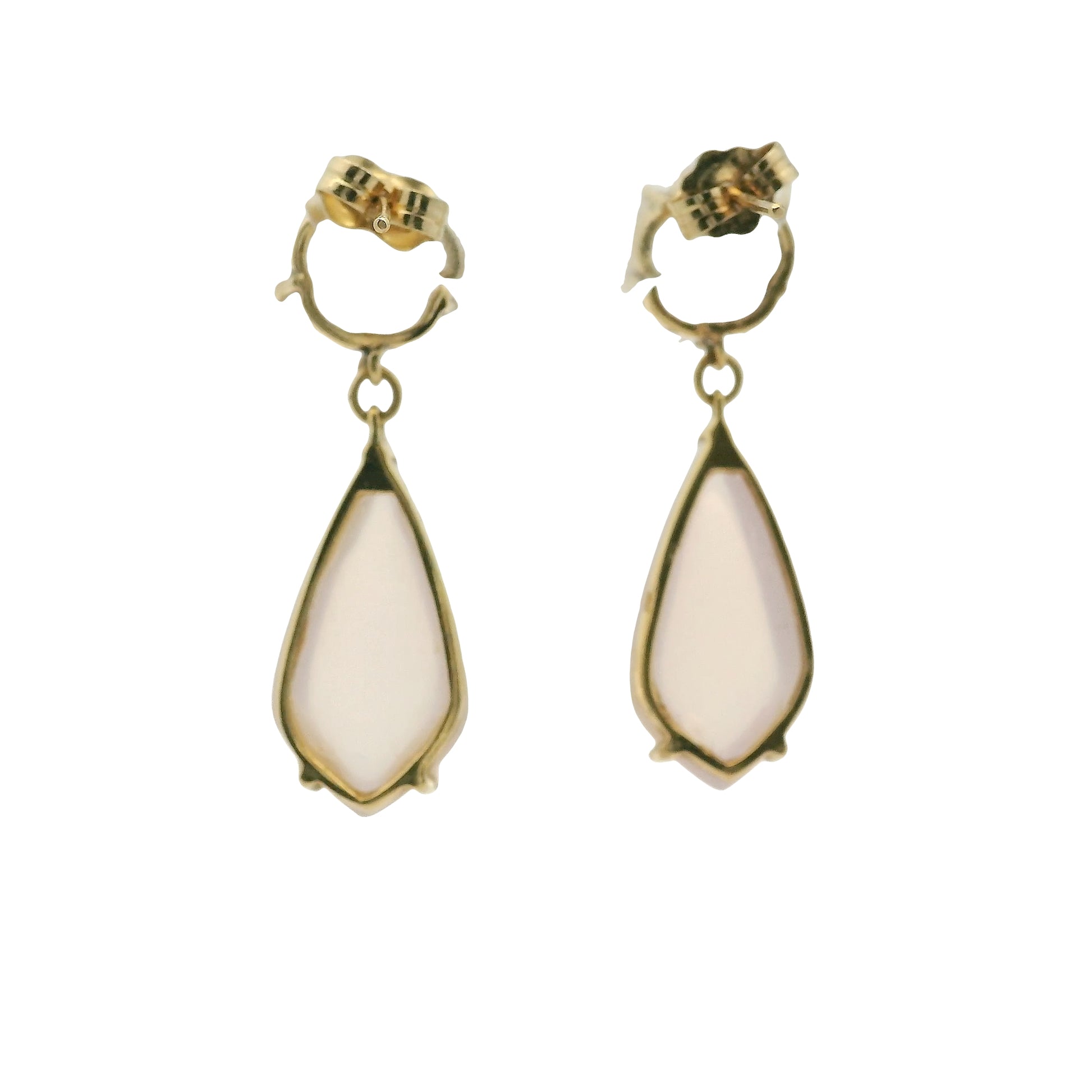 Delicate, luminous, and undeniably romantic, these 14k Yellow Gold Dangle Earrings feature a soft feminine palette of Rose White Quartz in two striking cuts.