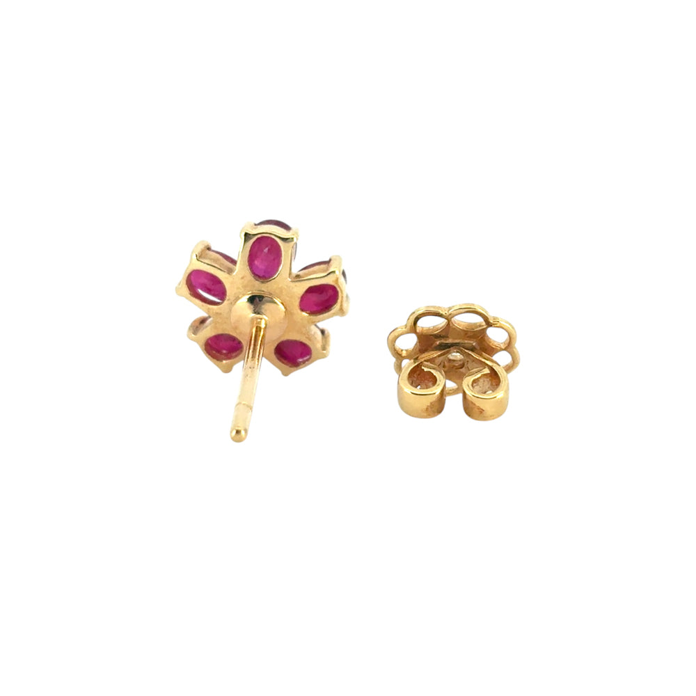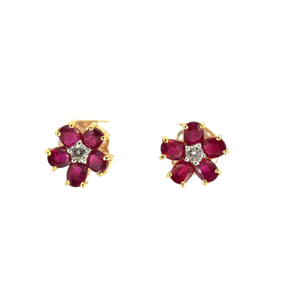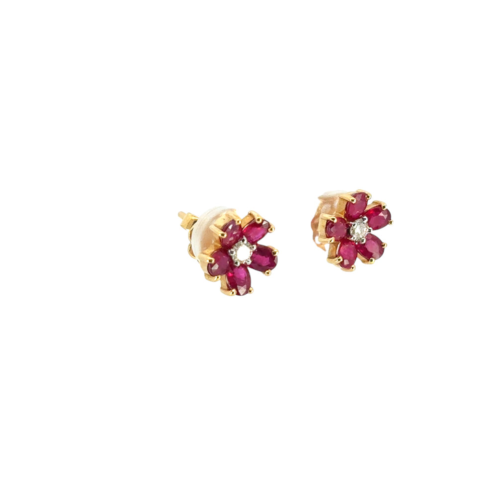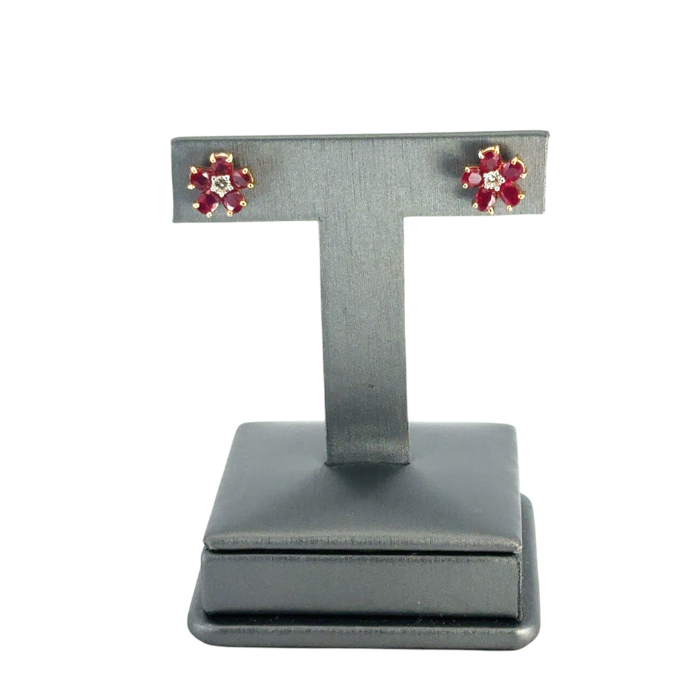 Crafted in radiant 14k yellow gold, these stud earrings feature a charming floral design adorned with approximately 1.2 carats of vibrant rubies (10 total) and accented by 0.11 carats of sparkling diamonds (2 total) at the center of each bloom.
