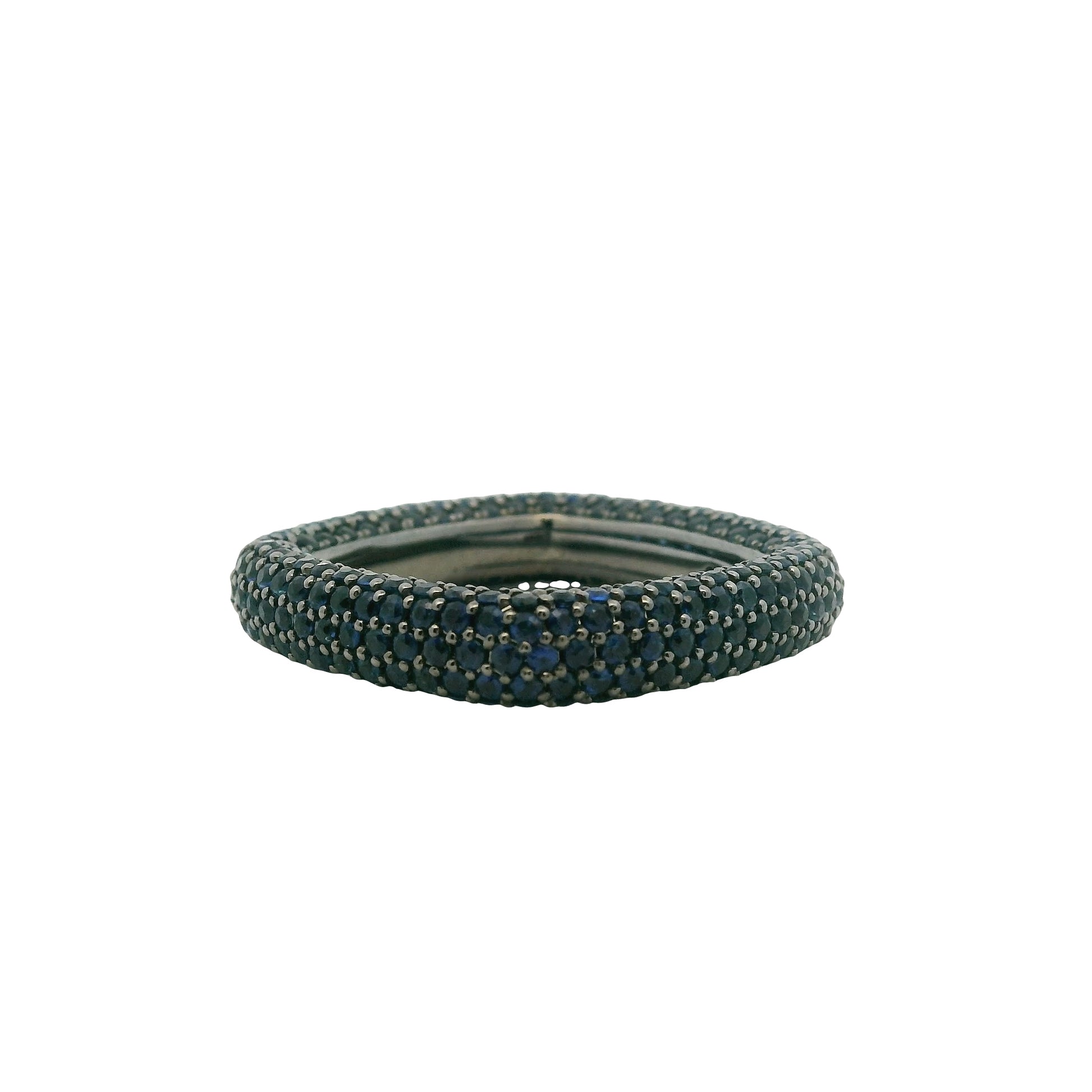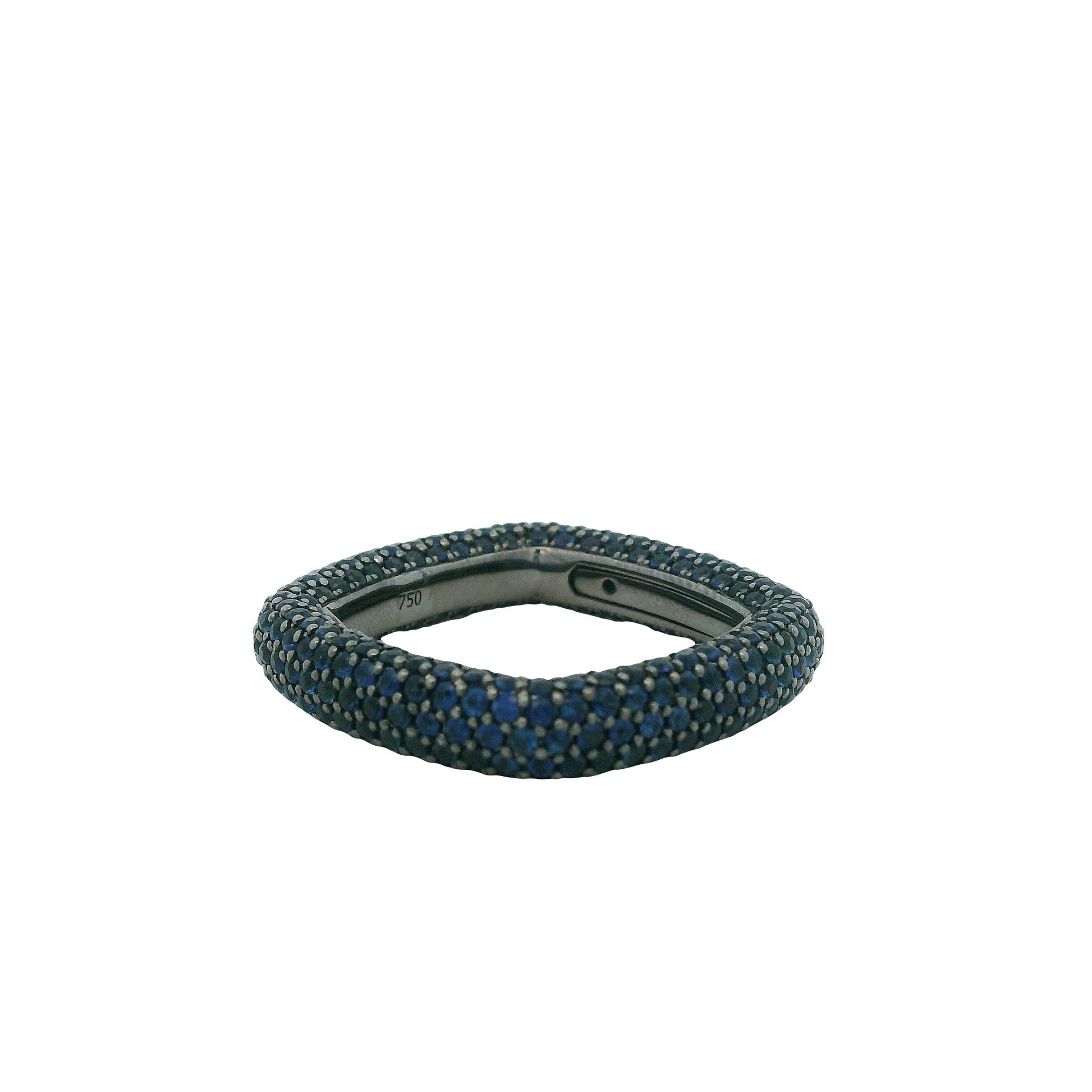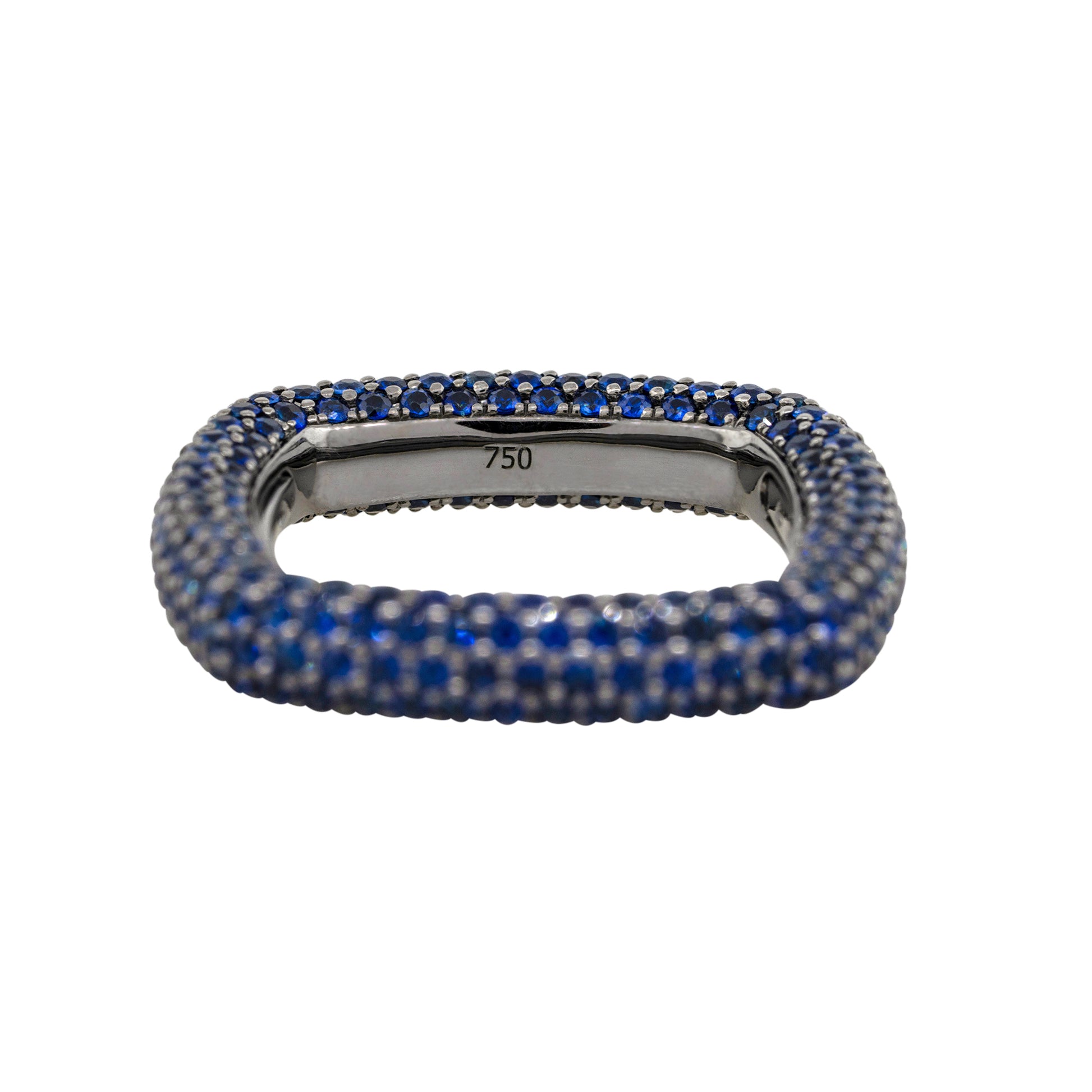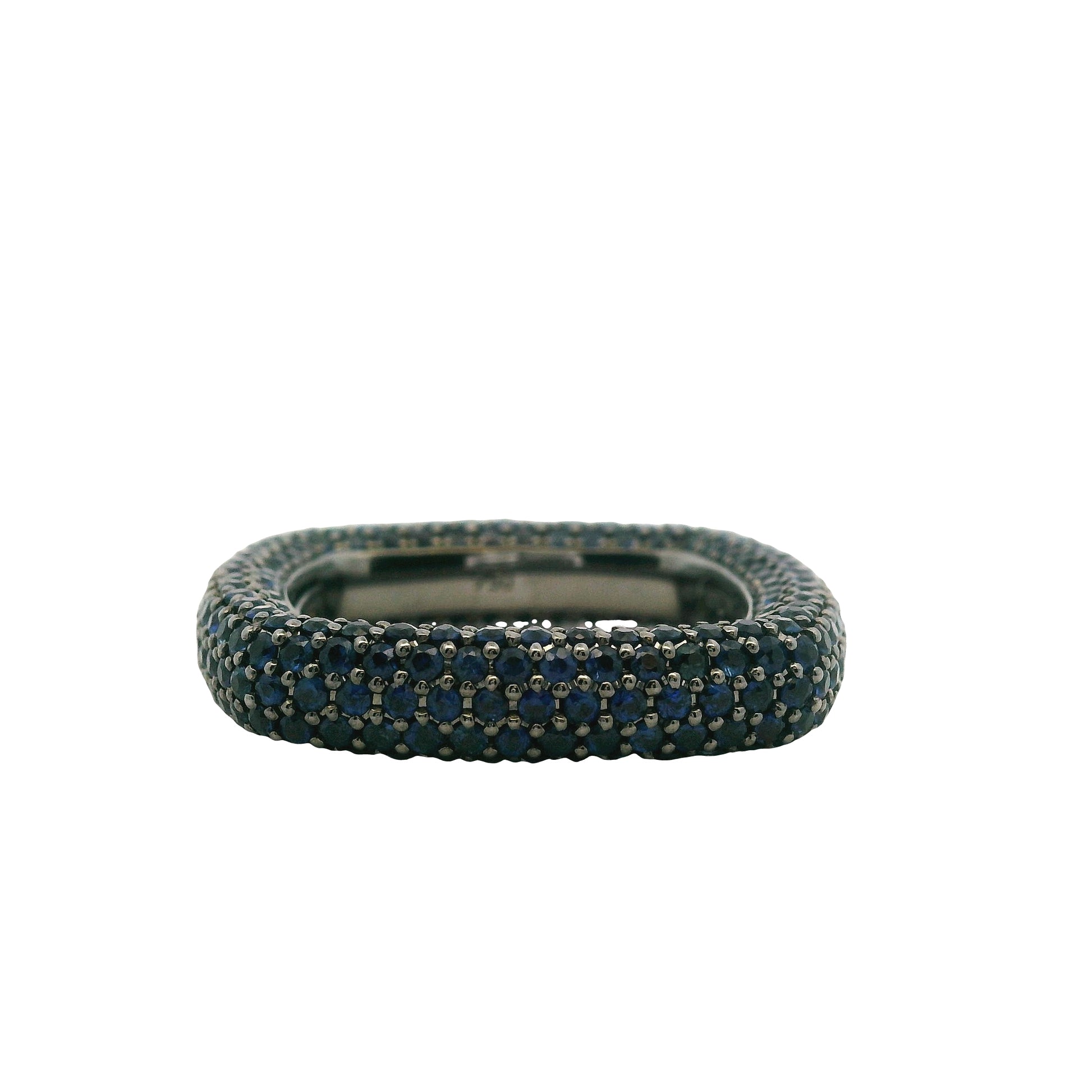 Expert jewelers crafted this ring in radiant 18k black gold, shaping it into a sleek, modern square silhouette. Then, they adorned it with approximately 4.01 carats of natural blue sapphires, each one meticulously pave-set to form a surface of uninterrupted brilliance. As a result, the ring dazzles from every angle, reflecting light with unmatched intensity.
