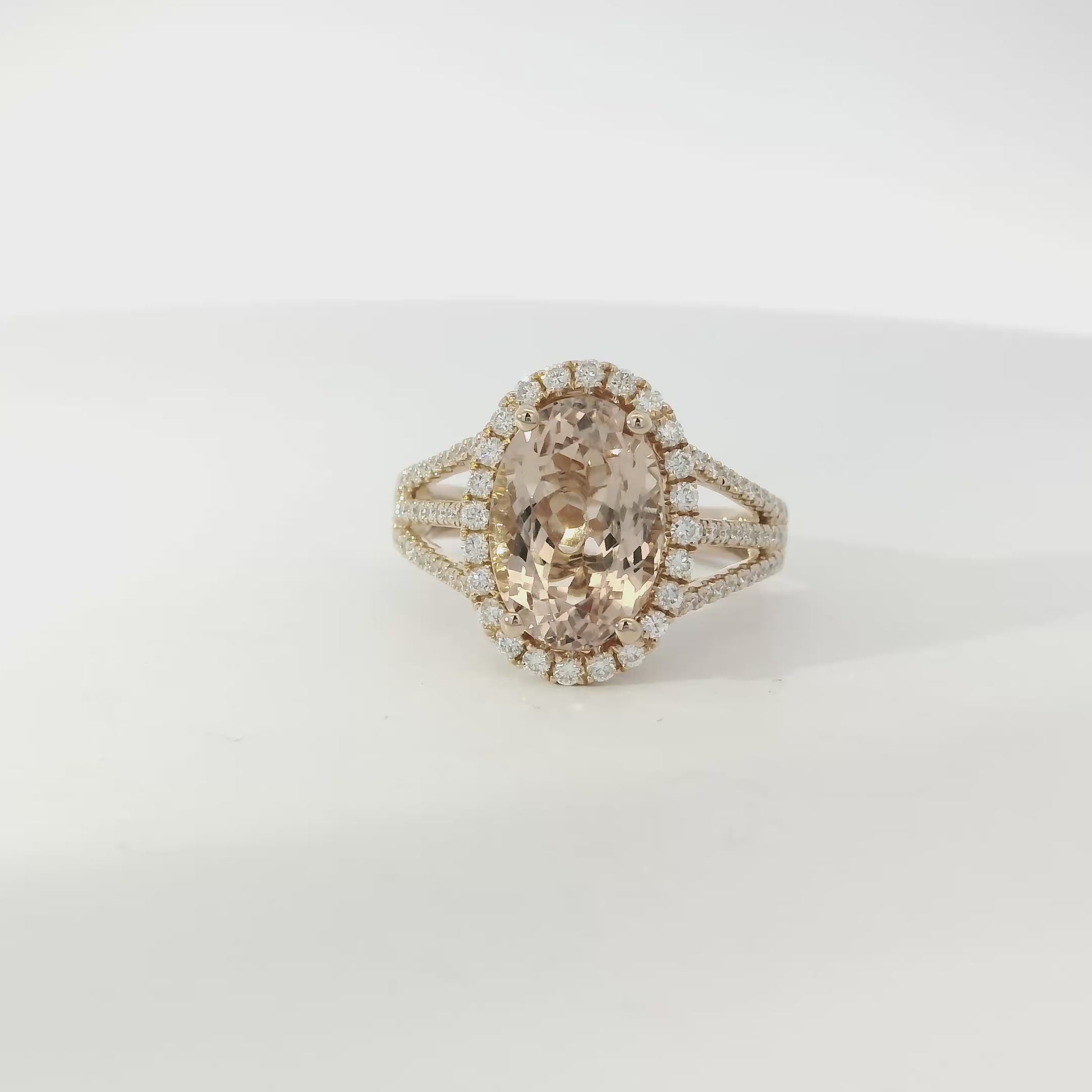 This ring features approximately 3.85ct carats of Oval Cut Morganite. The ring is accented by 0.57ctw Round Diamonds. |