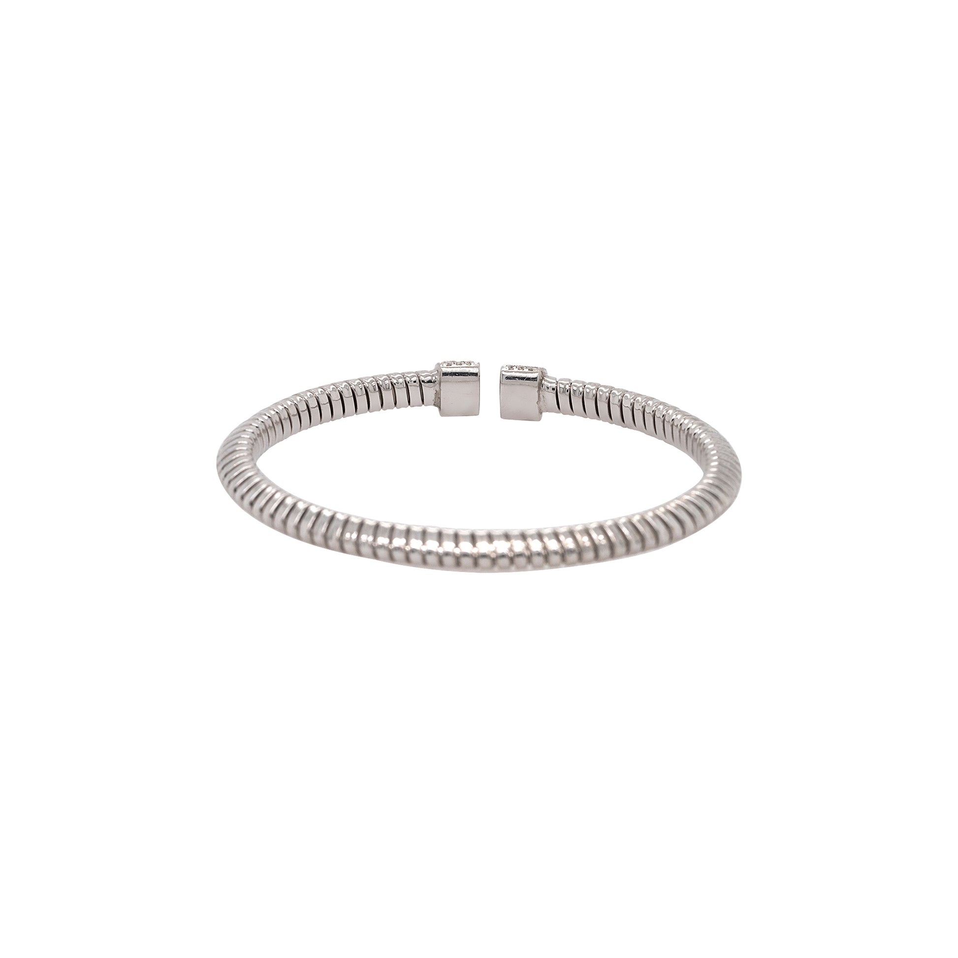 The bangle’s sleek ribbed profile adds a modern texture, making it a versatile piece for both solo wear and stacking with other bracelets. Crafted in high-polish white gold, it offers a luminous finish that elevates any outfit.