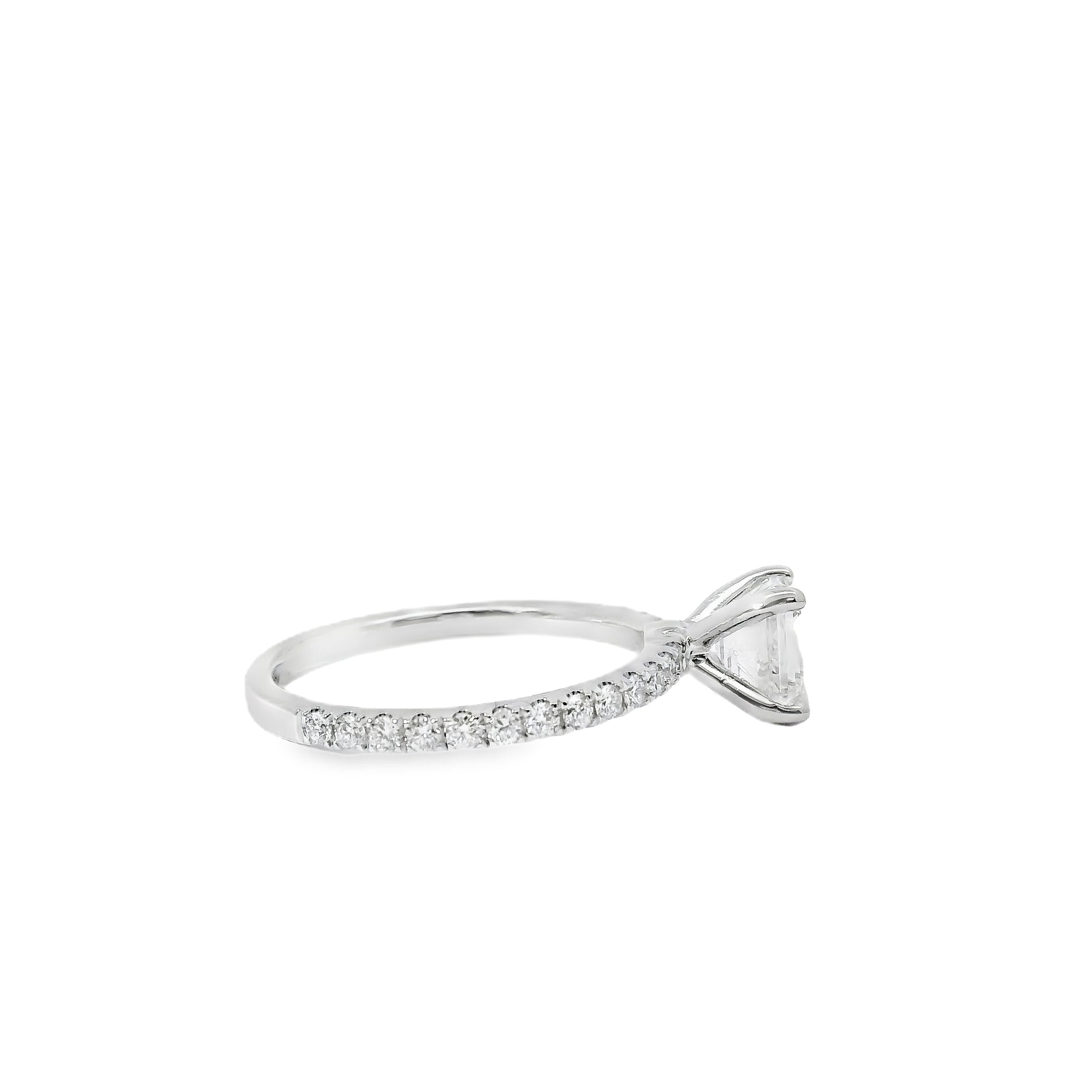 This elegant 18k white gold engagement ring showcases a captivating 1.15-carat round brilliant cut natural diamond, certified by GIA for exceptional quality. Graded K in color and VS2 in clarity, the center diamond displays remarkable brightness and fire, offering a timeless sparkle that catches the eye from every angle.