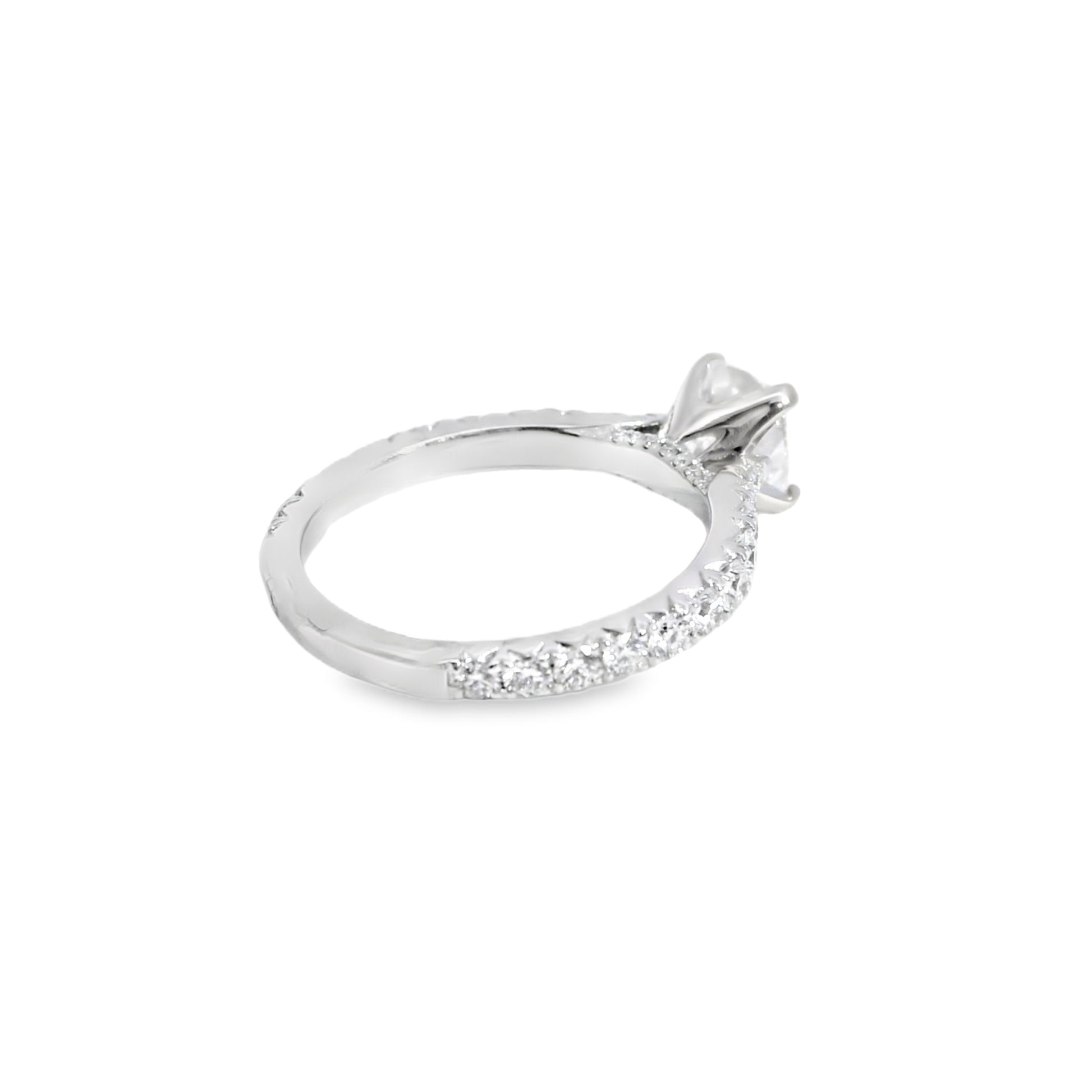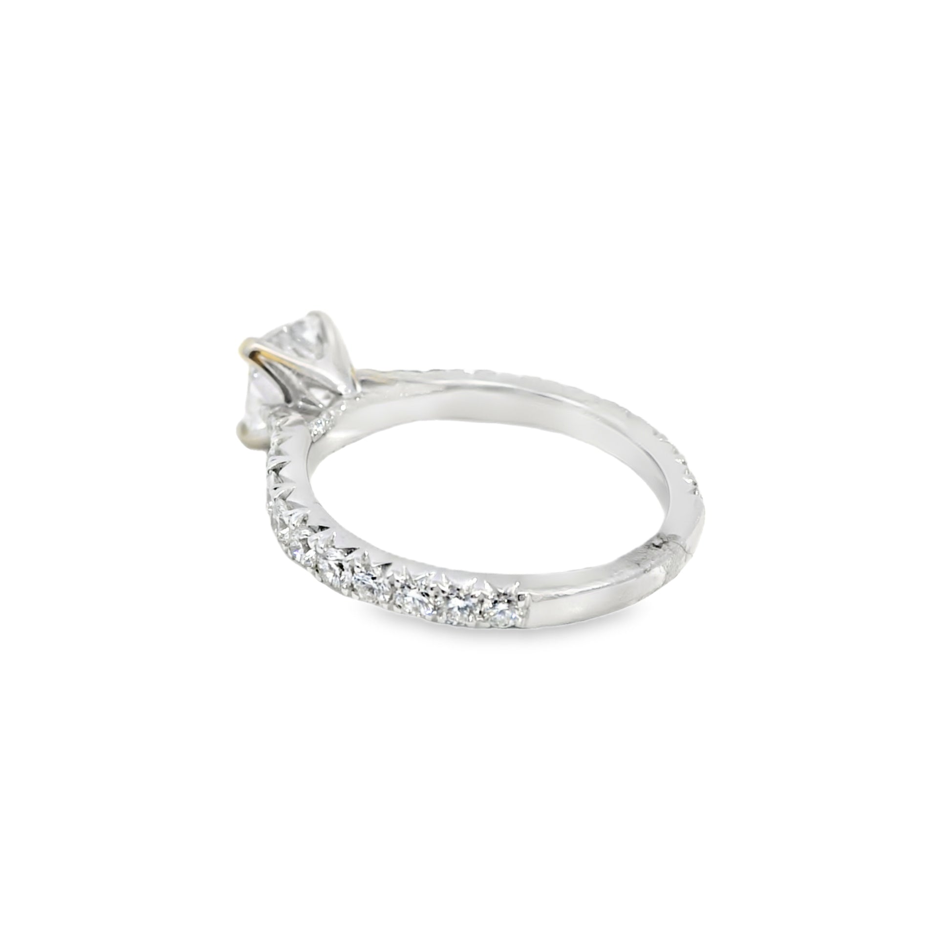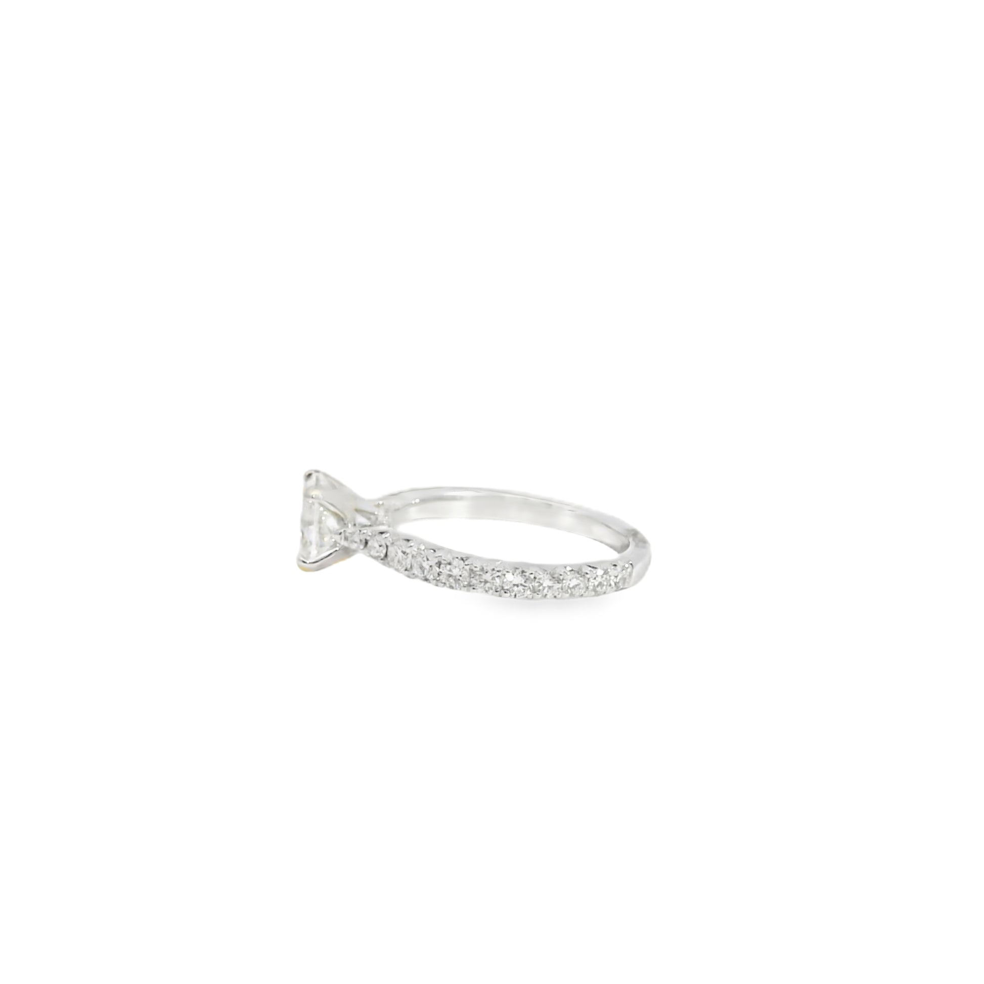 The luxurious 18k white gold band is adorned with approximately 0.79ctw of round cut natural diamonds, adding radiant sparkle and enhancing the presence of the center diamond. The refined design balances classic sophistication with modern elegance, making it a truly unforgettable piece.