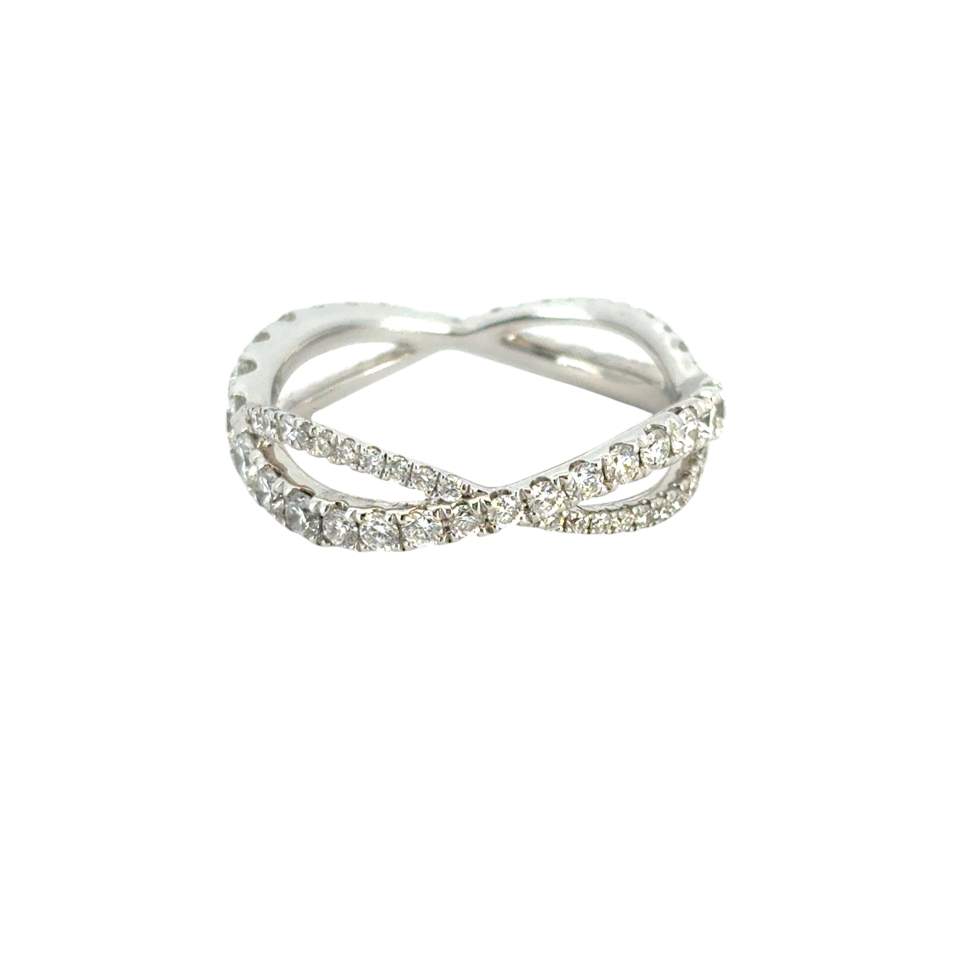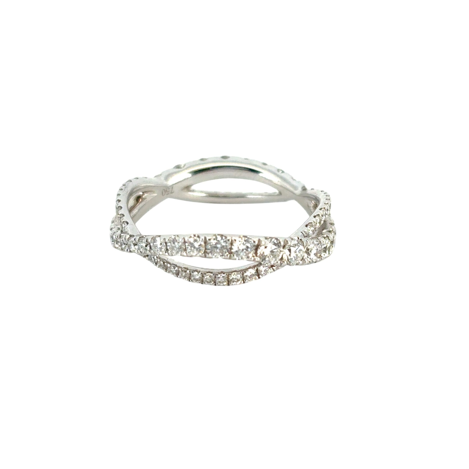 Crafted from luminous 18k white gold, this captivating band features a chic twisted design adorned with approximately 1.25 carats of shimmering diamonds that gracefully encircle the entire ring. The flowing twist adds dimension and sophistication, making it perfect as a standalone statement or a unique complement to a bridal stack.
