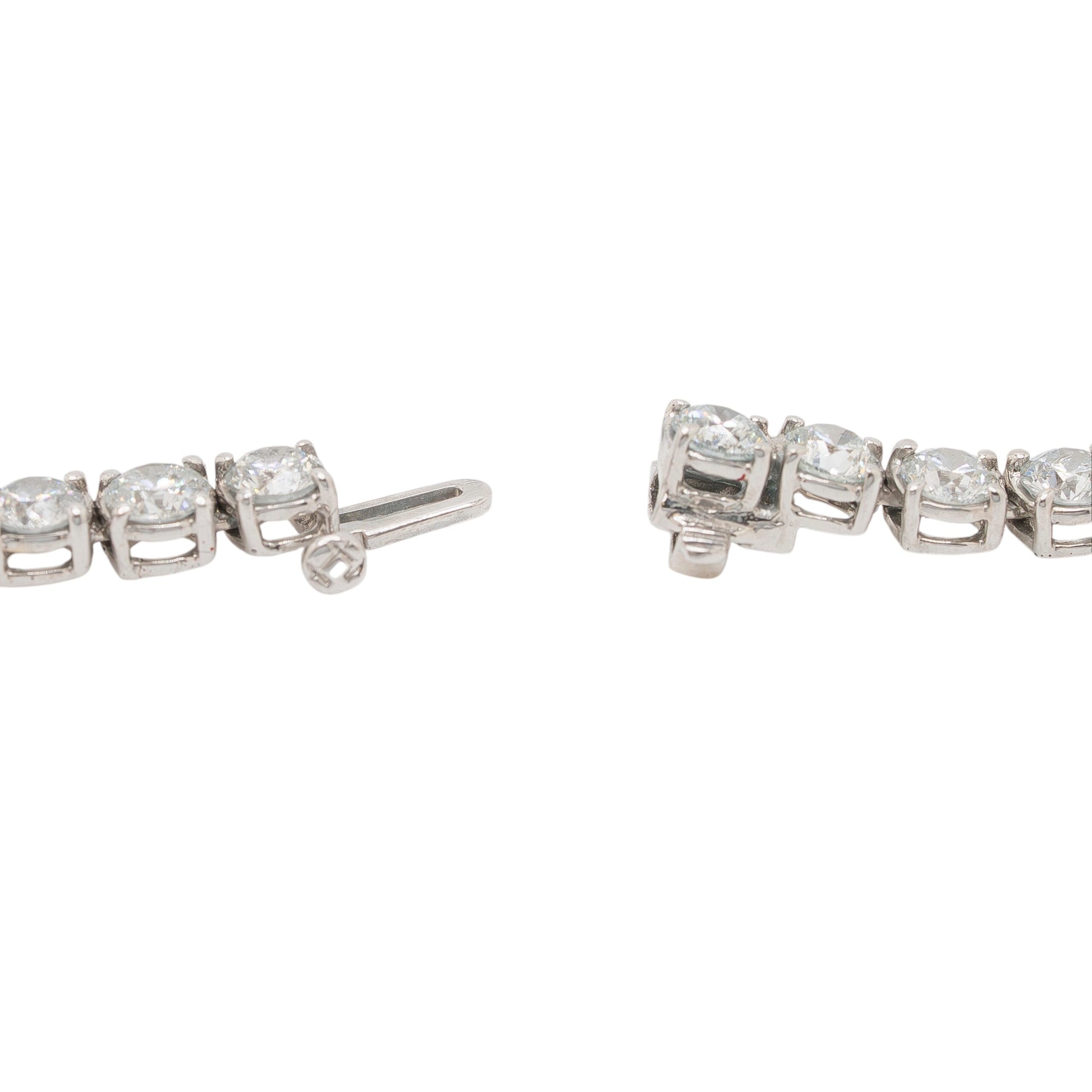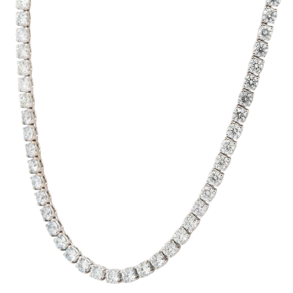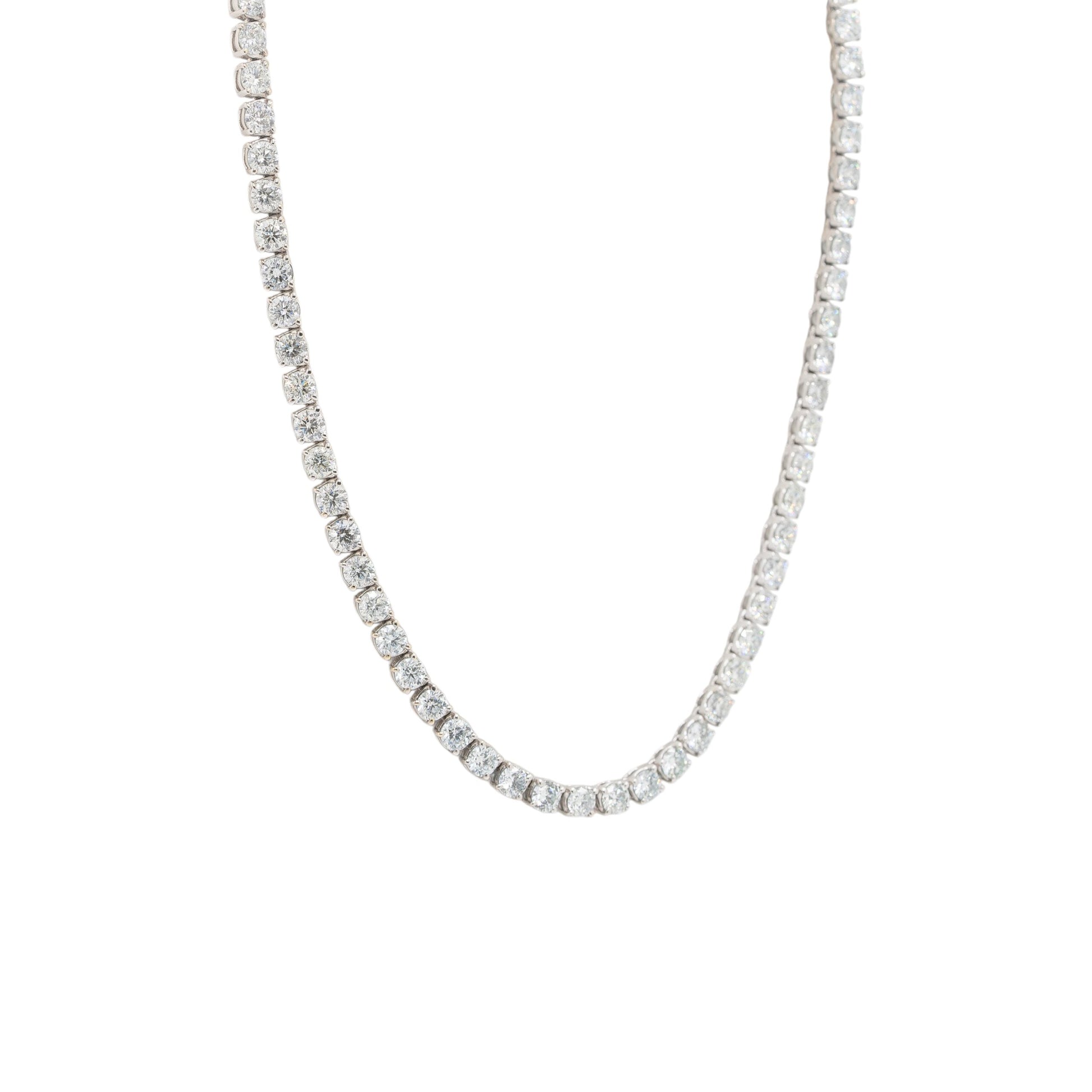 This 18k white gold tennis necklace is a show-stopping statement piece, featuring 78 round brilliant diamonds totaling approximately 24.20 carats.