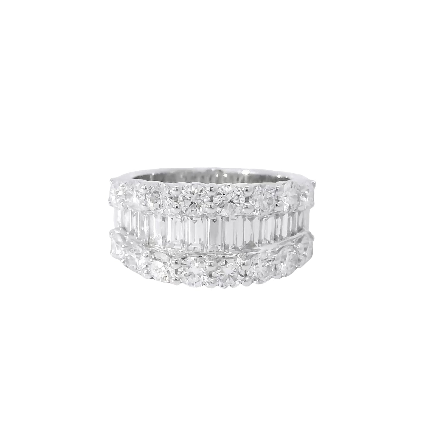 This elegant diamond ring is crafted in solid 18k white gold and showcases a sophisticated combination of natural round brilliant and emerald cut diamonds totaling approximately 3.25 carats. The ring is in excellent condition and ready to ship, making it a timeless addition to any fine jewelry collection.