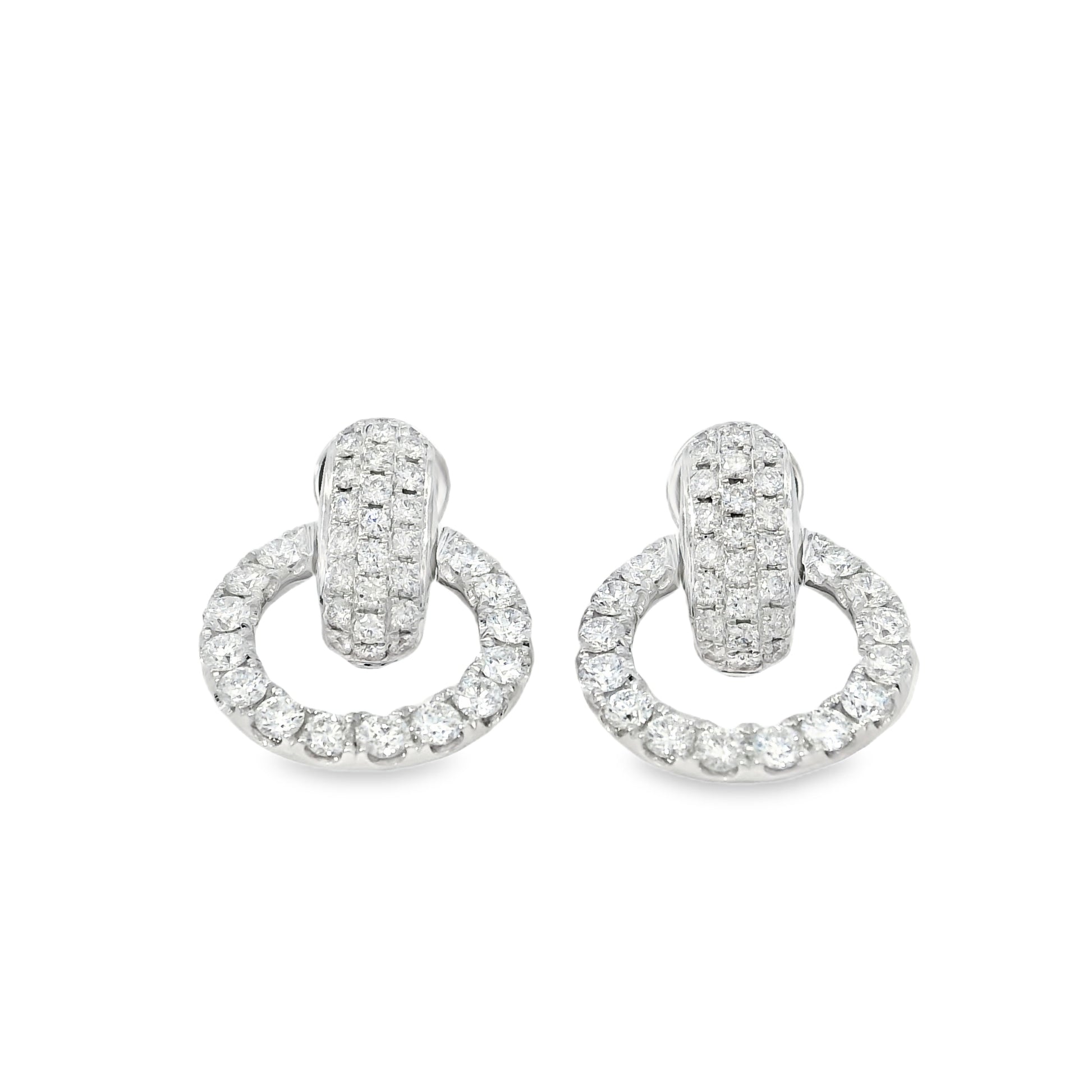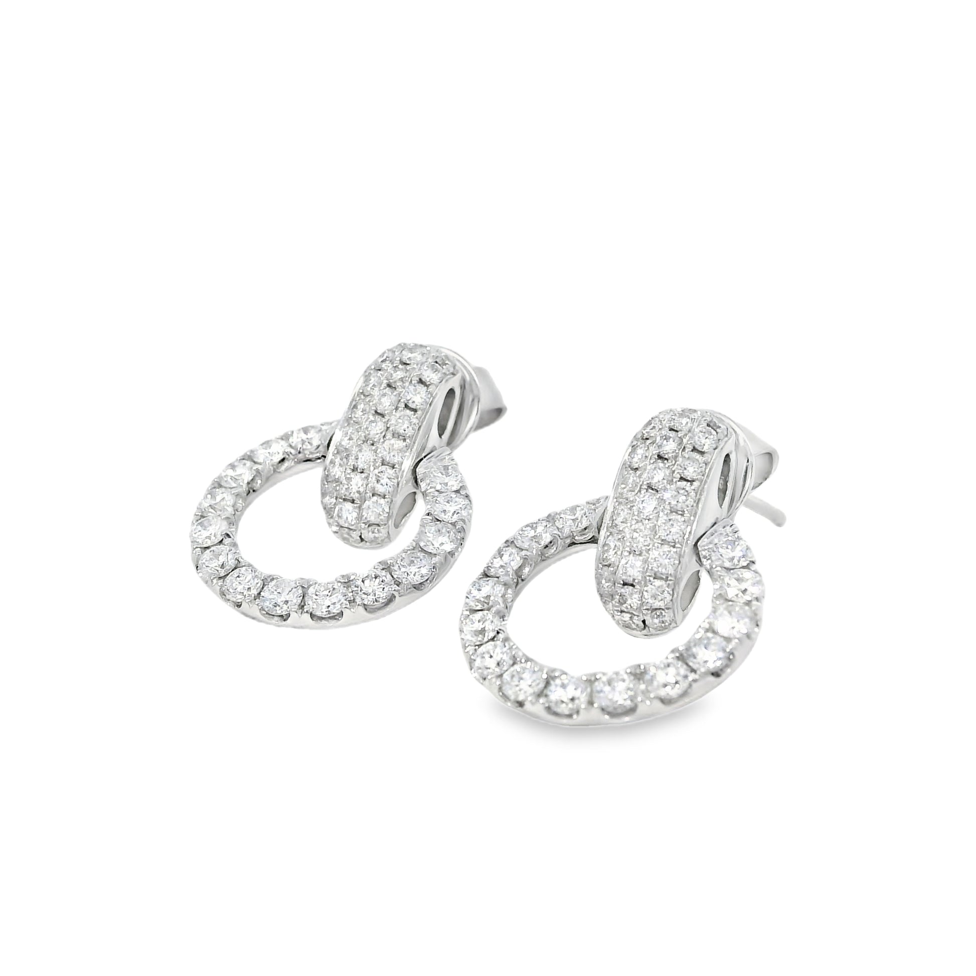 The earrings are set with approximately 6.10 carats total weight of pavé set round brilliant cut natural diamonds. Each diamond is carefully placed to create a continuous surface of brilliance across the interlocking circles, allowing light to reflect from every angle. The pavé setting enhances the luxurious appearance while maintaining a refined and fluid silhouette.